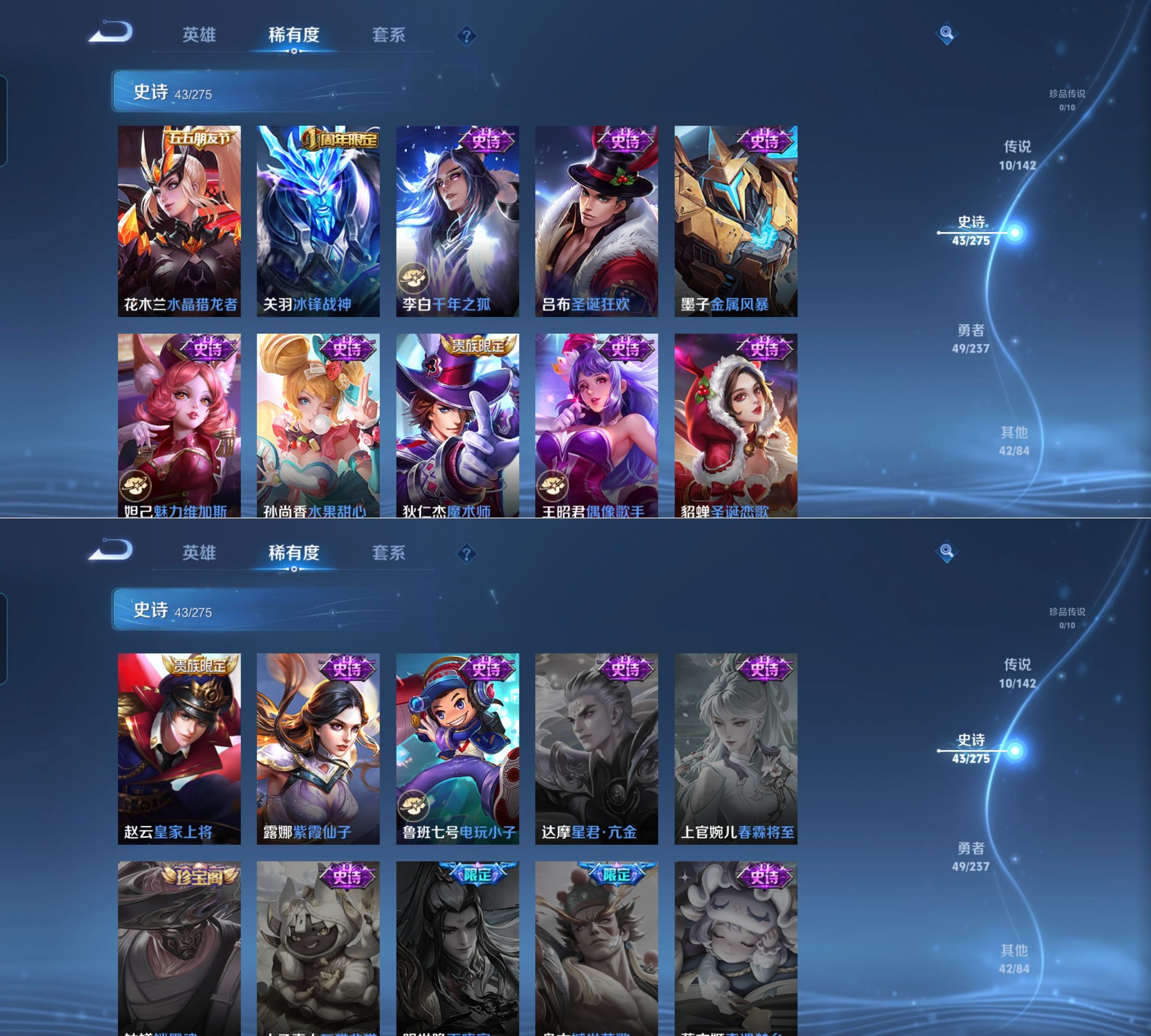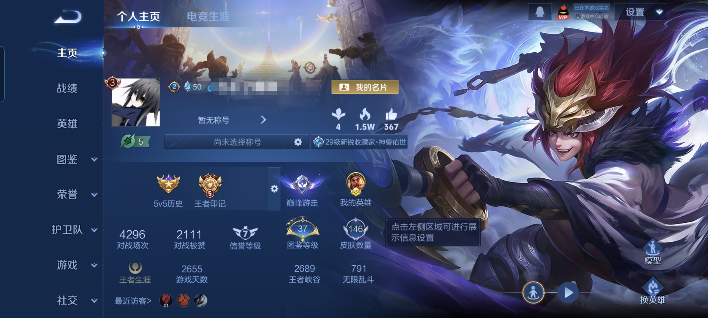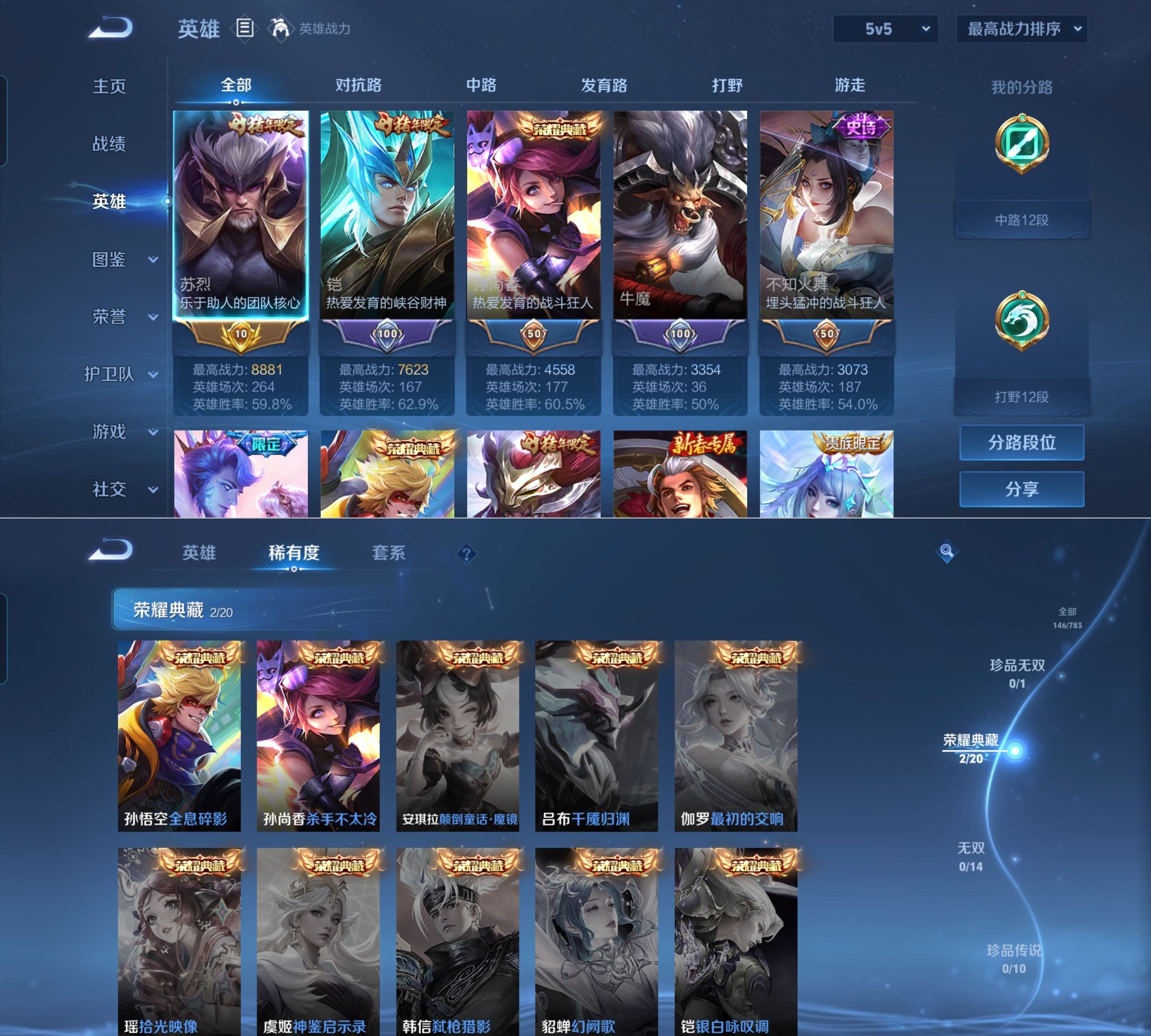 贵族等级:v8皮肤数:146情人节限定2 传说品质10 生肖限定6 荣耀典藏2 英雄数:128