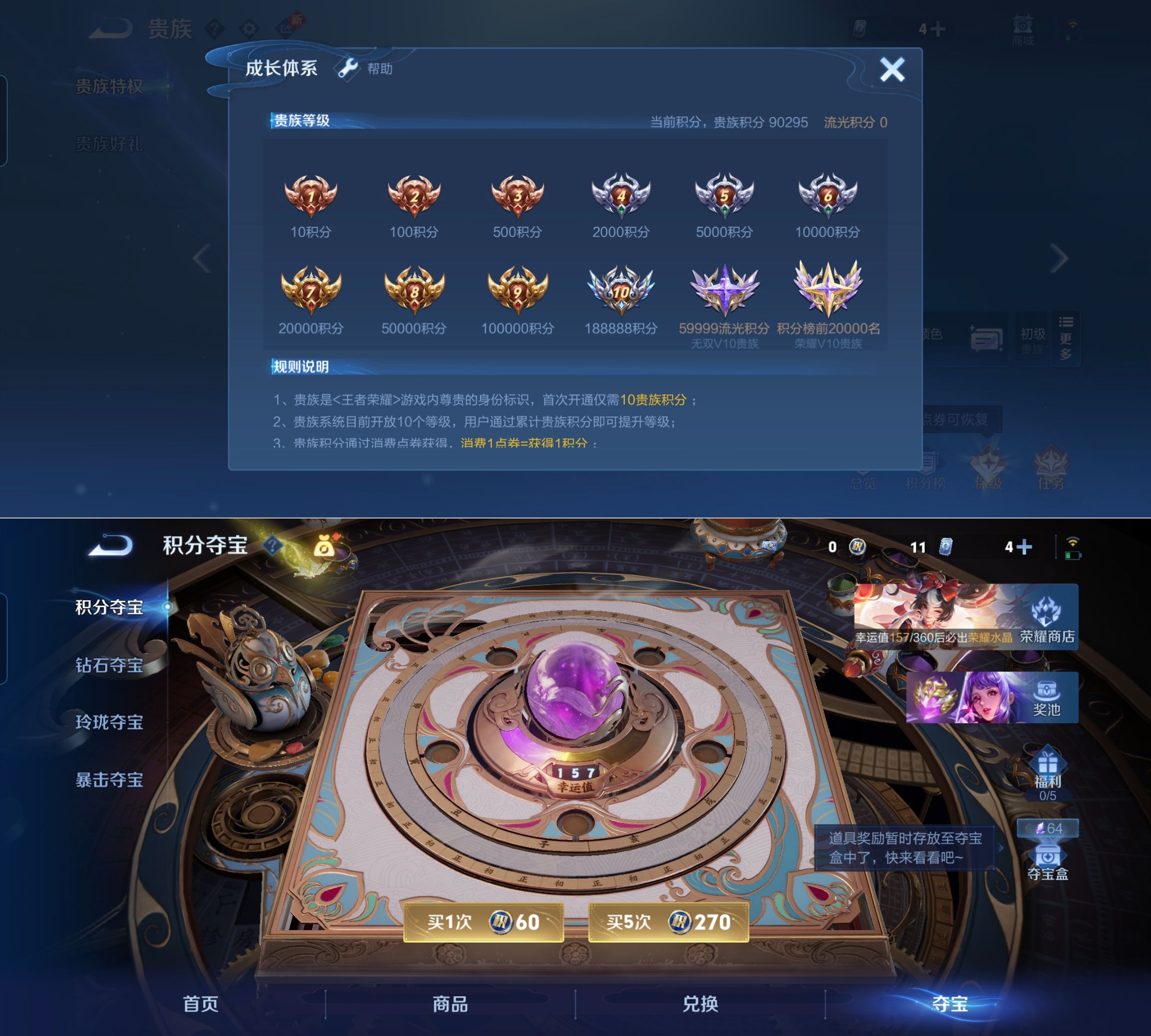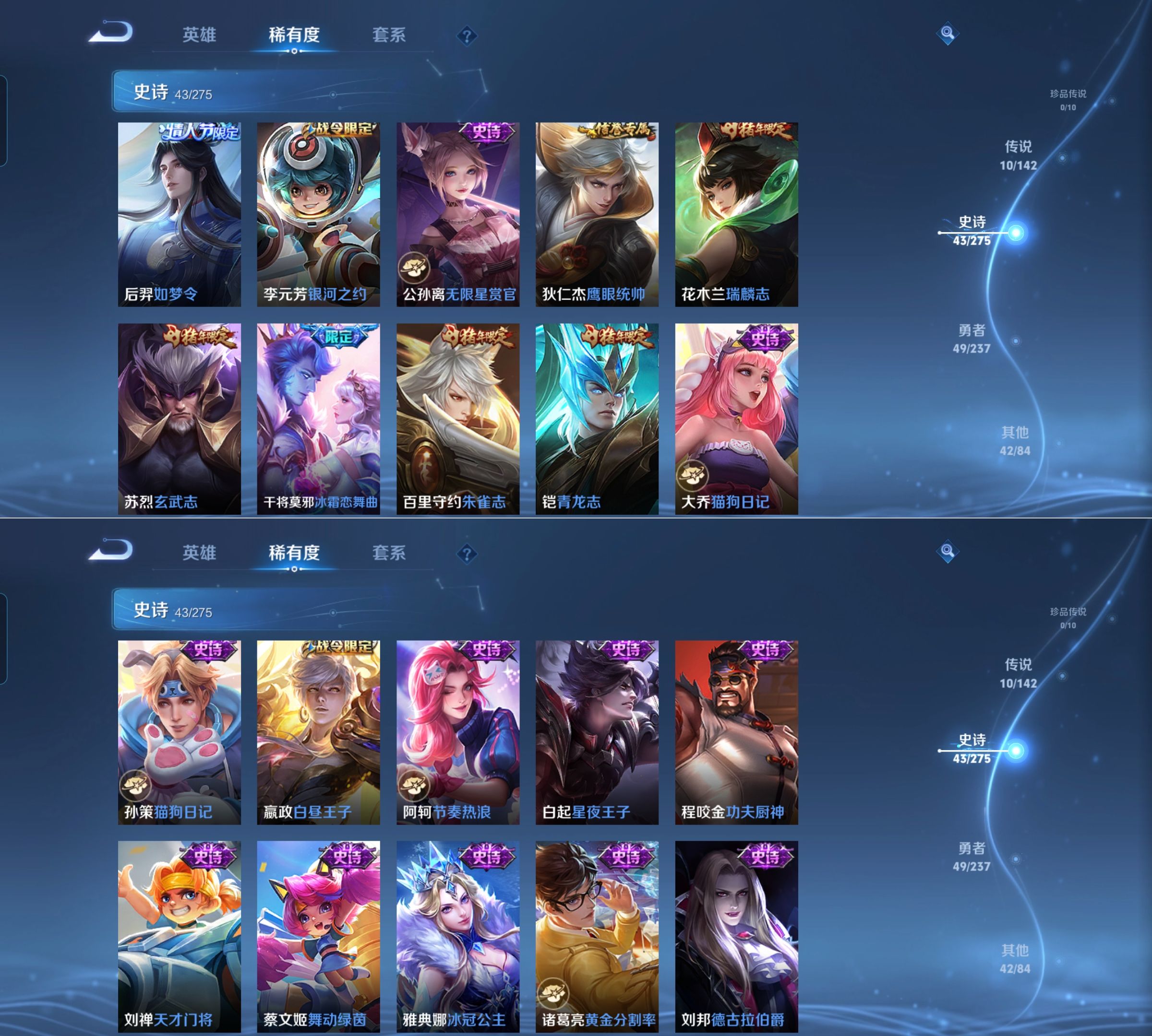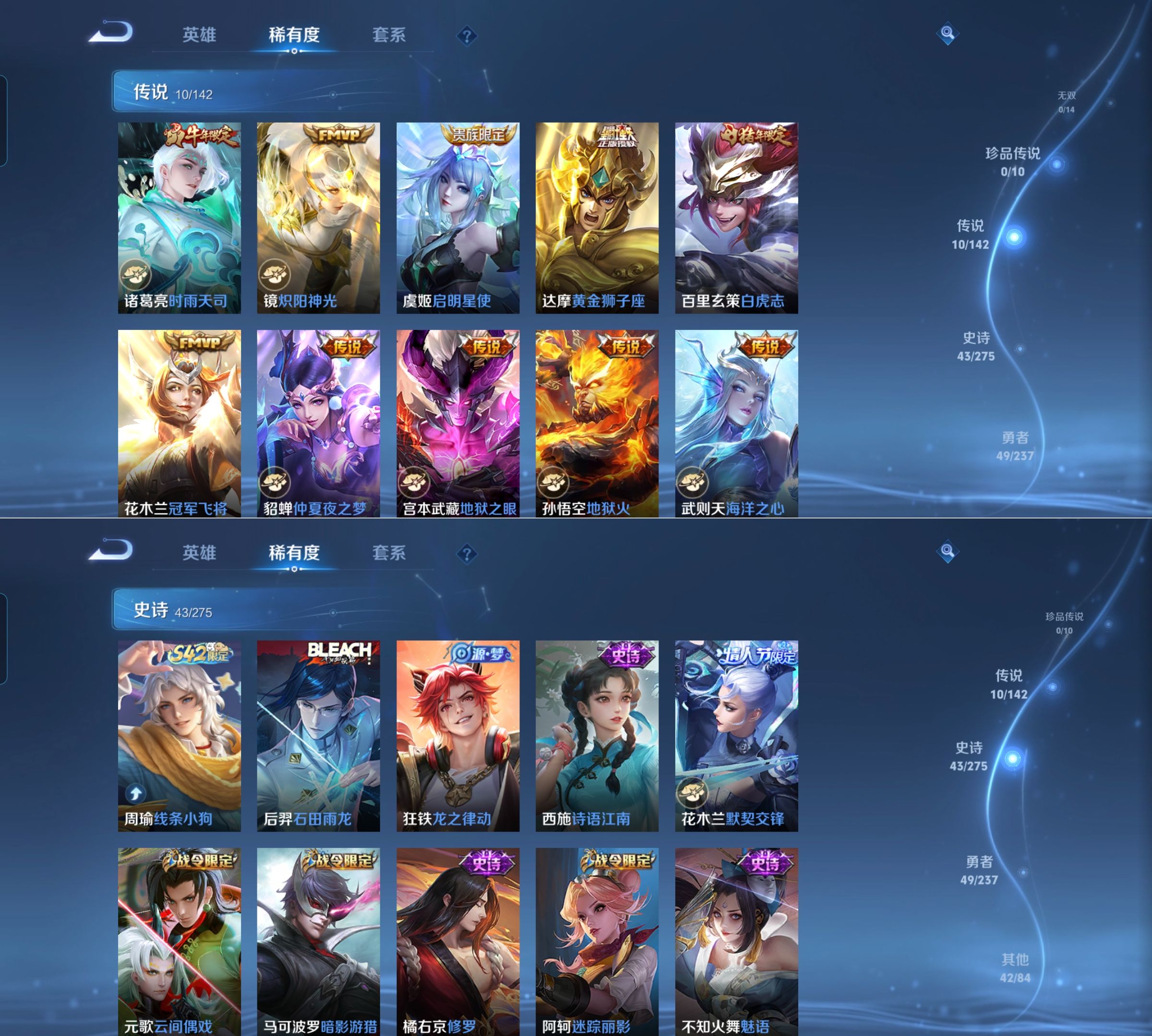 贵族等级:v8皮肤数:146情人节限定2 传说品质10 生肖限定6 荣耀典藏2 英雄数:128