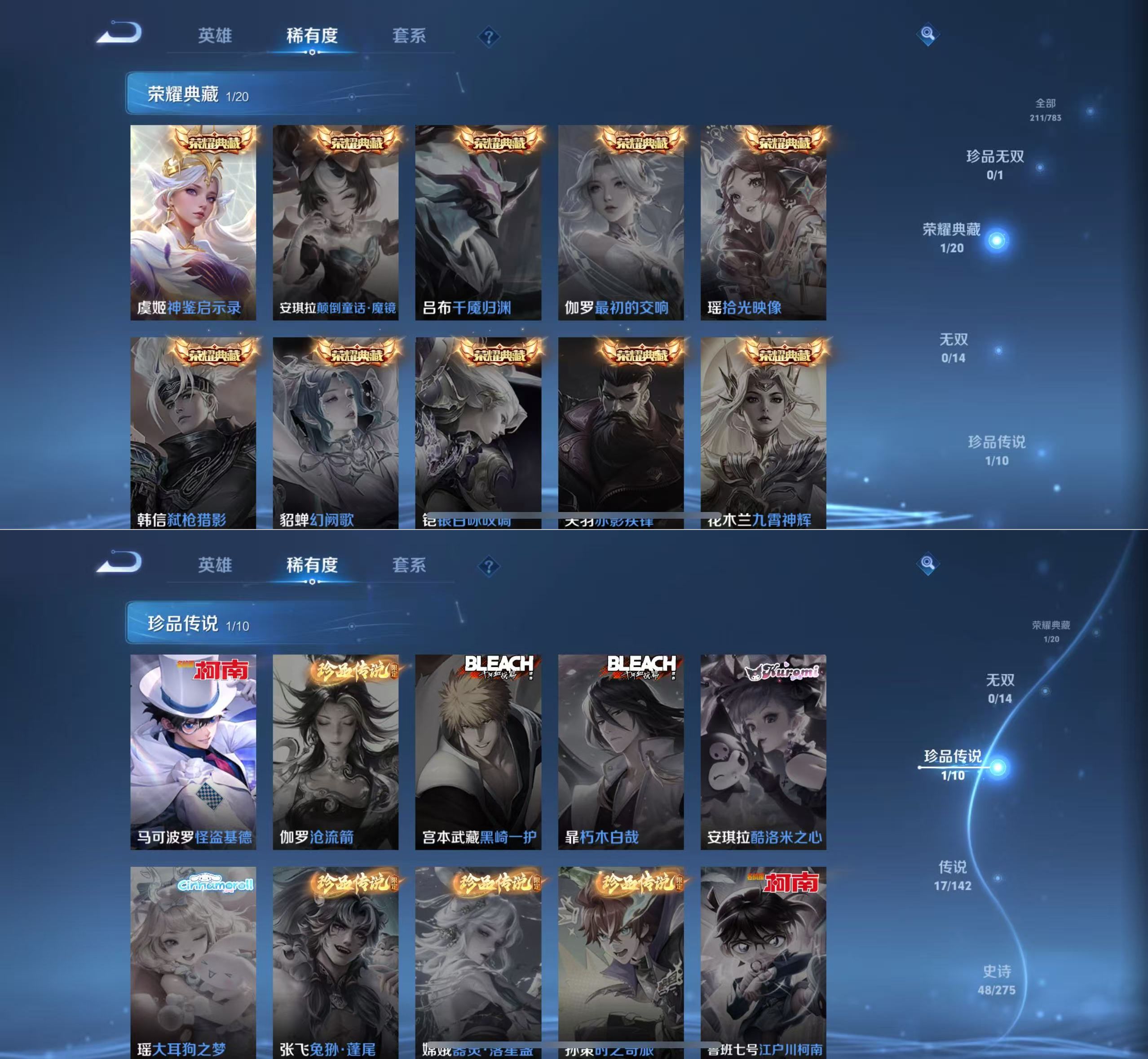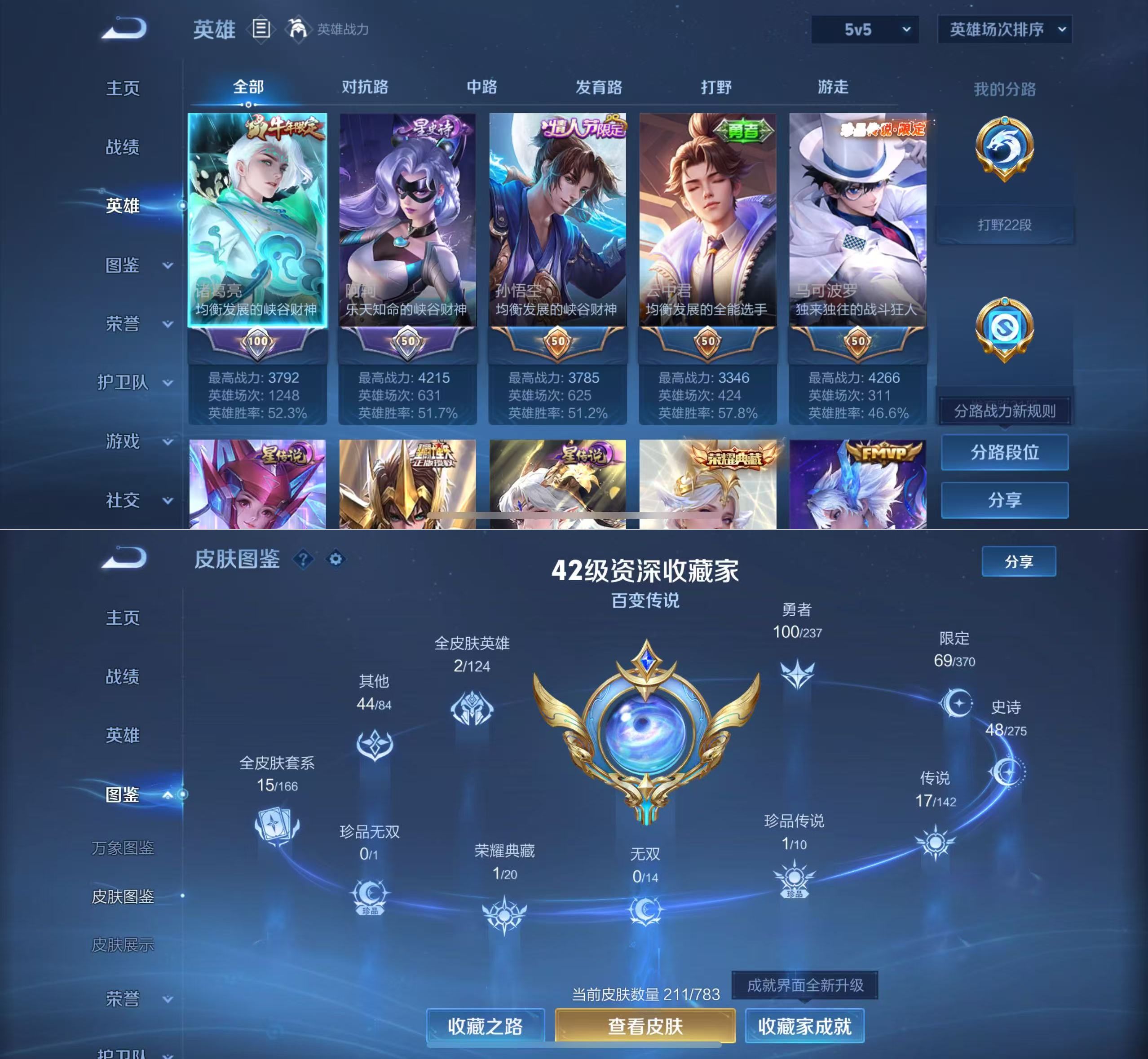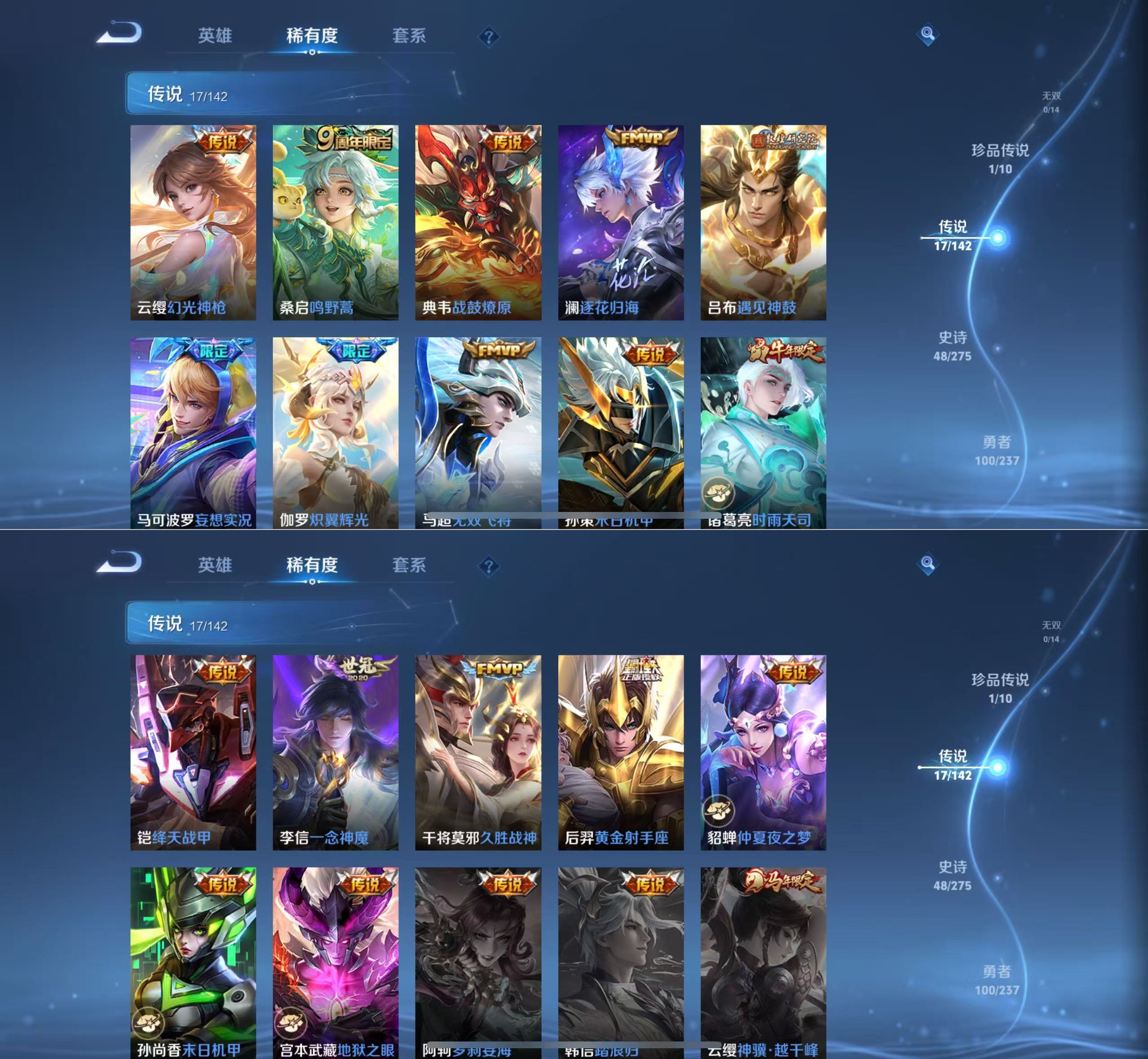 贵族等级:v7皮肤数:212传说品质17 生肖限定1 情人节限定1 珍品传说1 荣耀典藏1 英雄数:127