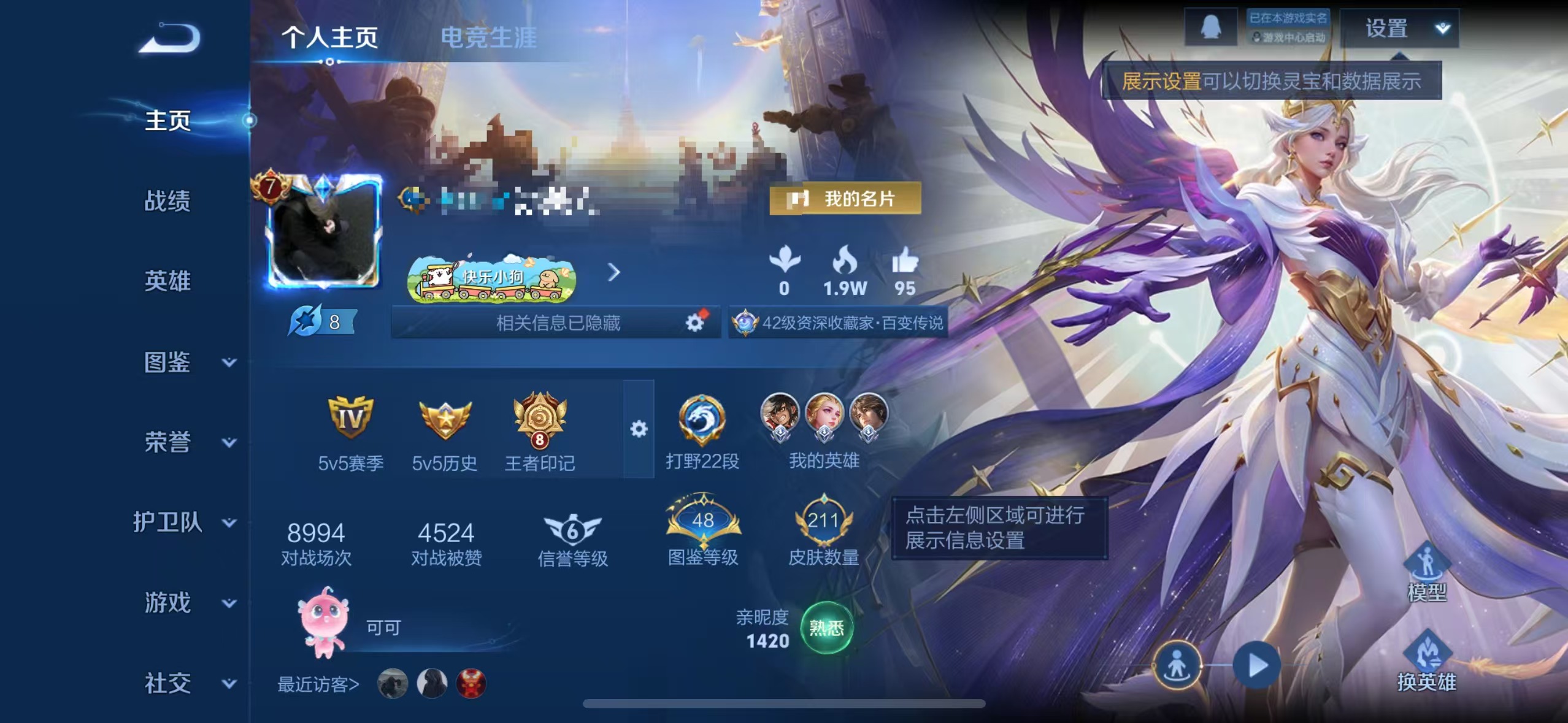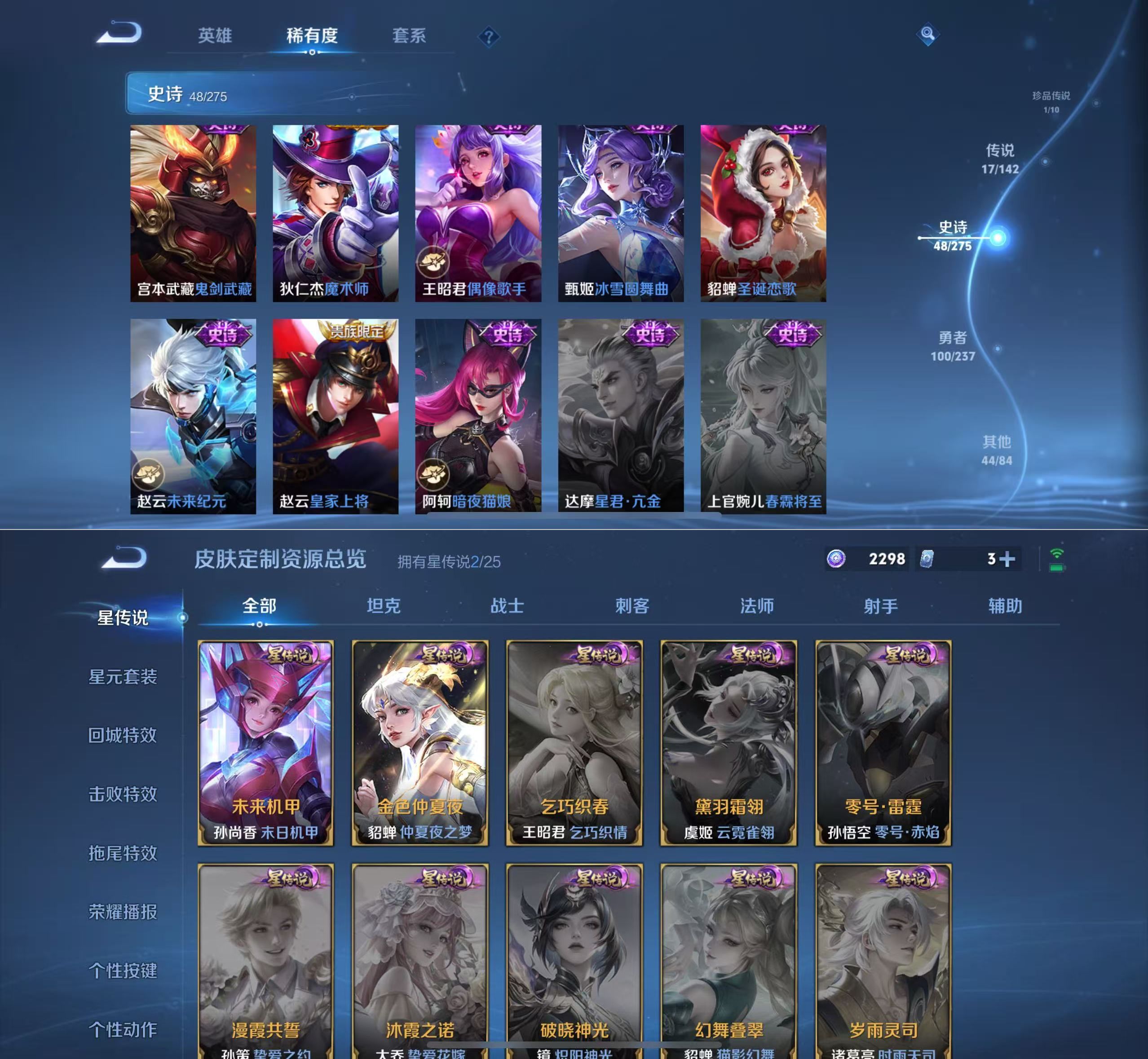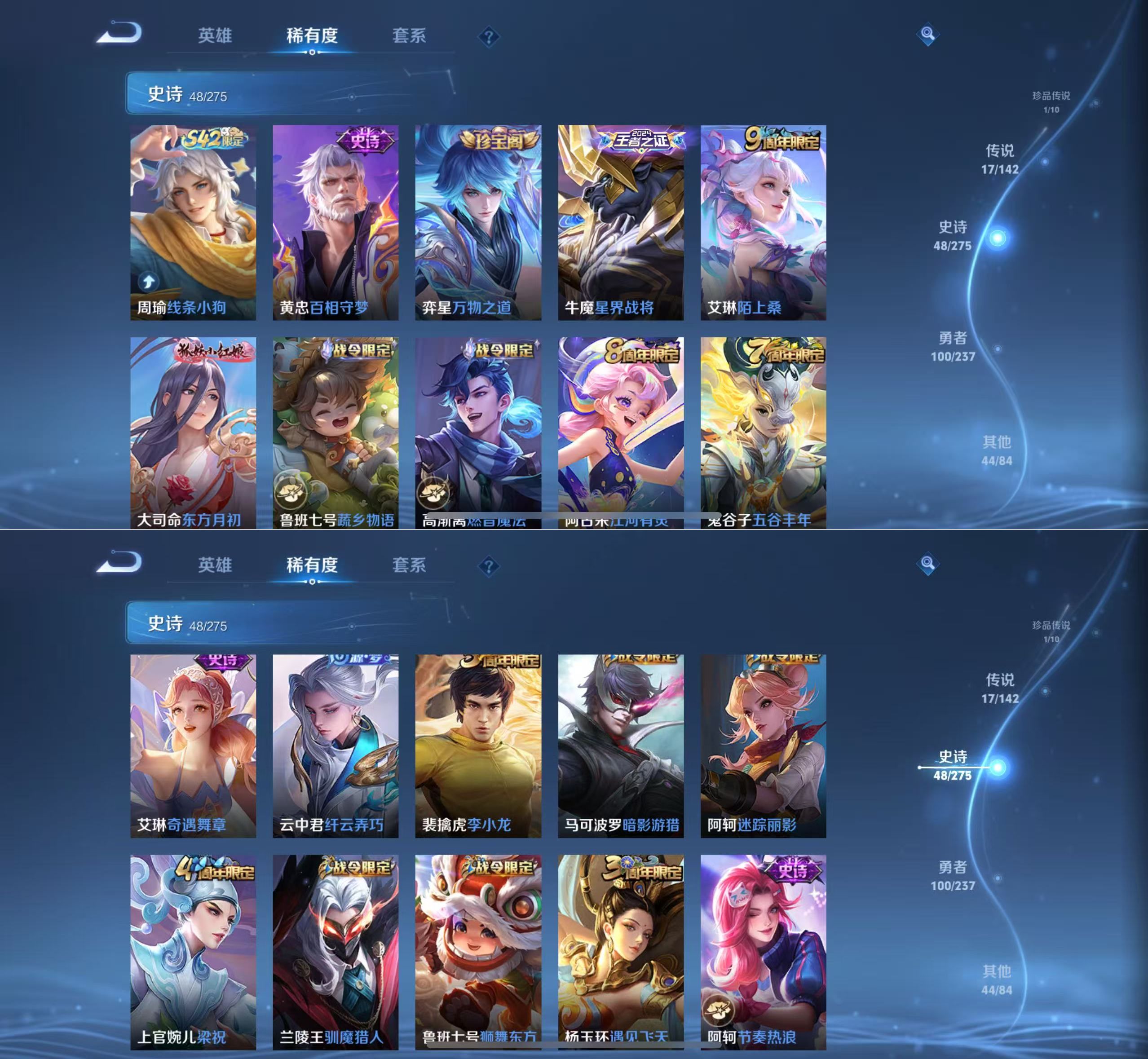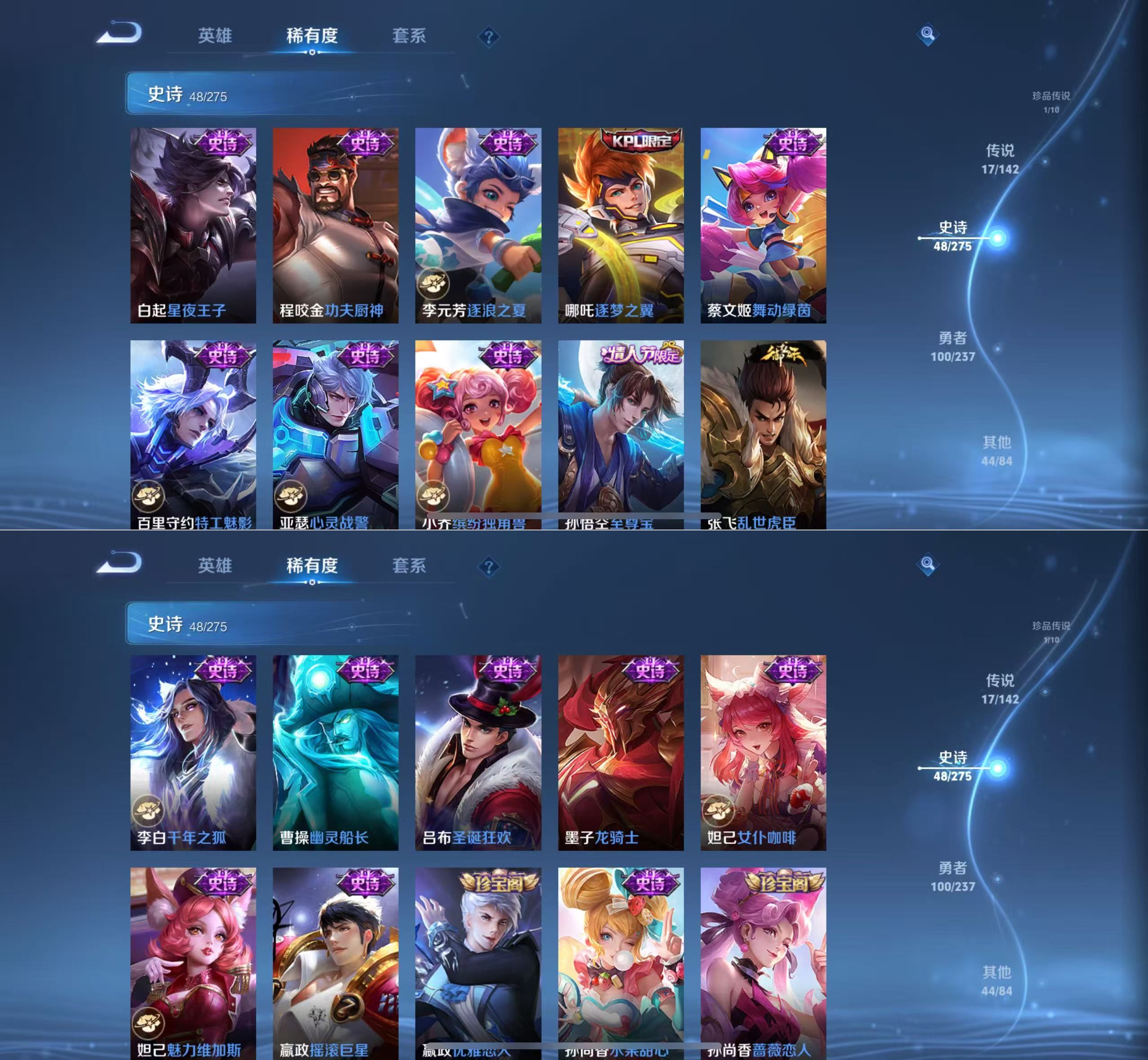 贵族等级:v7皮肤数:212传说品质17 生肖限定1 情人节限定1 珍品传说1 荣耀典藏1 英雄数:127