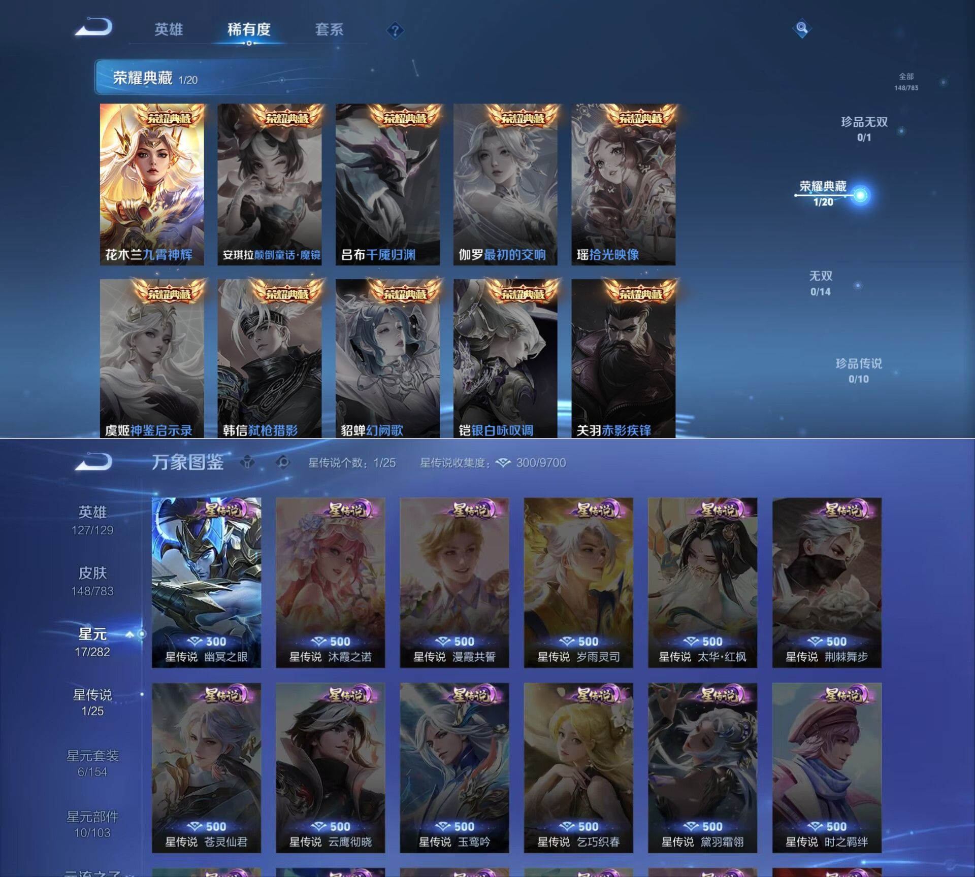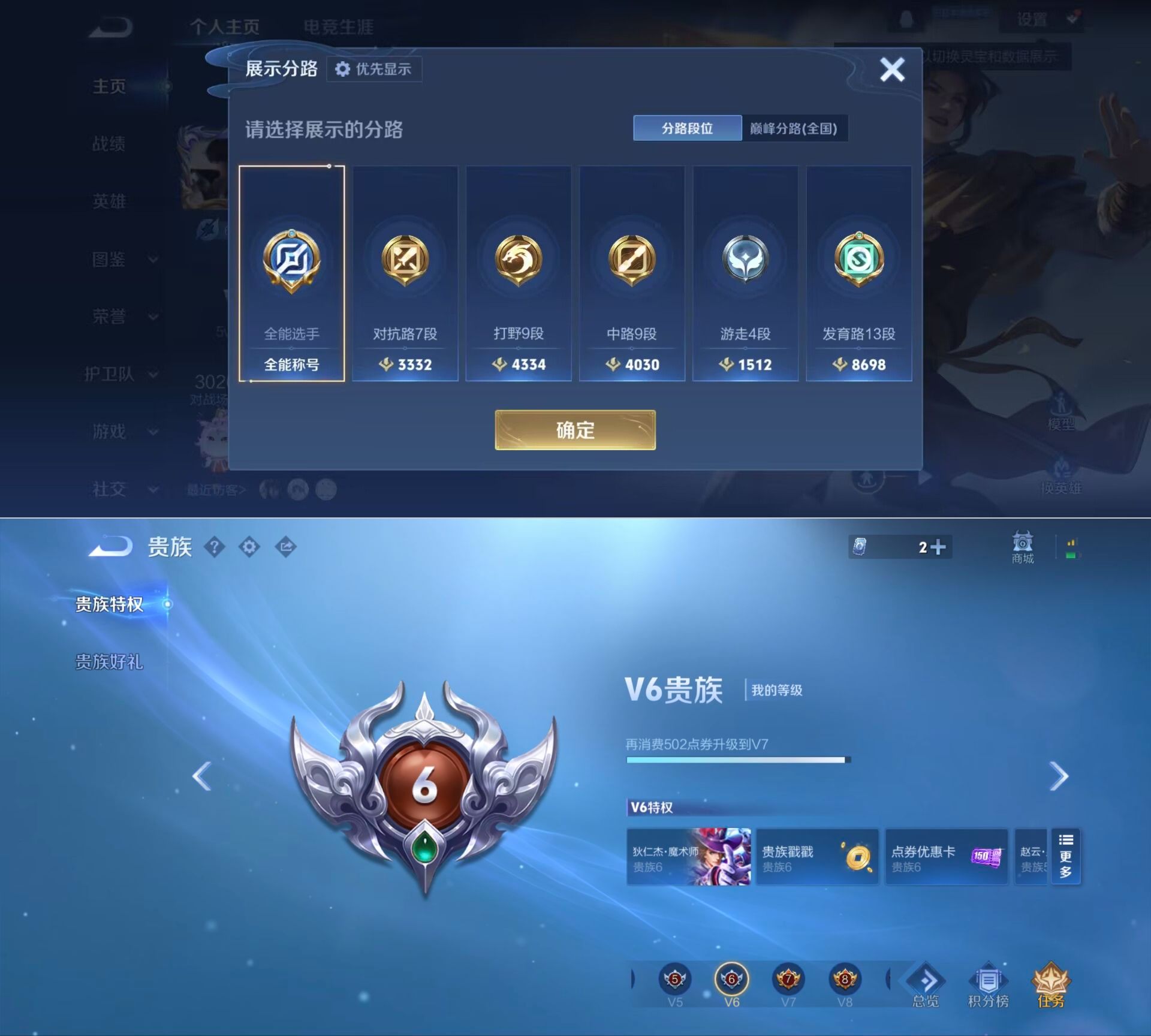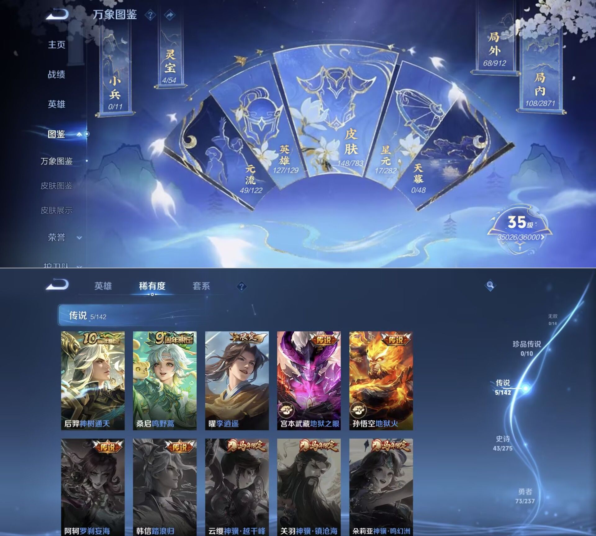 贵族等级:v6皮肤数:148传说品质5 荣耀典藏1 英雄数:127
