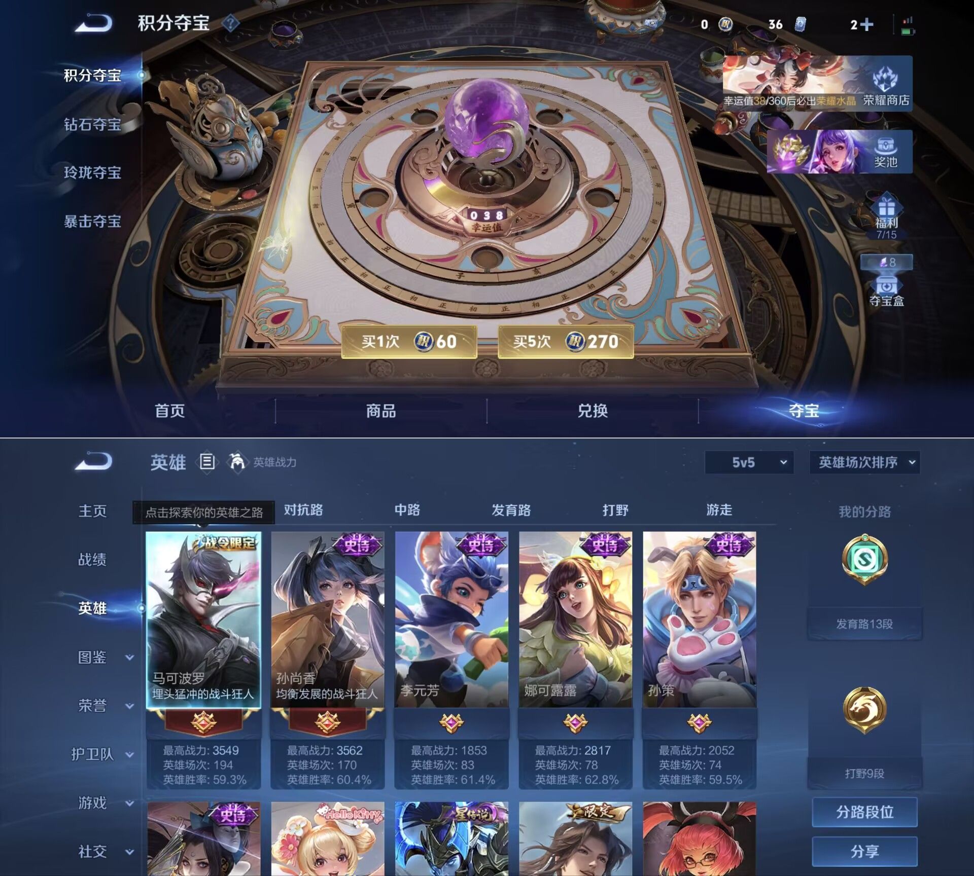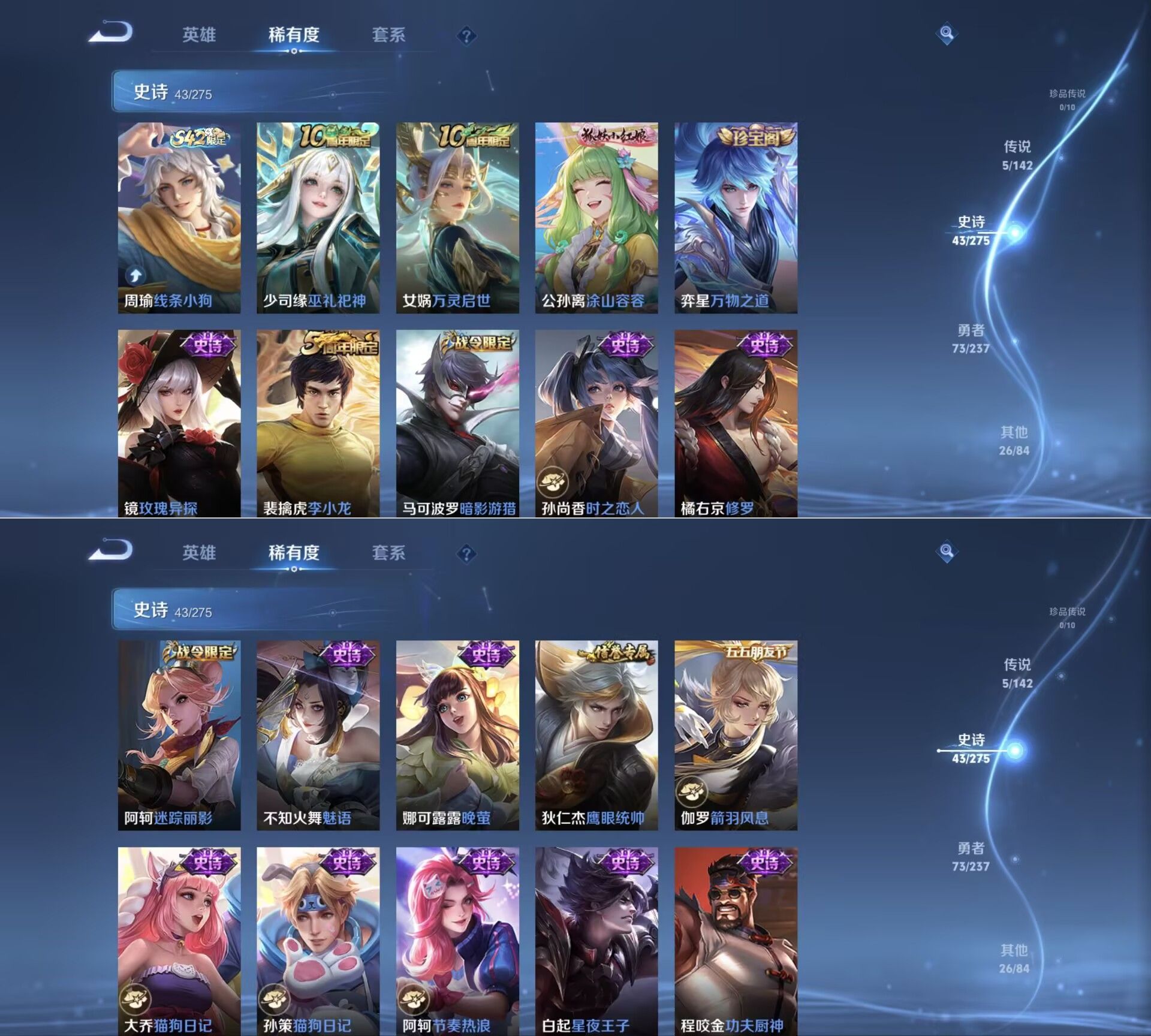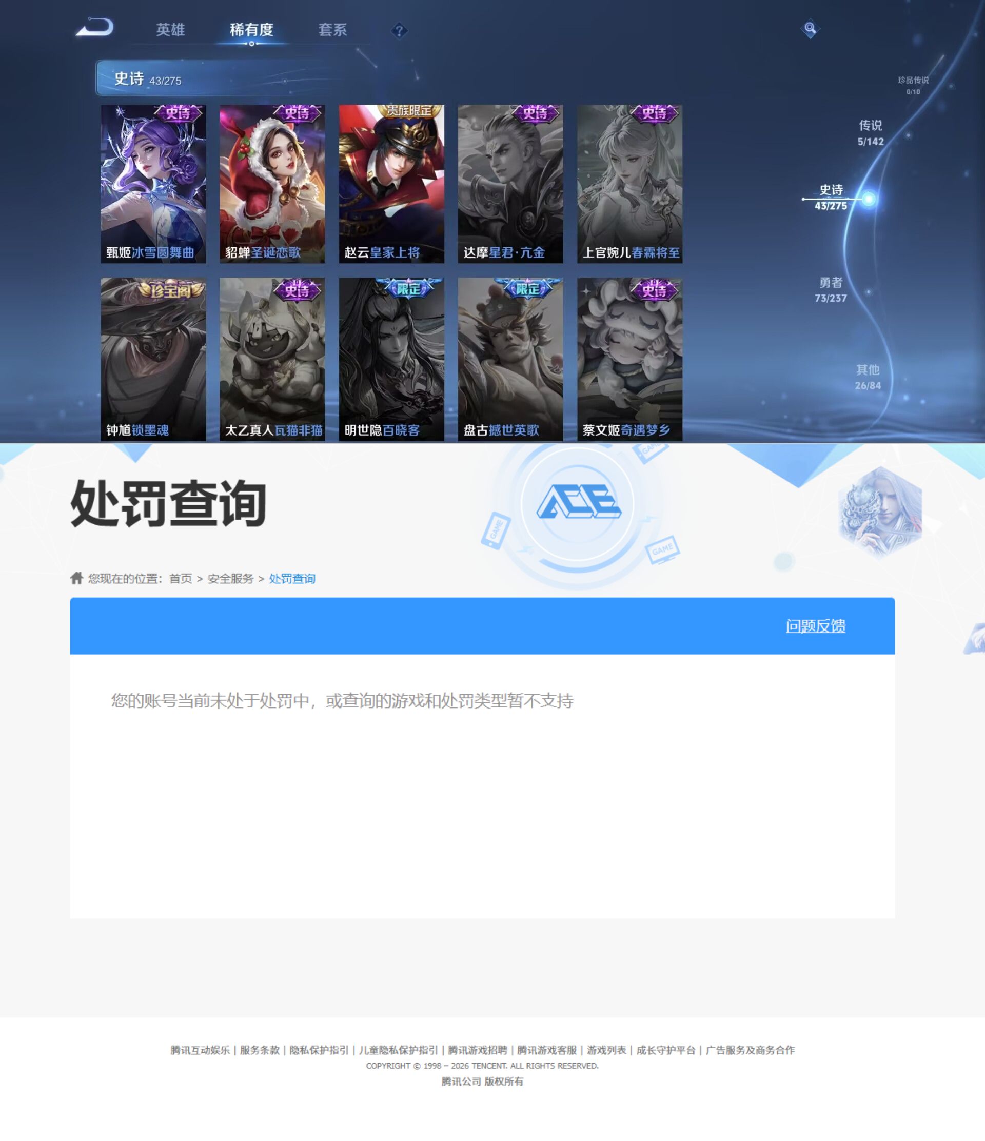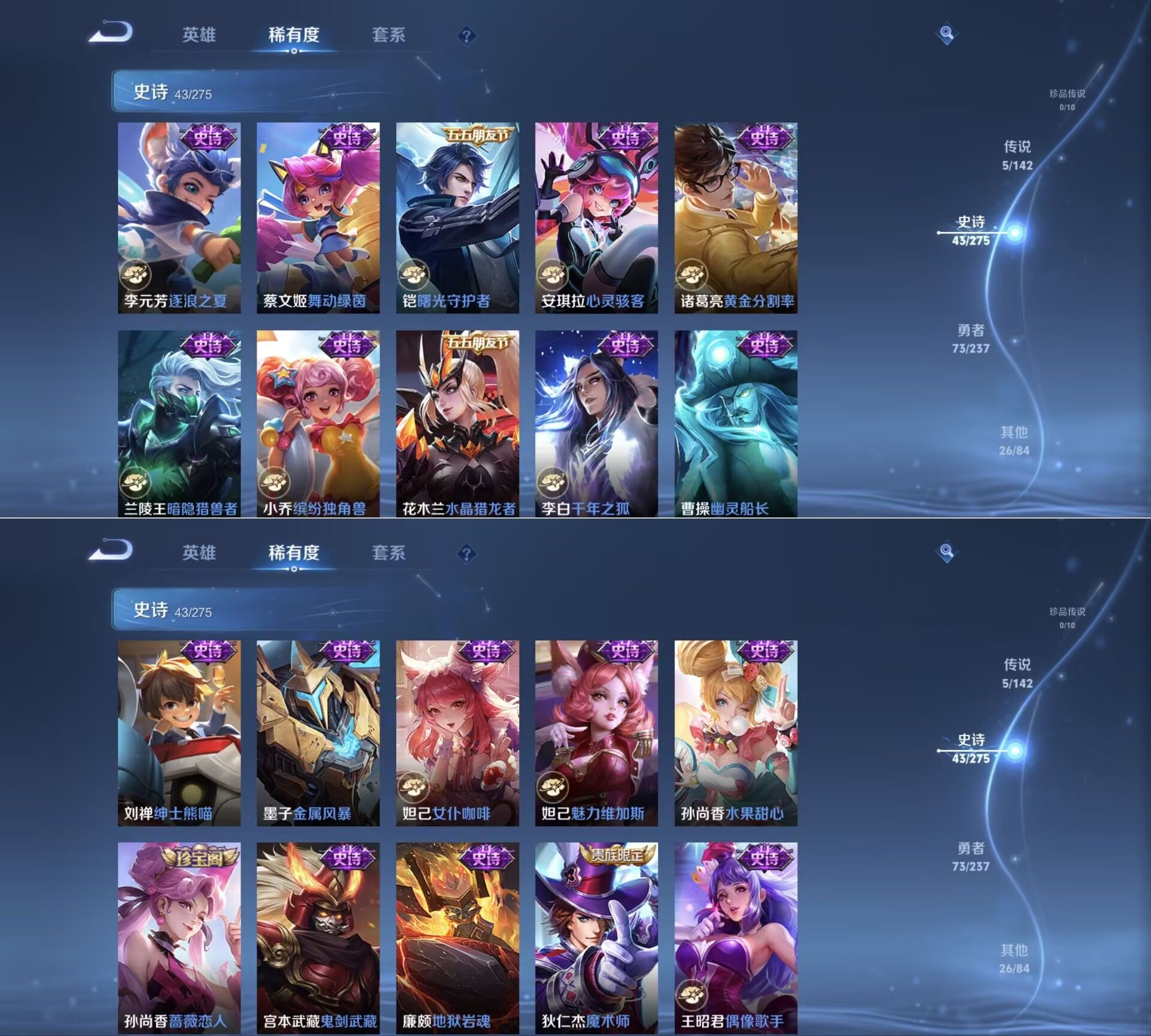 贵族等级:v6皮肤数:148传说品质5 荣耀典藏1 英雄数:127