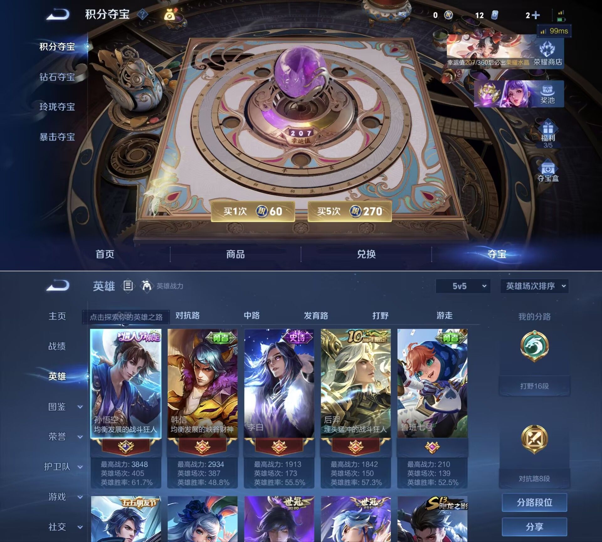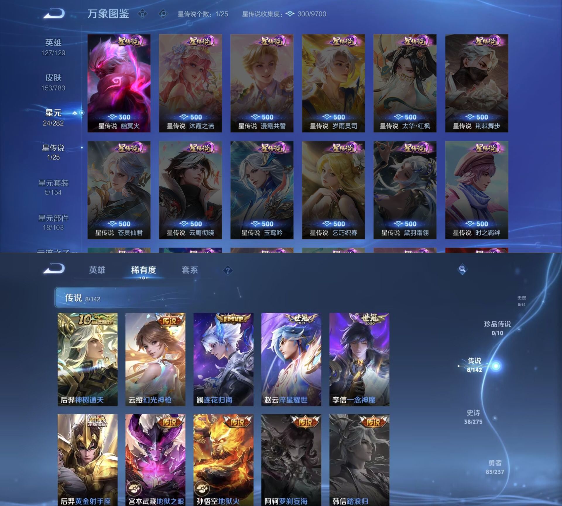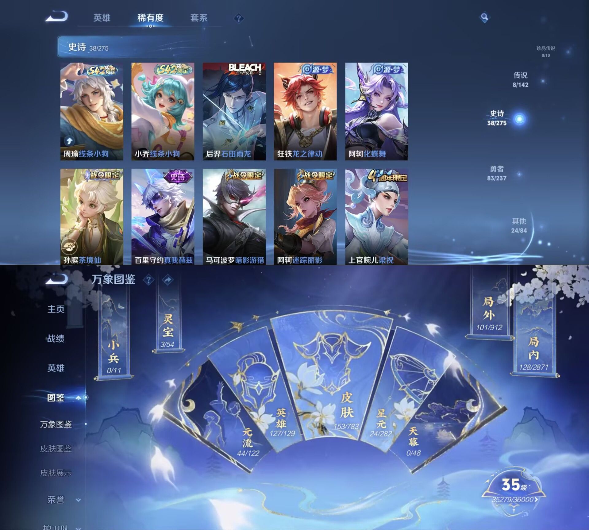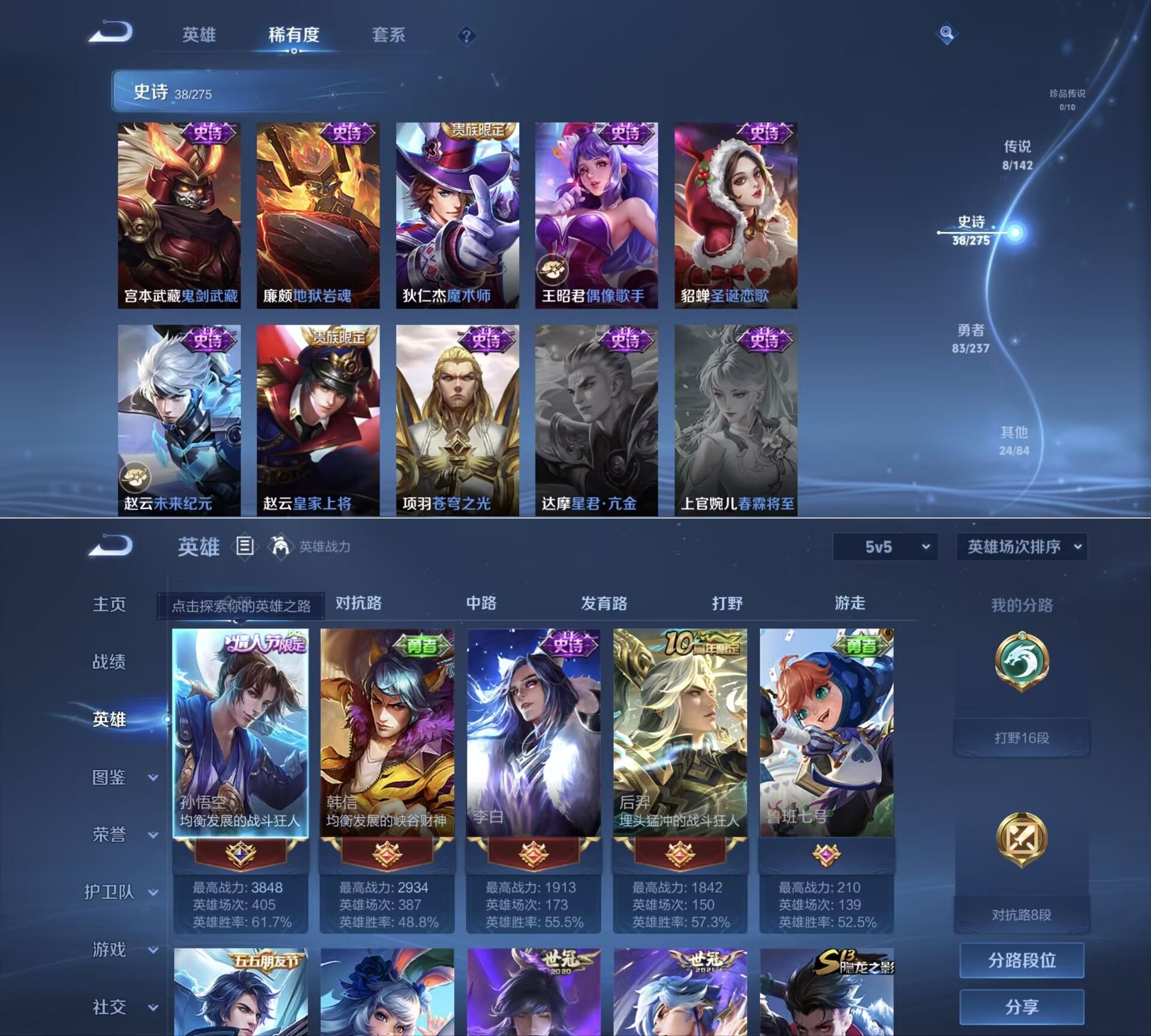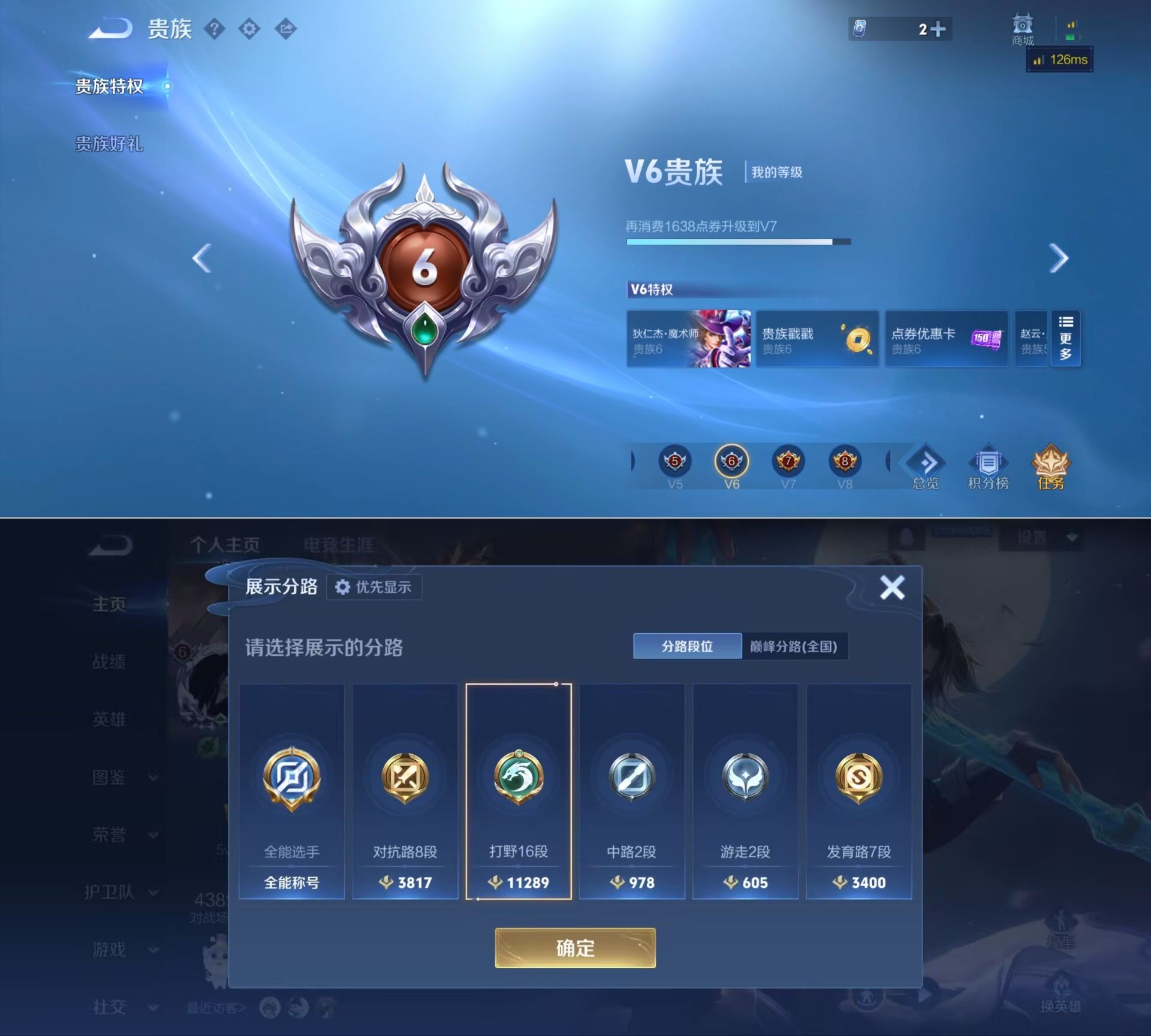 贵族等级:v6皮肤数:153传说品质8 情人节限定1 英雄数:127