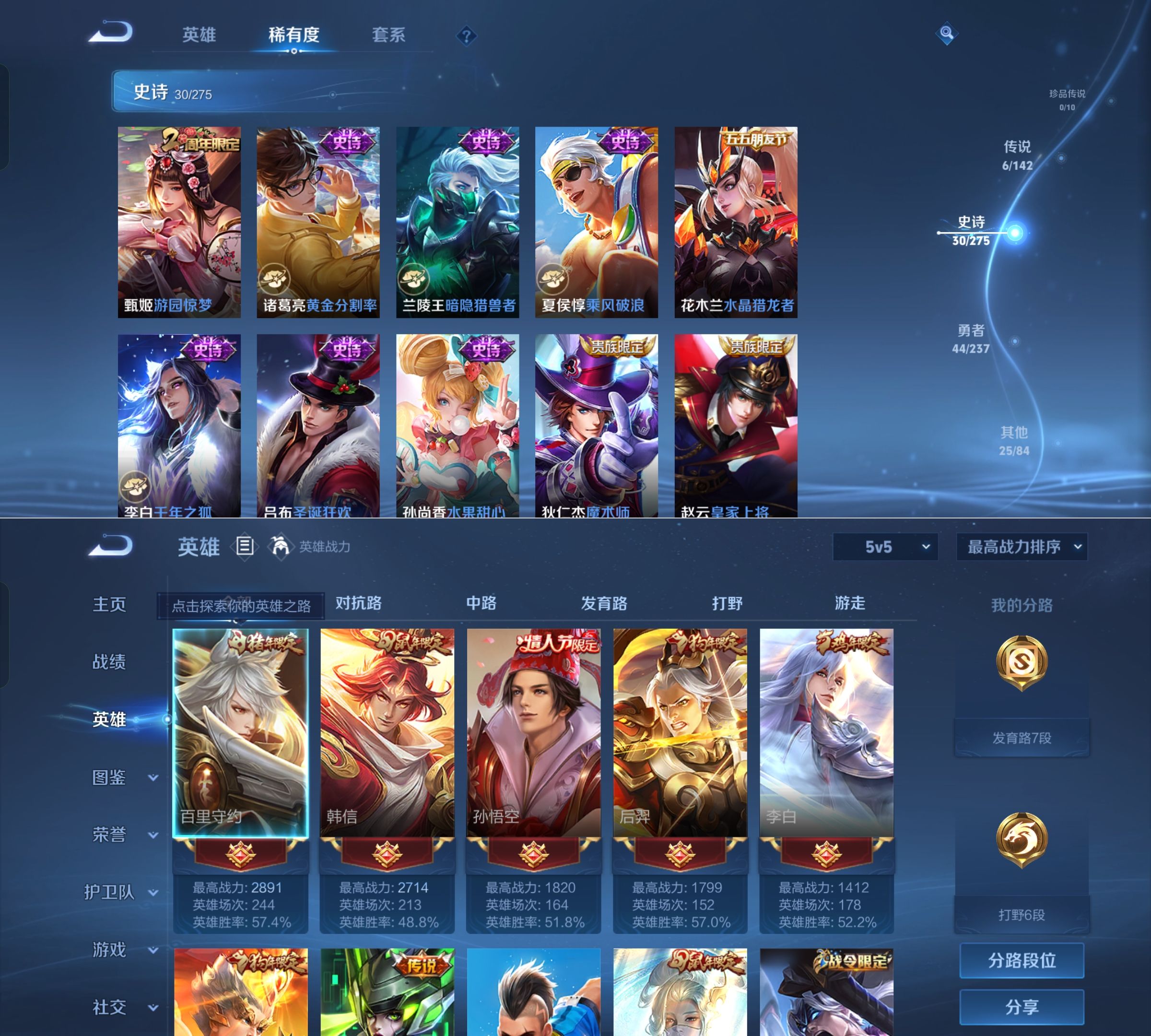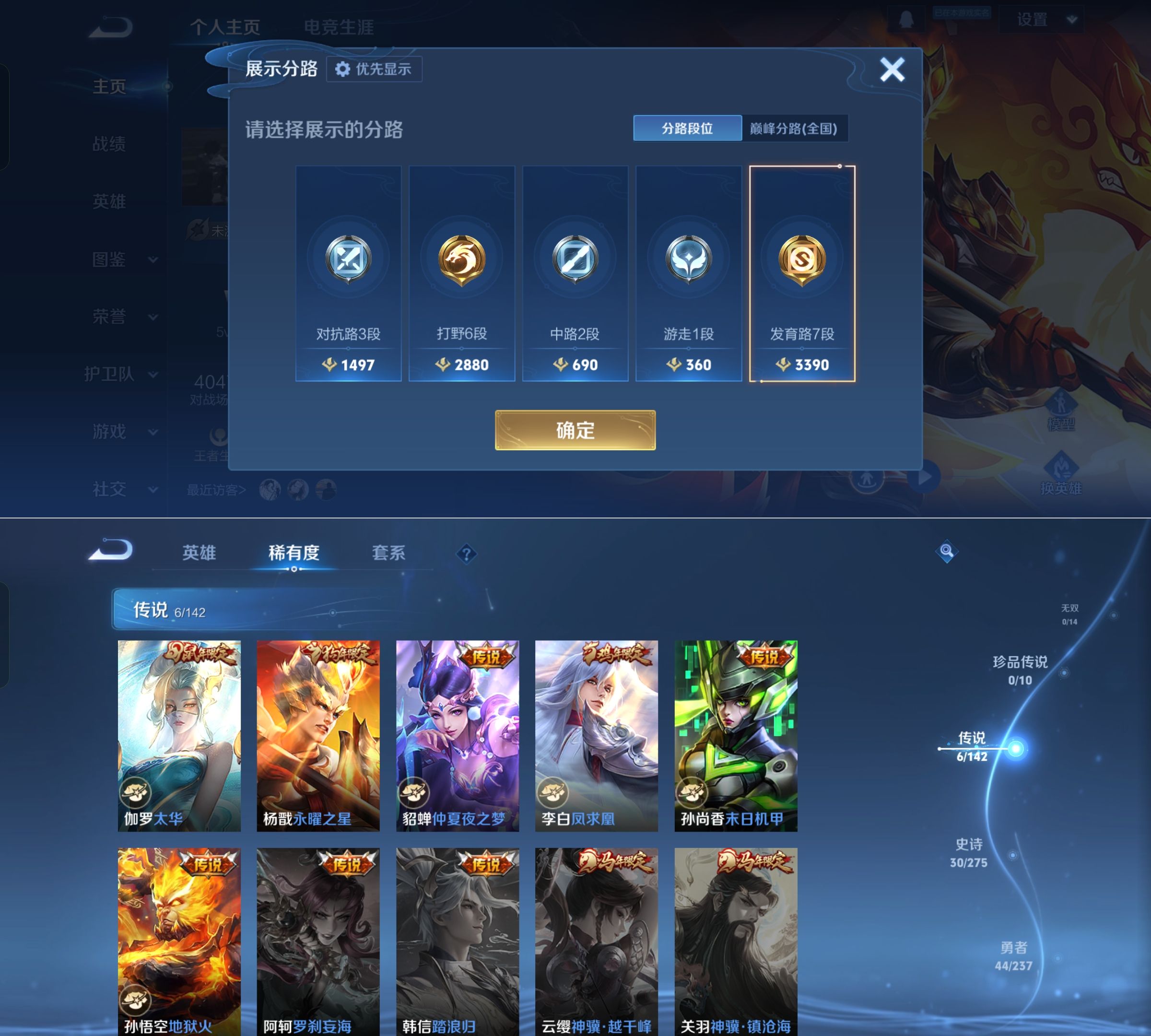 贵族等级:v7皮肤数:105生肖限定9 情人节限定3 传说品质6 英雄数:108