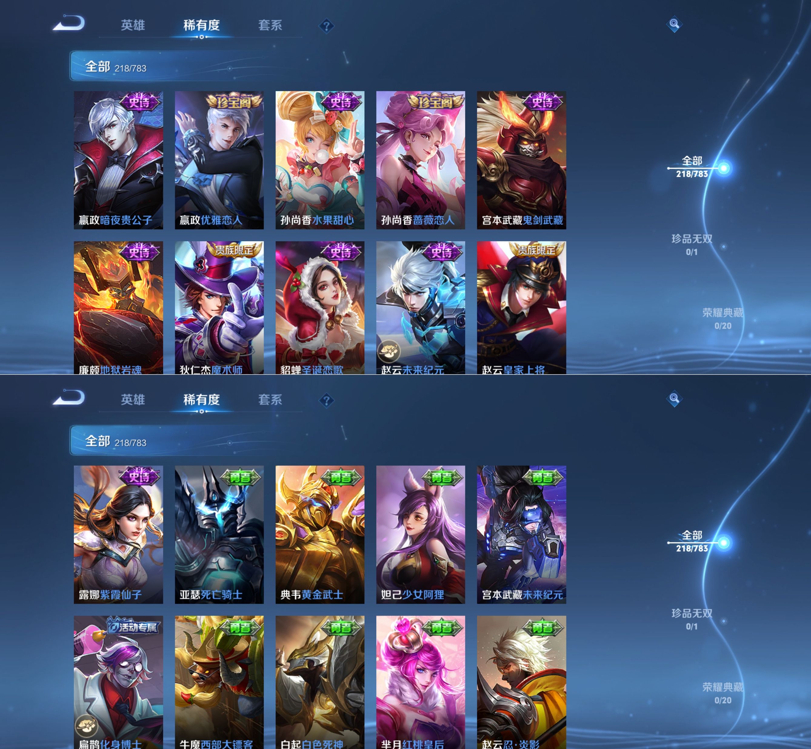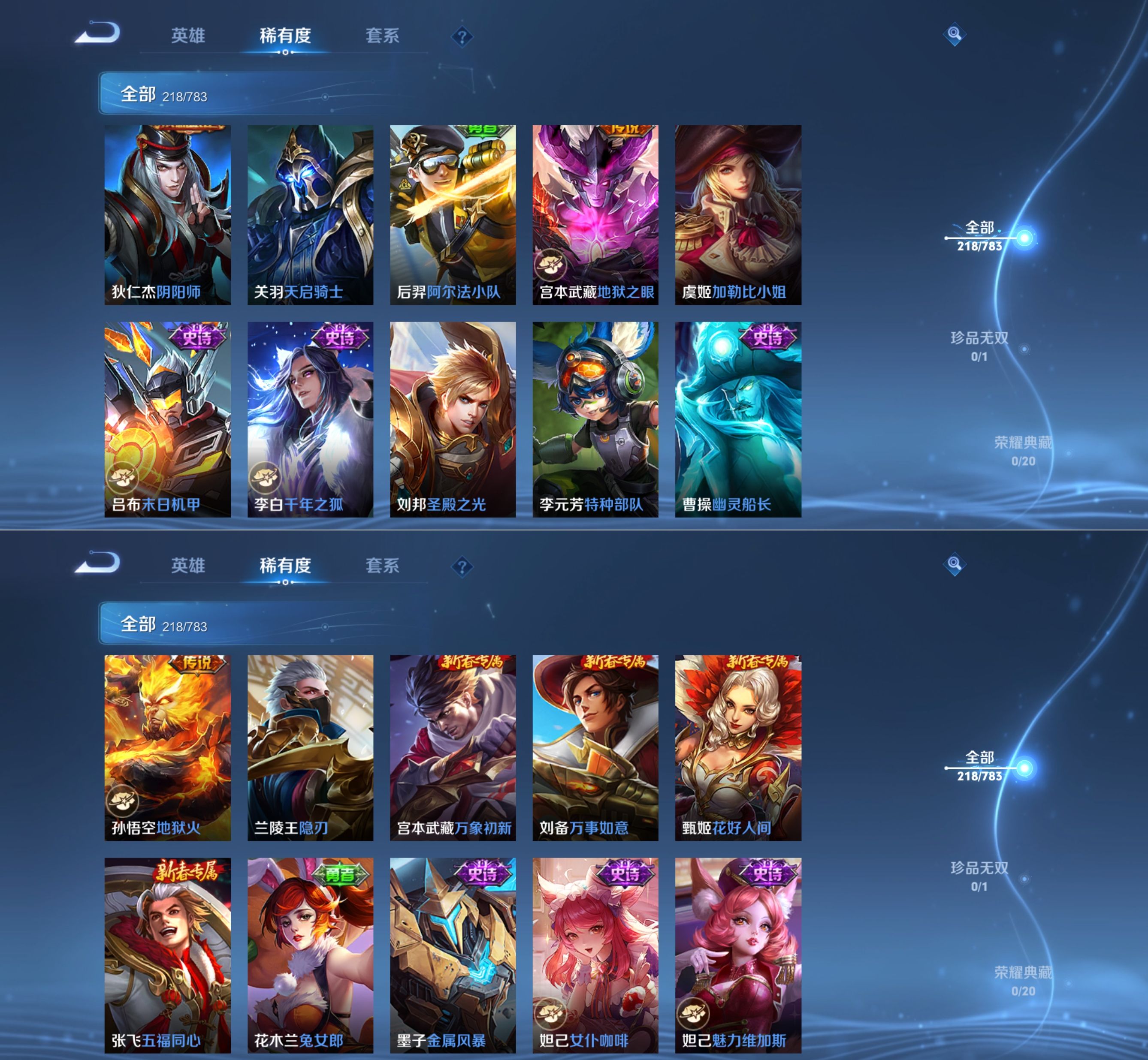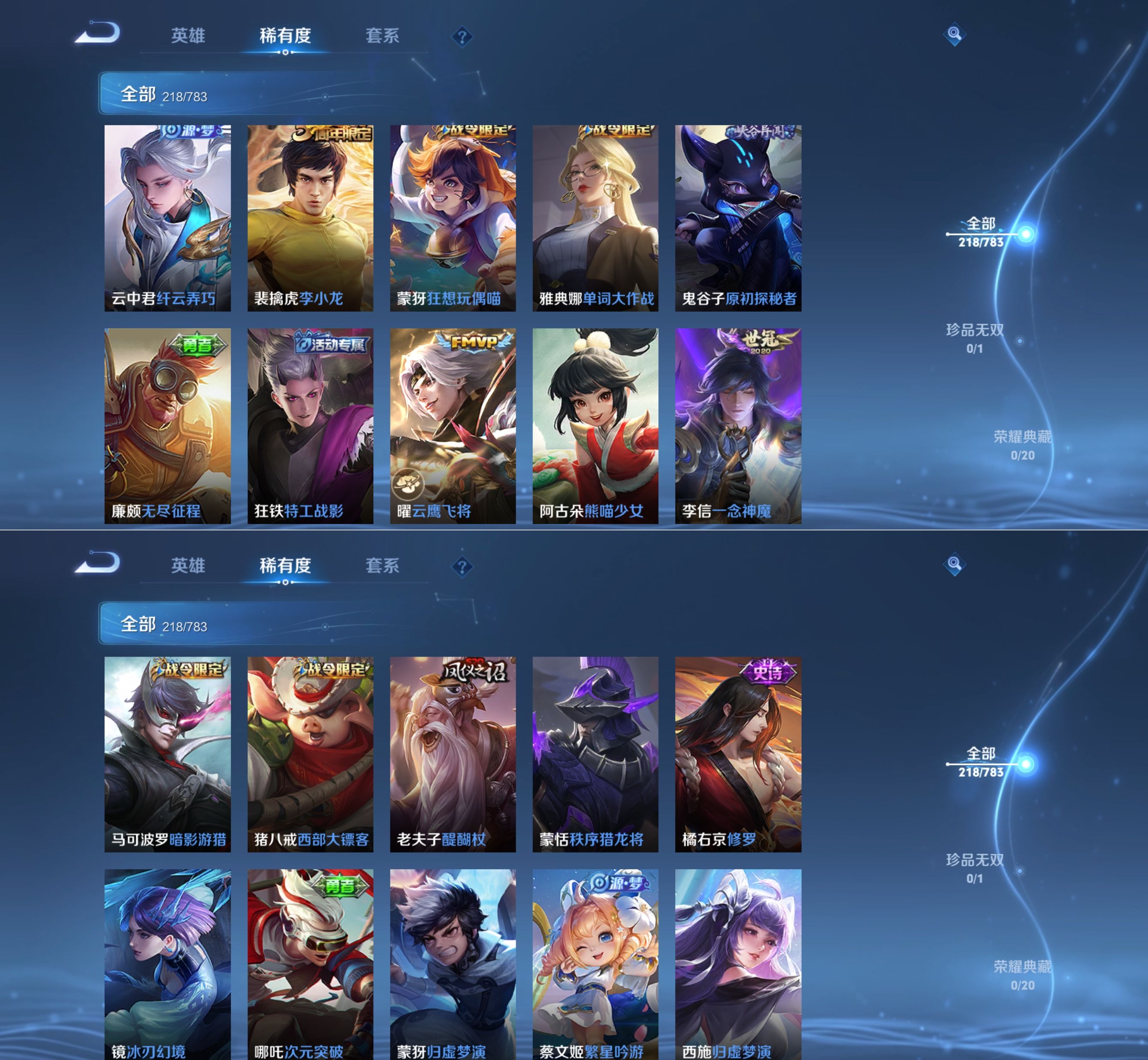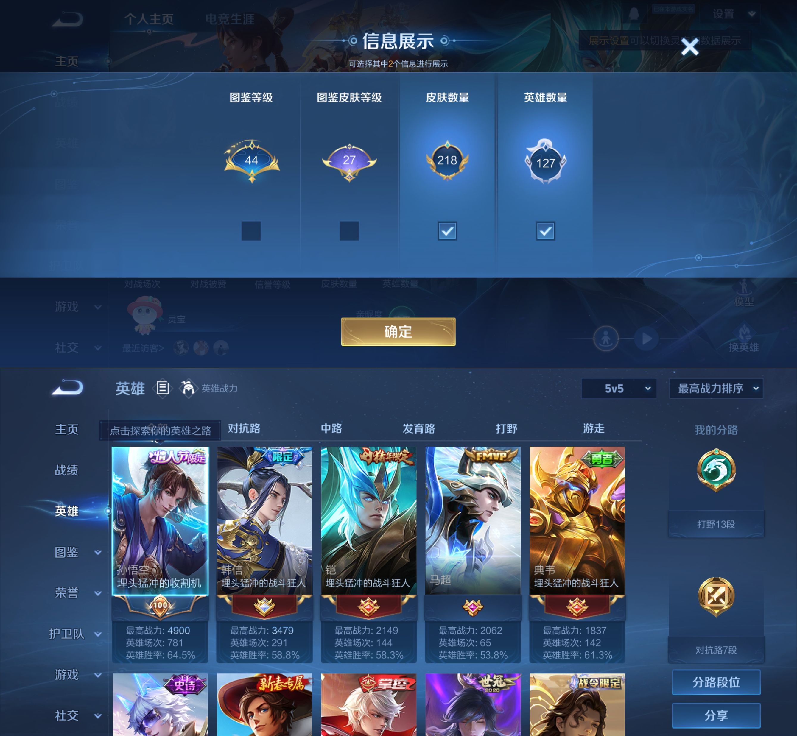 贵族等级:v7皮肤数:219传说品质10 情人节限定2 生肖限定1 英雄数:127