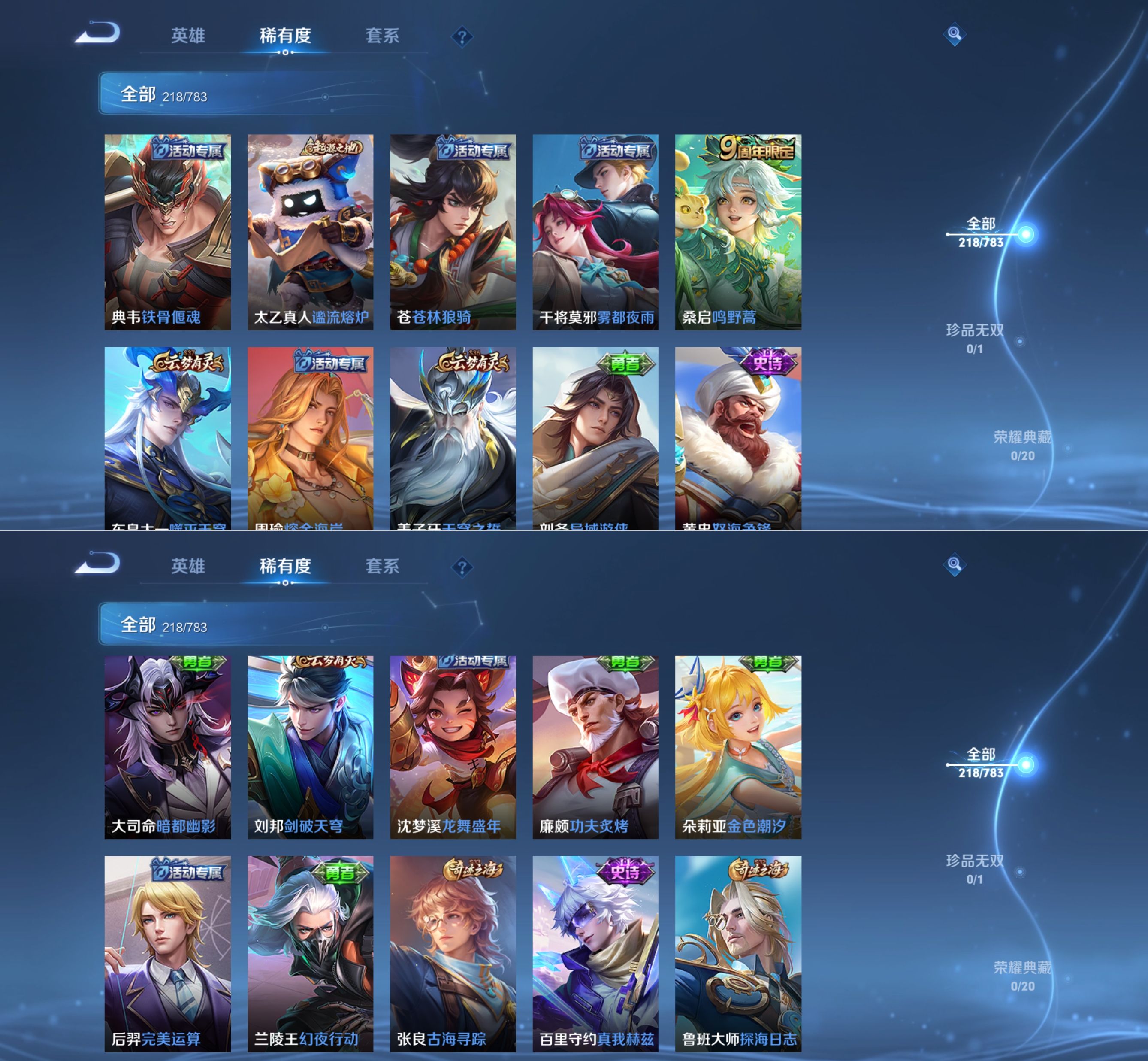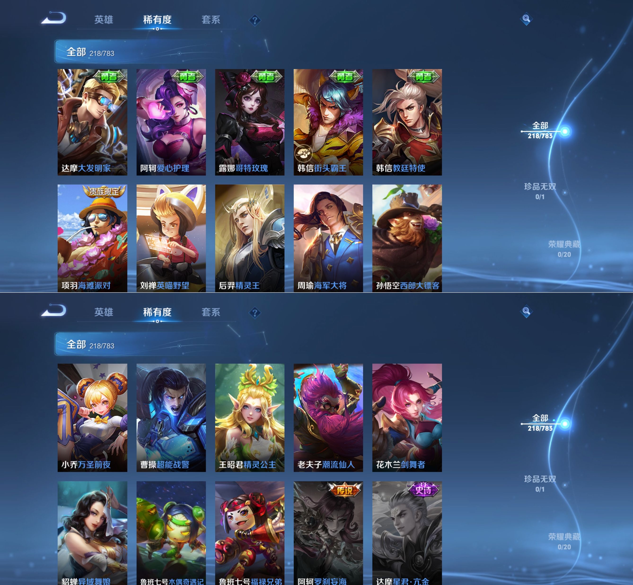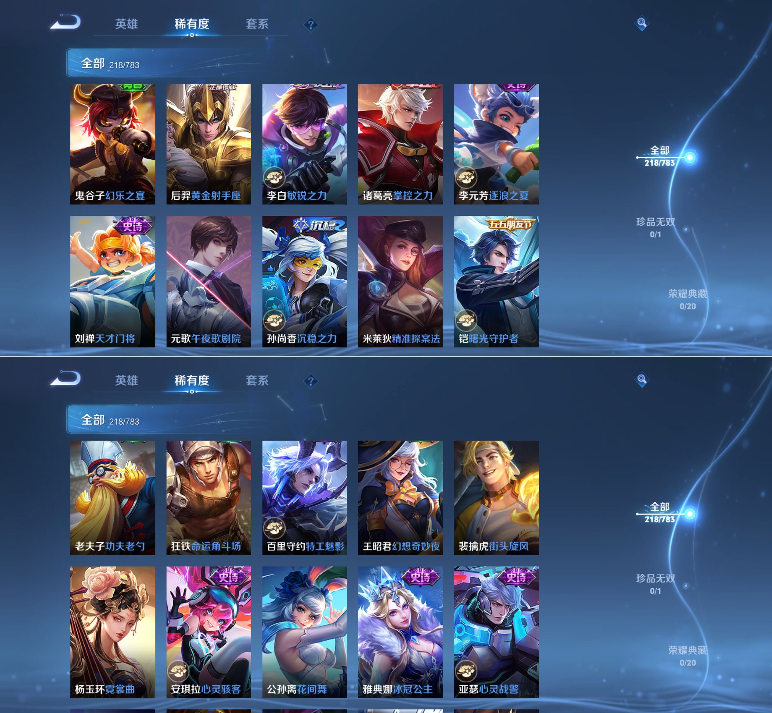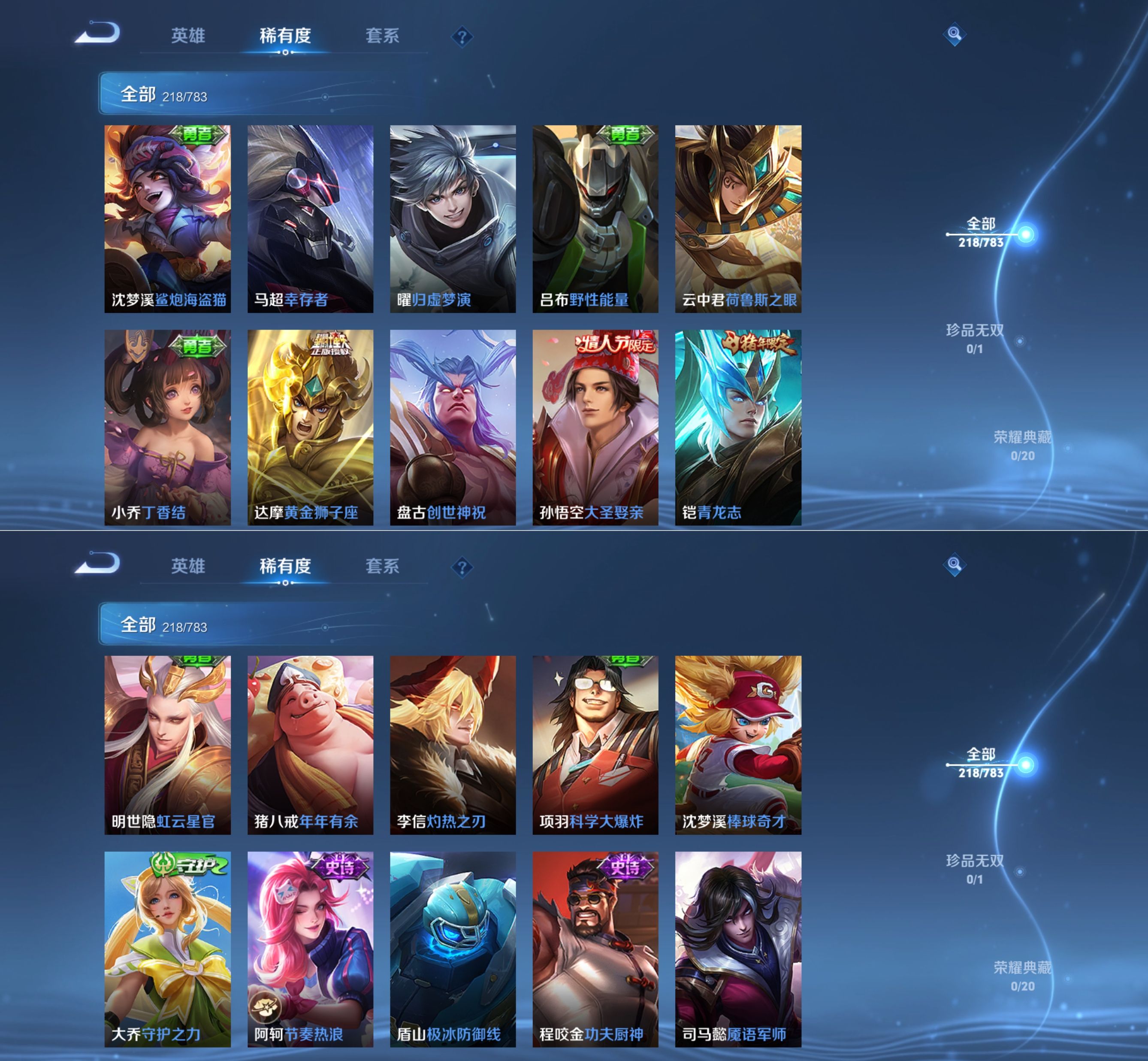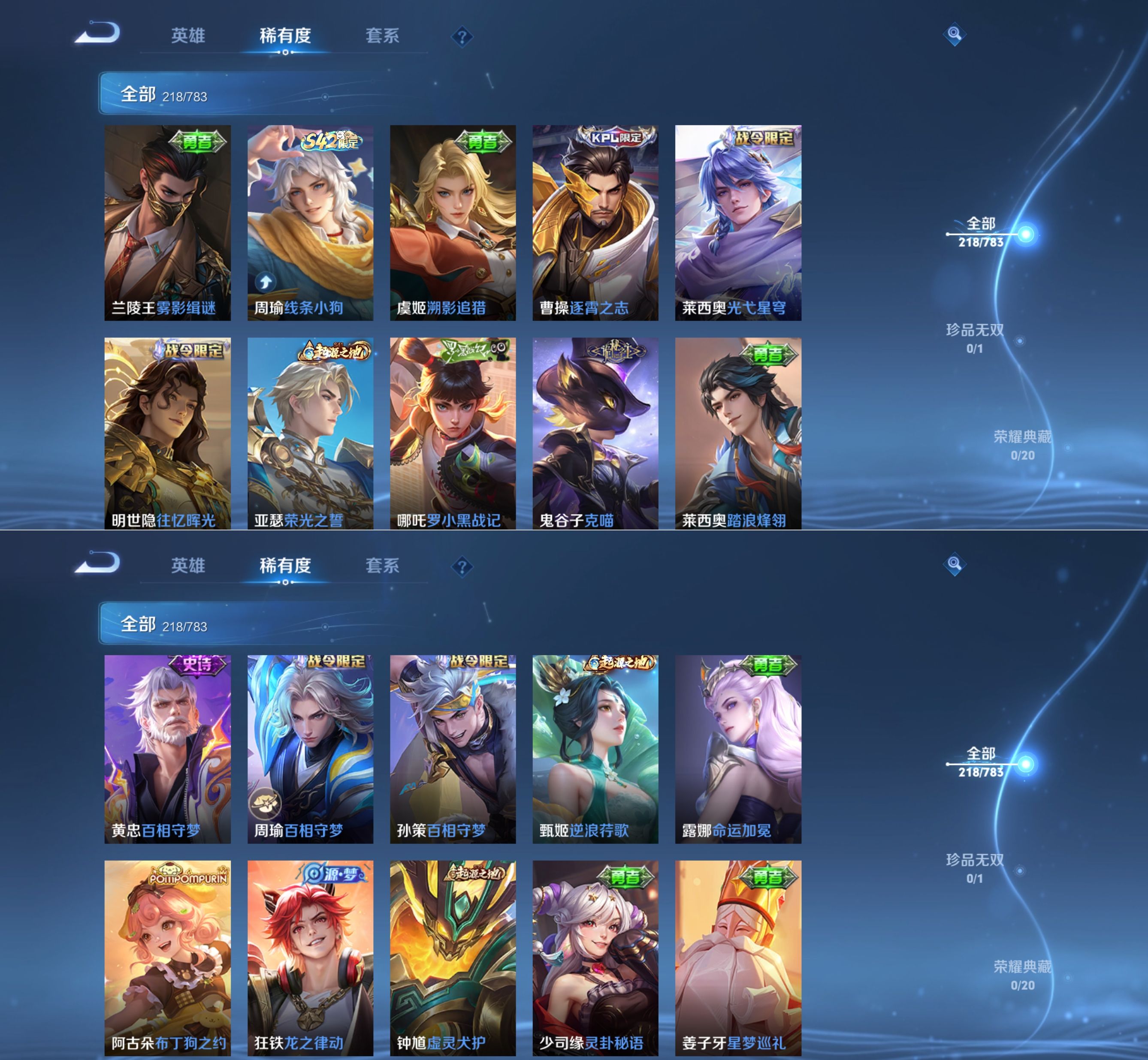 贵族等级:v7皮肤数:219传说品质10 情人节限定2 生肖限定1 英雄数:127