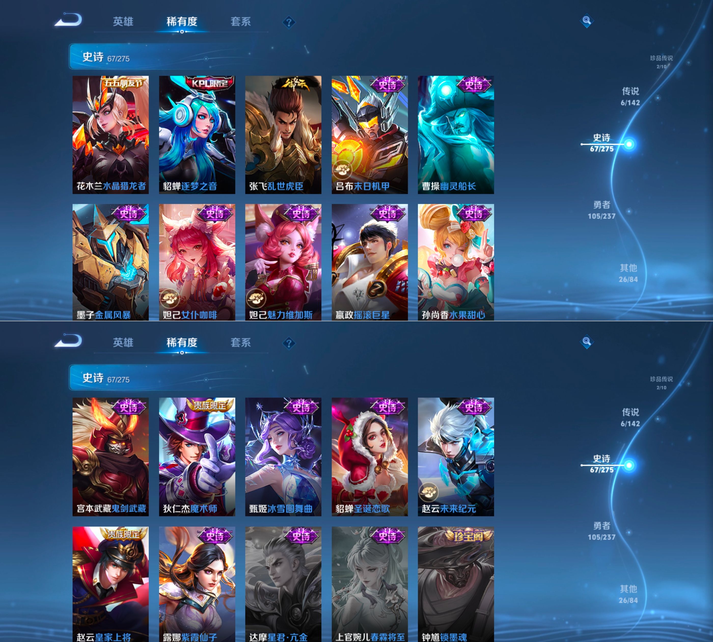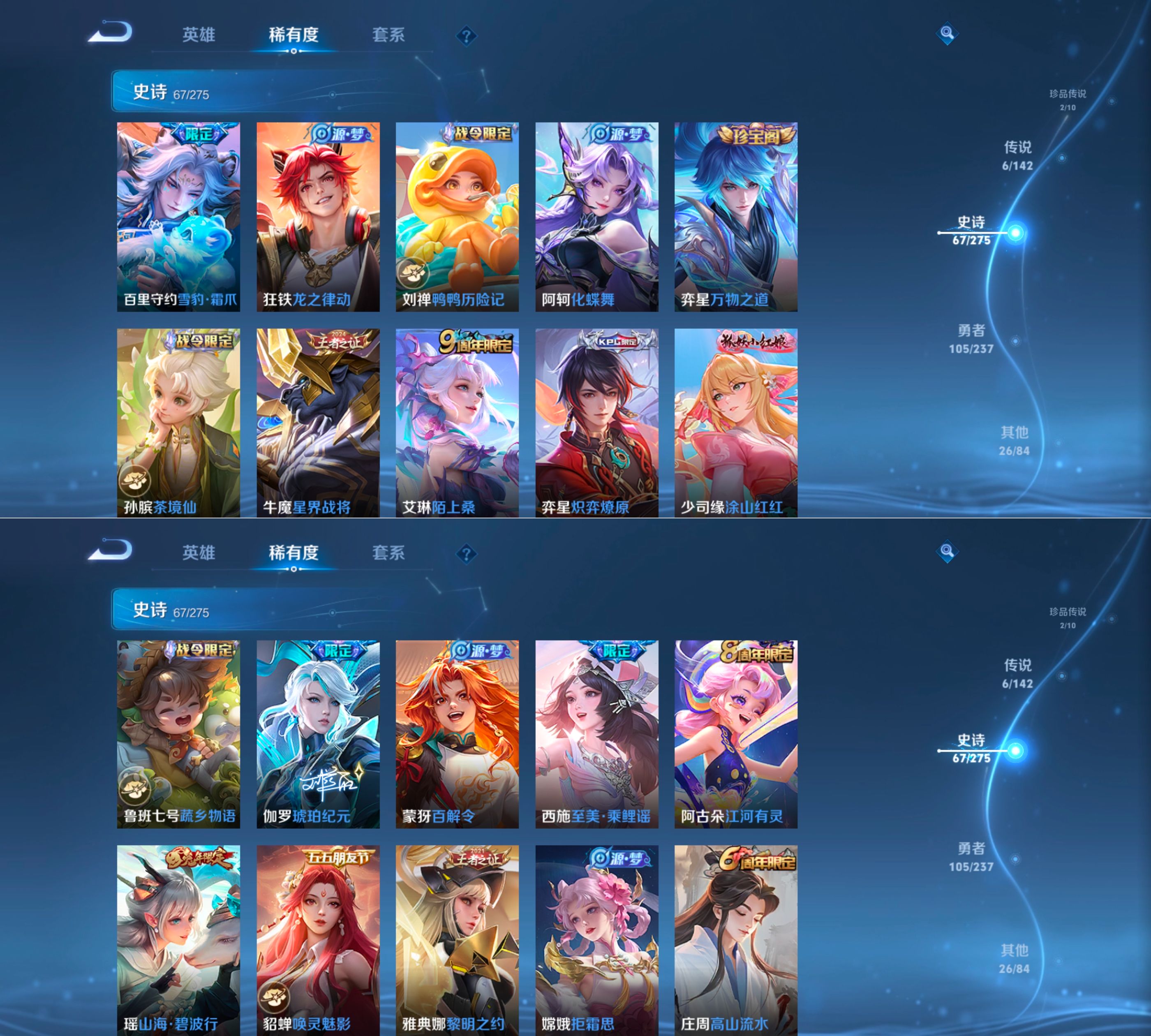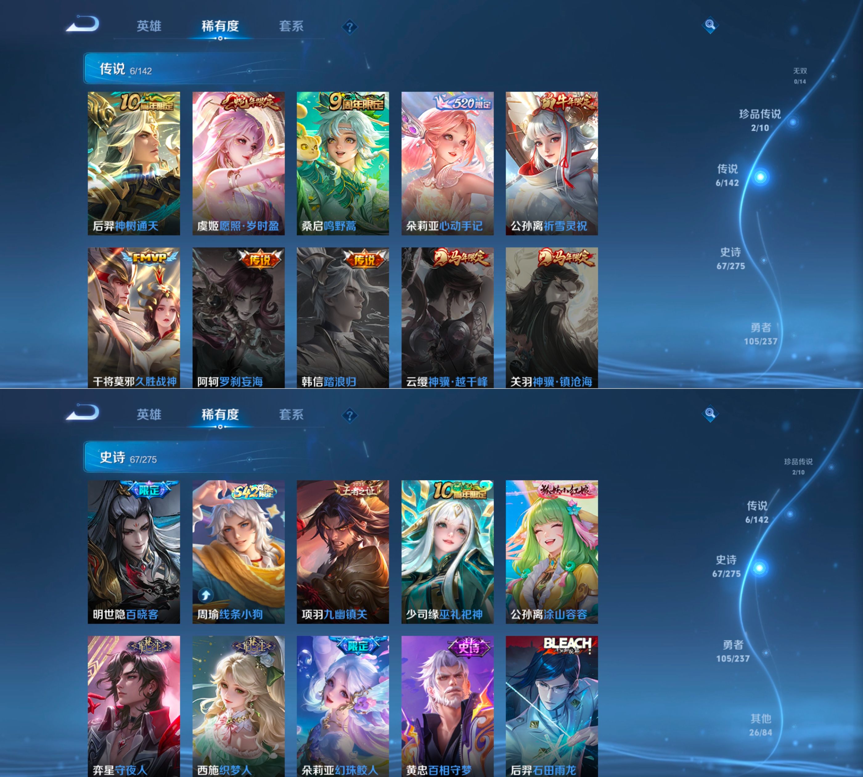 贵族等级:v6皮肤数:206传说品质6 珍品传说2 生肖限定3 英雄数:126
