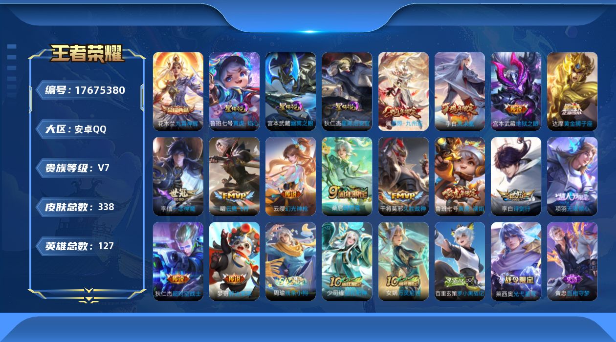 贵族等级:v7皮肤数:338生肖限定8 情人节限定3 传说品质14 荣耀典藏1 英雄数:127