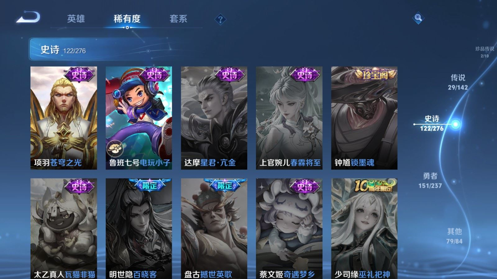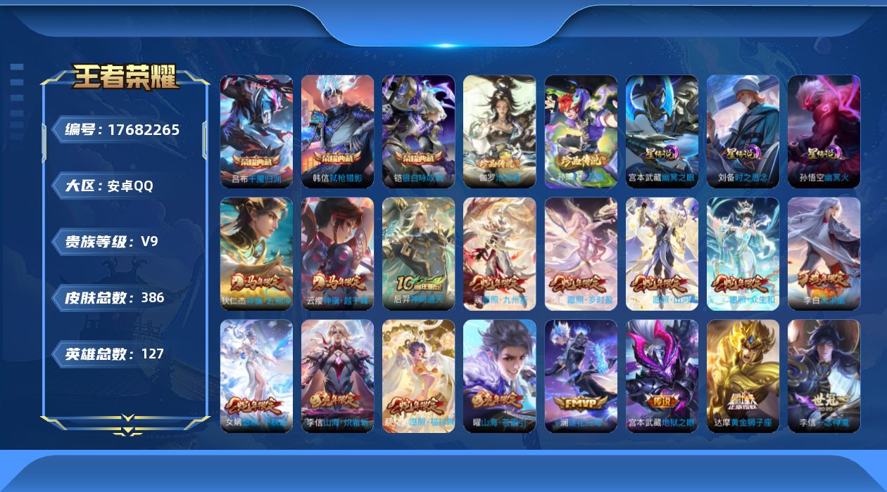 传说品质_后羿_黄金射手座传说品质_后羿_神树通天传说品质_司空震_愿照·山河定传说品质_澜_电玩·雷克斯传说品质_澜_逐花归海传说品质_澜_愿照·九州拓传说品质_诸葛亮_鹤羽星尊传说品质_兰陵王_默契交锋传说品质_孙悟空_地狱火传说品质_吕布_怒海麟威传说品质_干将莫邪_久胜战神传说品质_宫本武藏_地狱之眼传说品质_李信_一念神魔传说品质_李信_山海·炽霜斩传说品质_孙尚香_异界灵契传说品质_刘备_时之恋人传说品质_张良_黄金白羊座传说品质_女娲_愿照·千秋盛传说品质_妲己_愿照·众生和传说品质_云缨_神骥·越千峰传说品质_李白_凤求凰传说品质_李白_诗剑行传说品质_蔡文姬_愿照·福禄聚传说品质_曜_云鹰飞将传说品质_曜_山海·苍雷引传说品质_狄仁杰_神骥·赴朔漠传说品质_达摩_黄金狮子座传说品质_虞姬_愿照·岁时盈传说品质_虞姬_启明星使