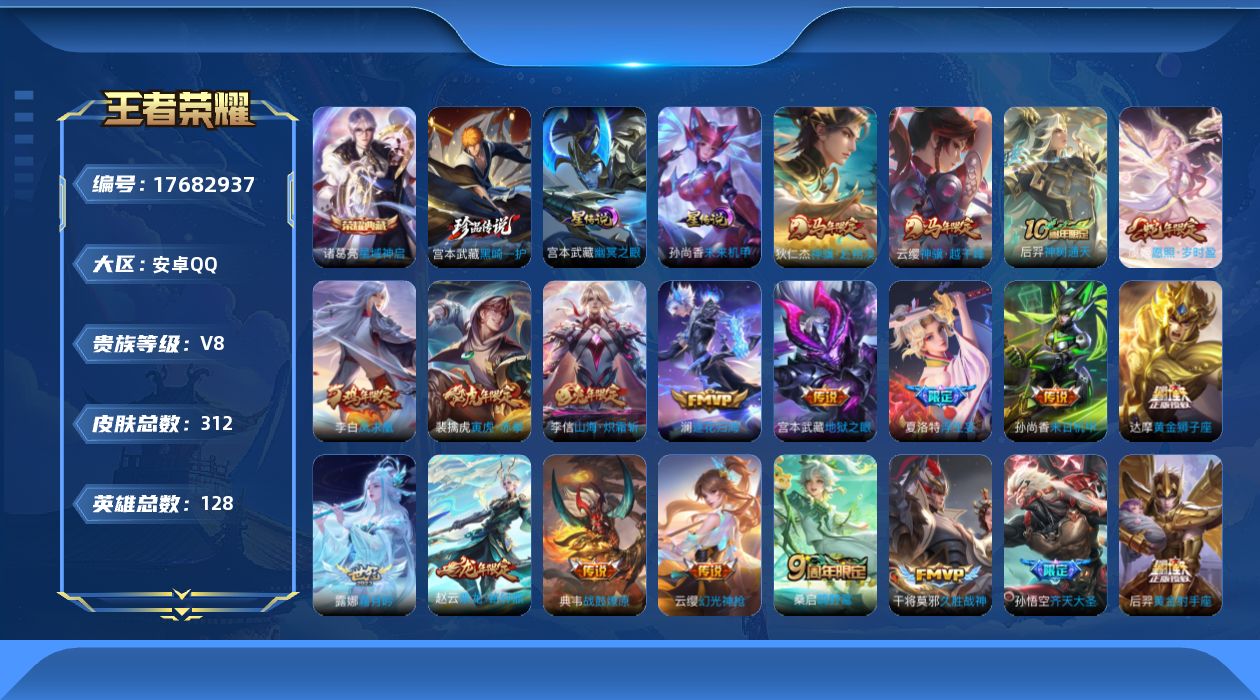 贵族等级:v8皮肤数:312传说品质24 荣耀典藏1 生肖限定9 珍品传说1 情人节限定1 英雄数:128