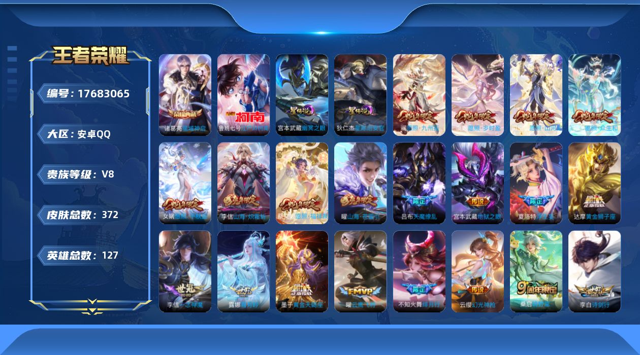 传说品质_司空震_愿照·山河定传说品质_澜_愿照·九州拓传说品质_吕布_天魔缭乱传说品质_吕布_怒海麟威传说品质_宫本武藏_地狱之眼传说品质_不知火舞_绯月行传说品质_李信_一念神魔传说品质_李信_山海·炽霜斩传说品质_桑启_鸣野蒿传说品质_露娜_霜月吟传说品质_云中君_群星魔术团传说品质_女娲_愿照·千秋盛传说品质_墨子_黄金天蝎座传说品质_马可波罗_妄想实况传说品质_妲己_愿照·众生和传说品质_云缨_幻光神枪传说品质_李白_诗剑行传说品质_张飞_百相守梦传说品质_蔡文姬_愿照·福禄聚传说品质_夏洛特_浮生妄传说品质_曜_云鹰飞将传说品质_曜_山海·苍雷引传说品质_狄仁杰_超时空战士传说品质_达摩_黄金狮子座传说品质_虞姬_愿照·岁时盈传说品质_虞姬_启明星使传说品质_李元芳_飞鸢探春传说品质_王昭君_乞巧织情