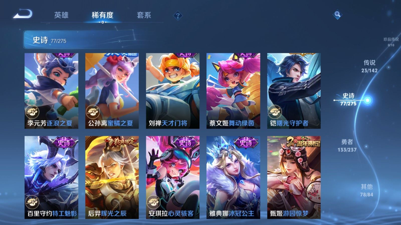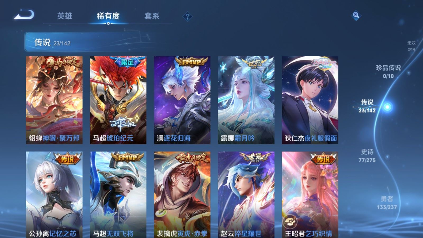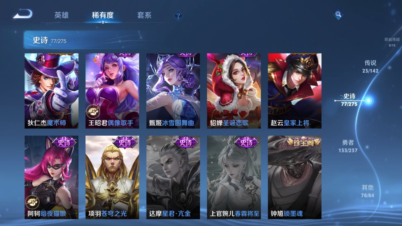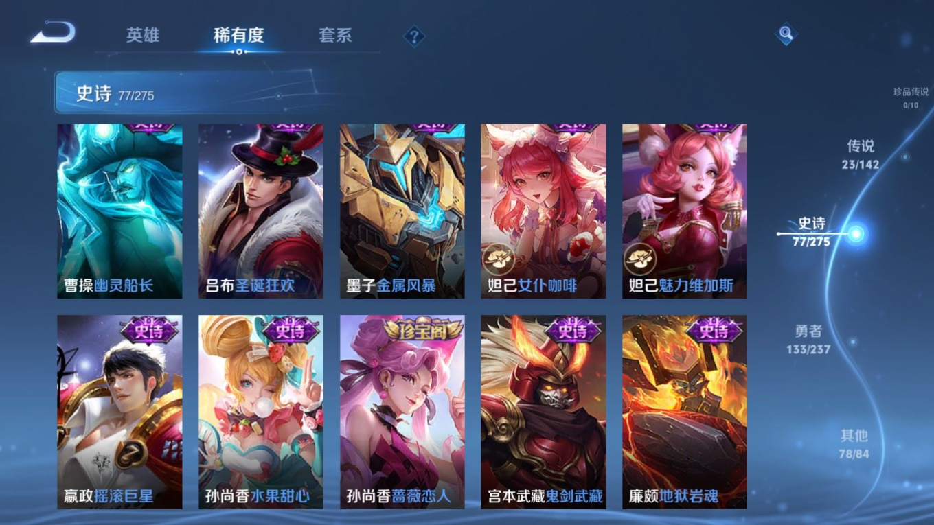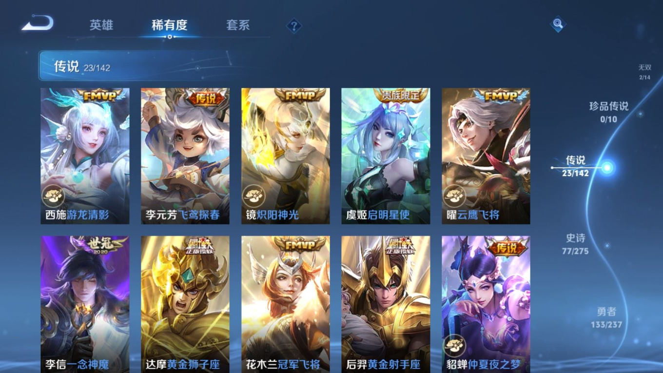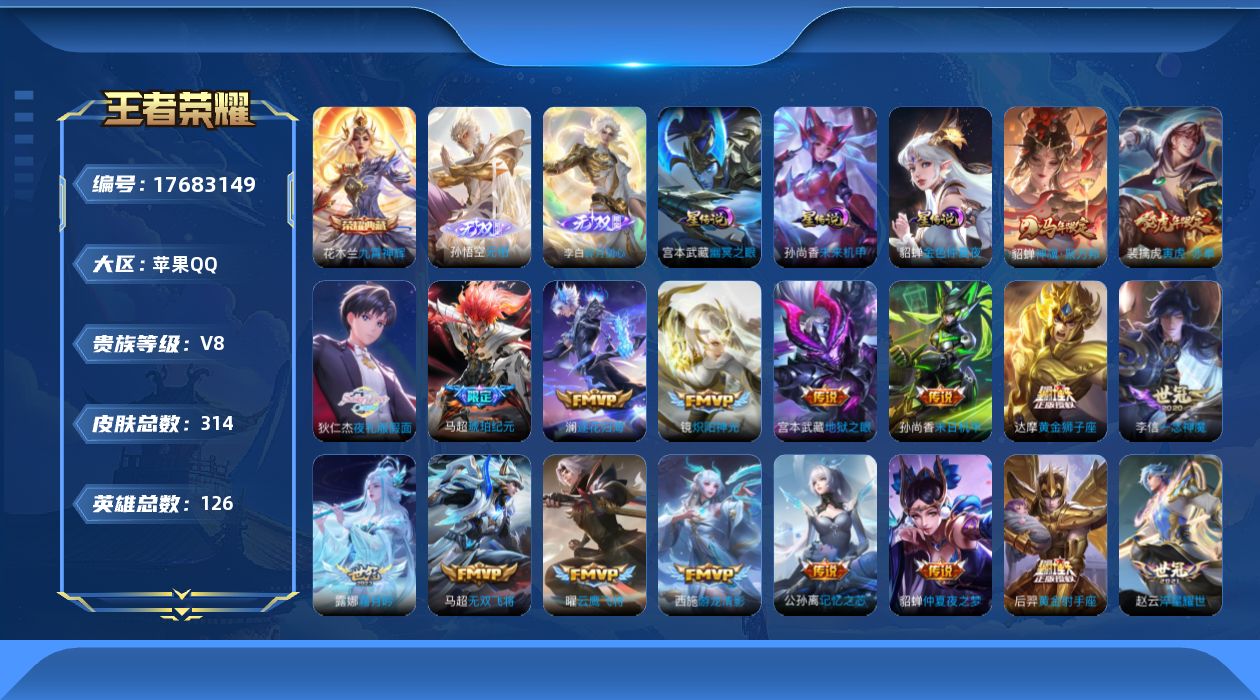 贵族等级:v8皮肤数:314生肖限定3 传说品质23 情人节限定1 无双2 荣耀典藏1 英雄数:126