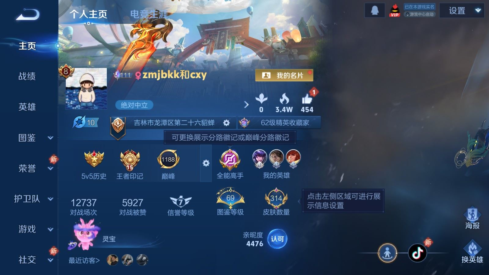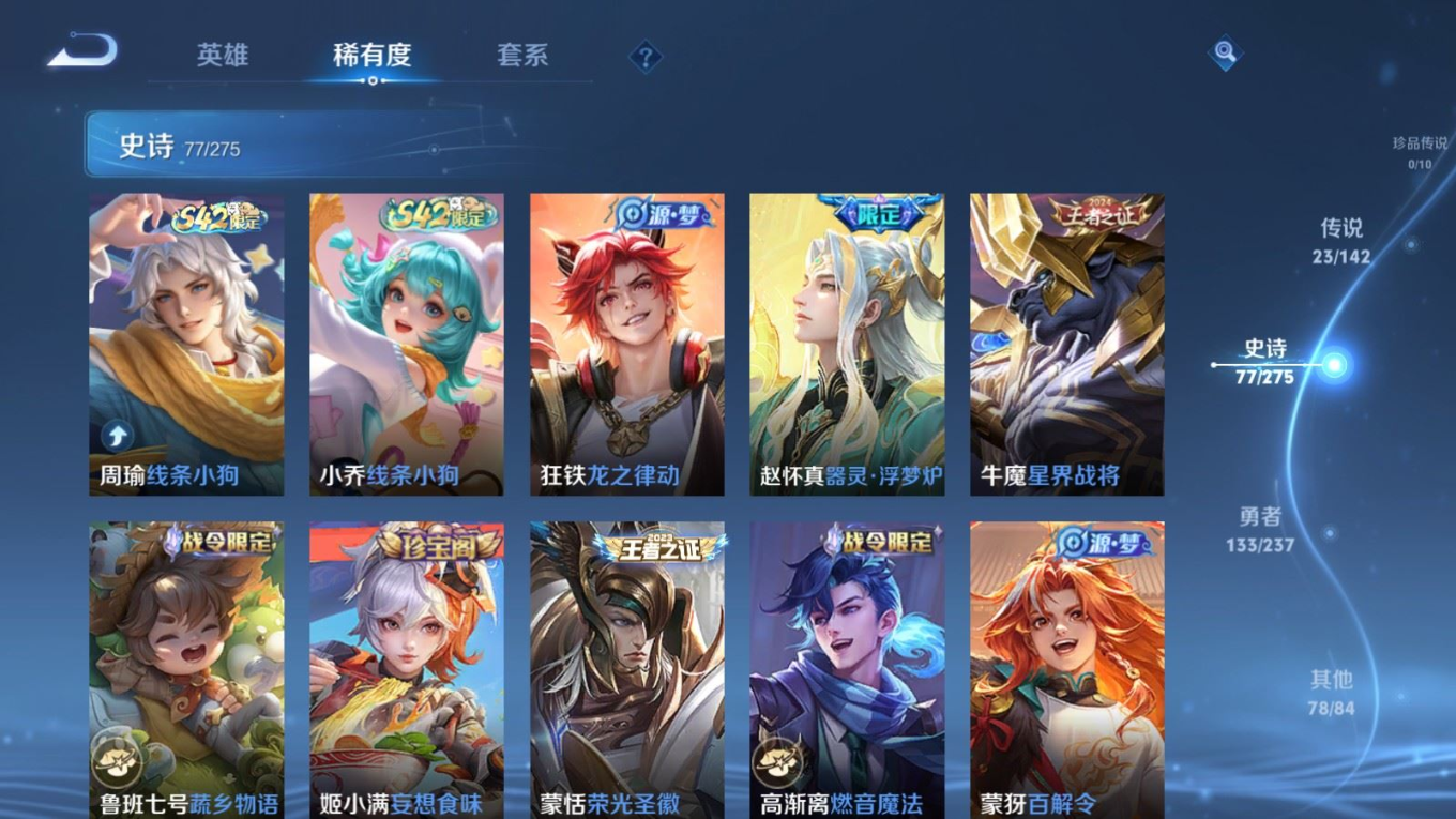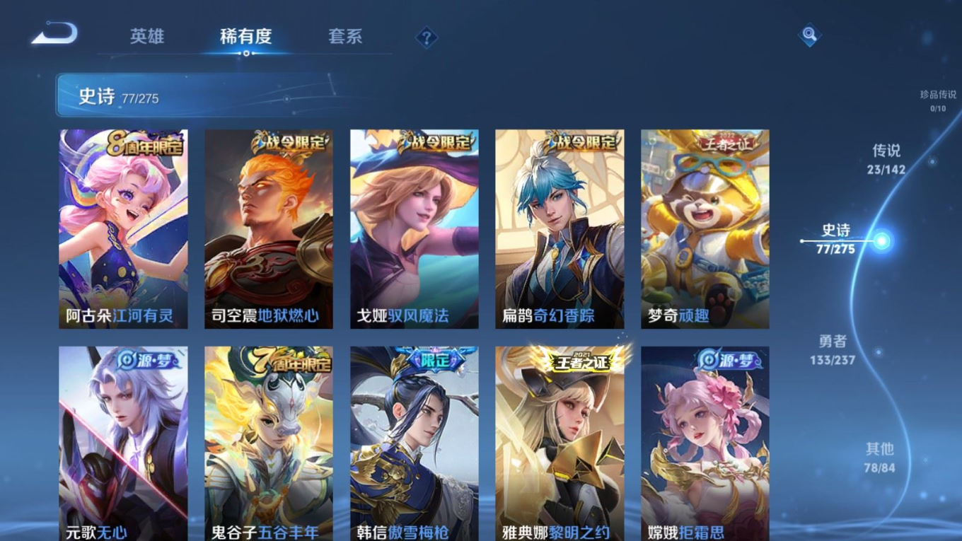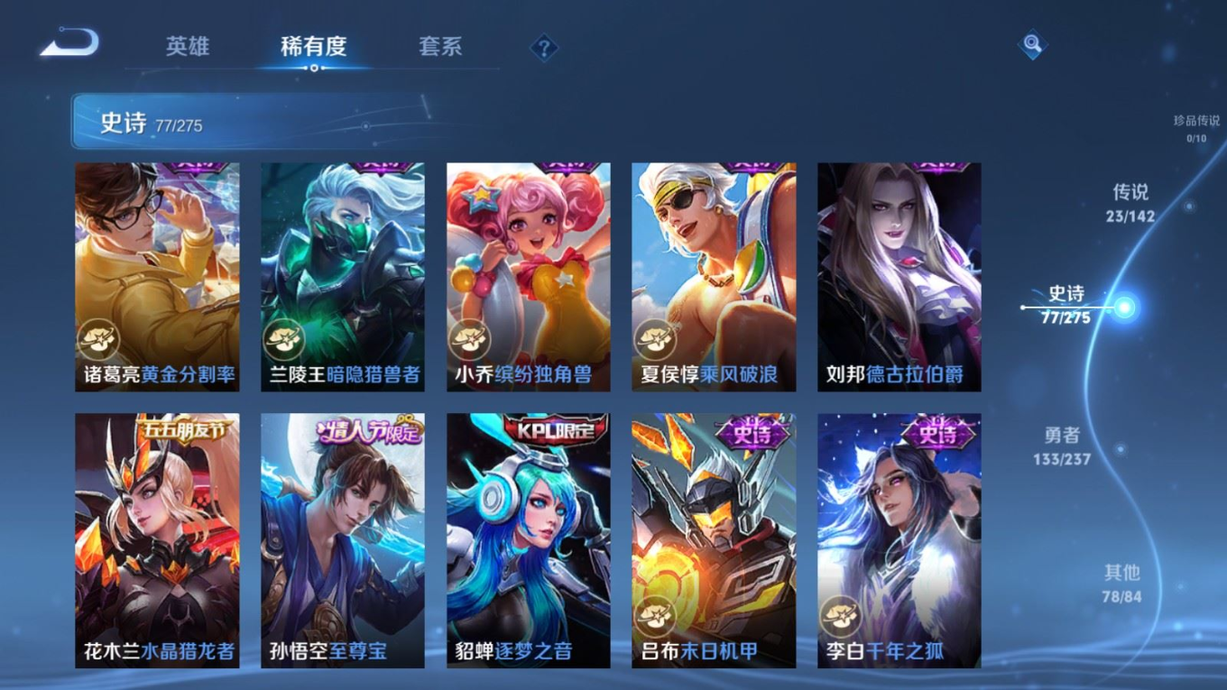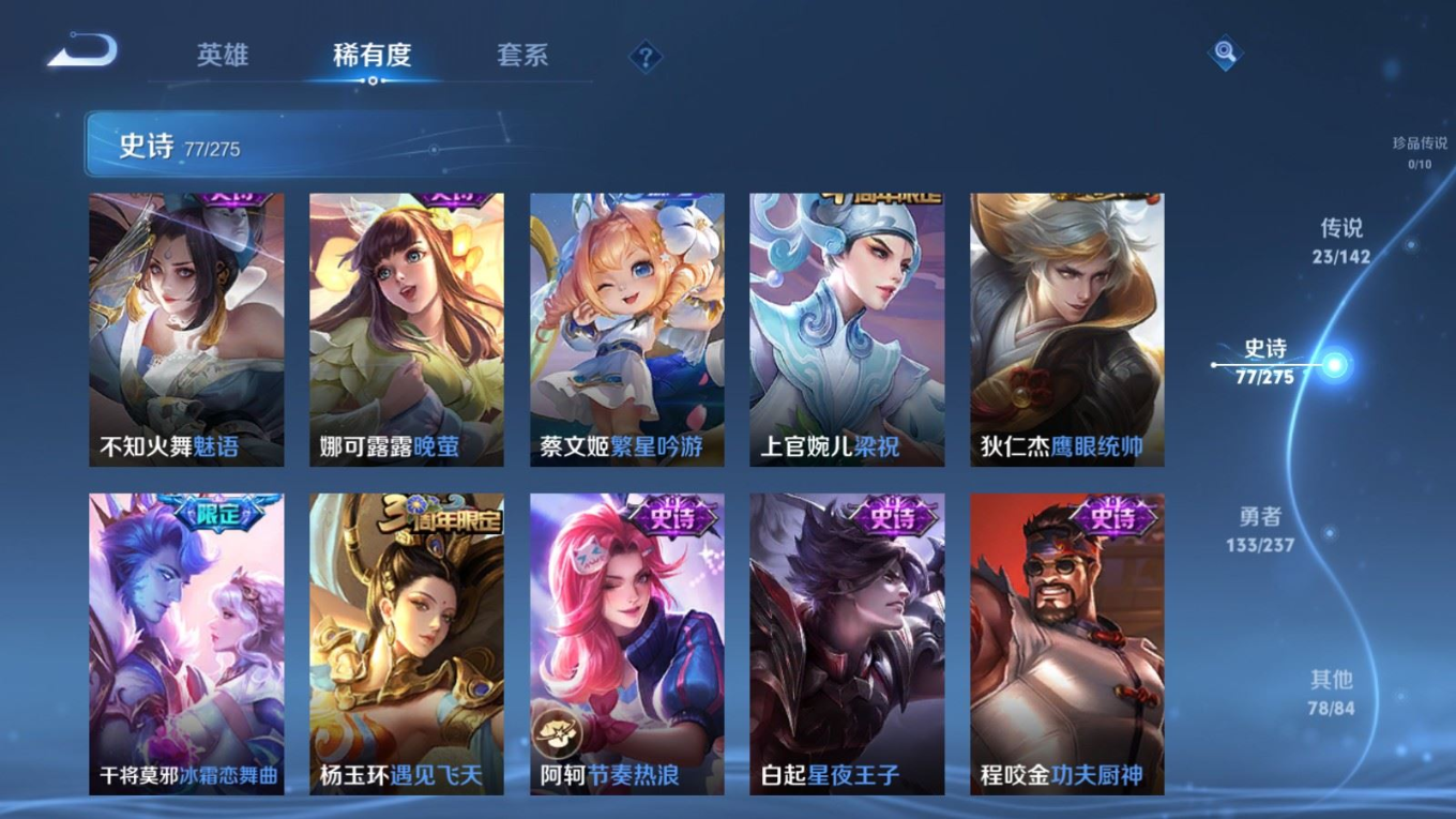 贵族等级:v8皮肤数:314生肖限定3 传说品质23 情人节限定1 无双2 荣耀典藏1 英雄数:126