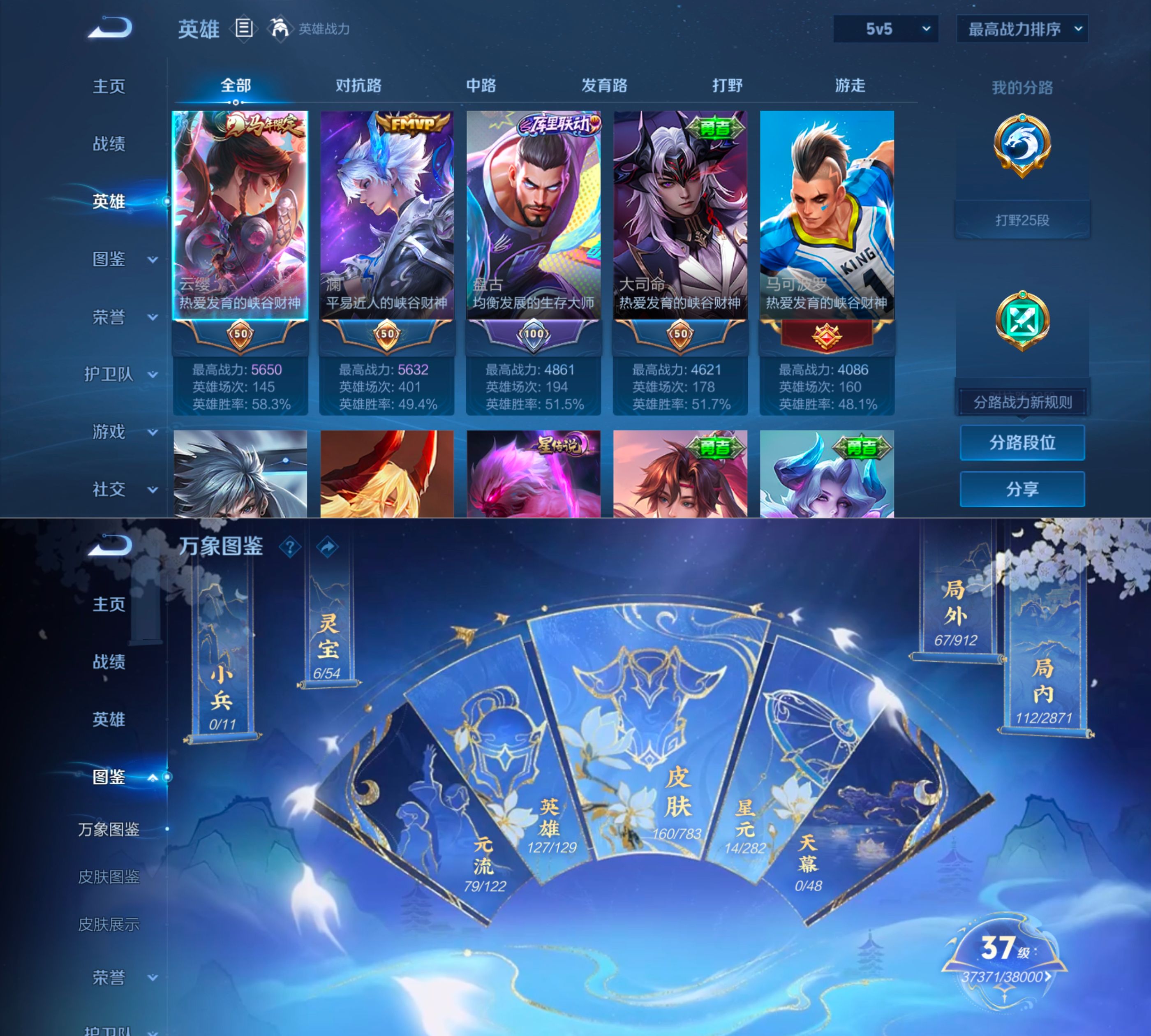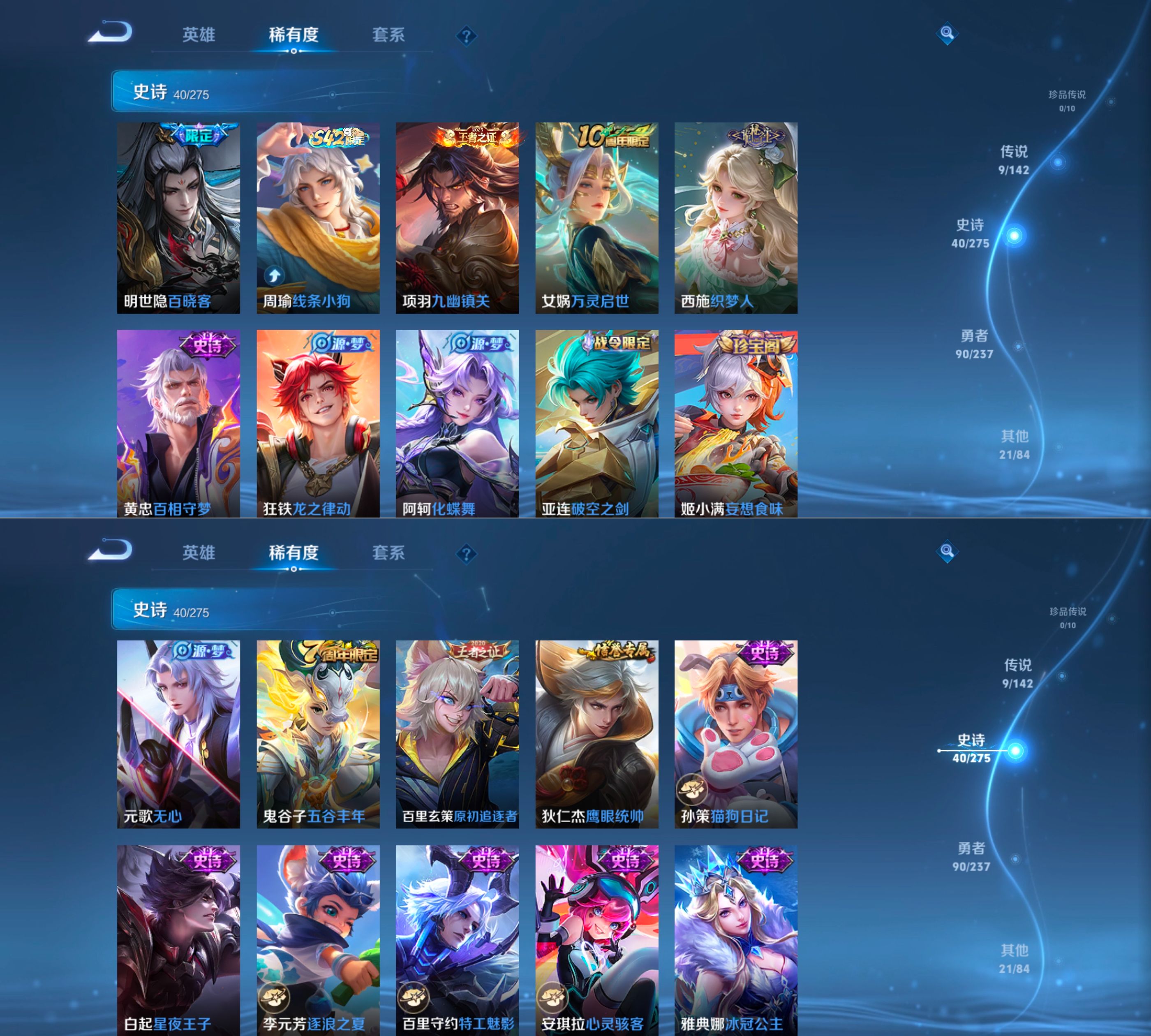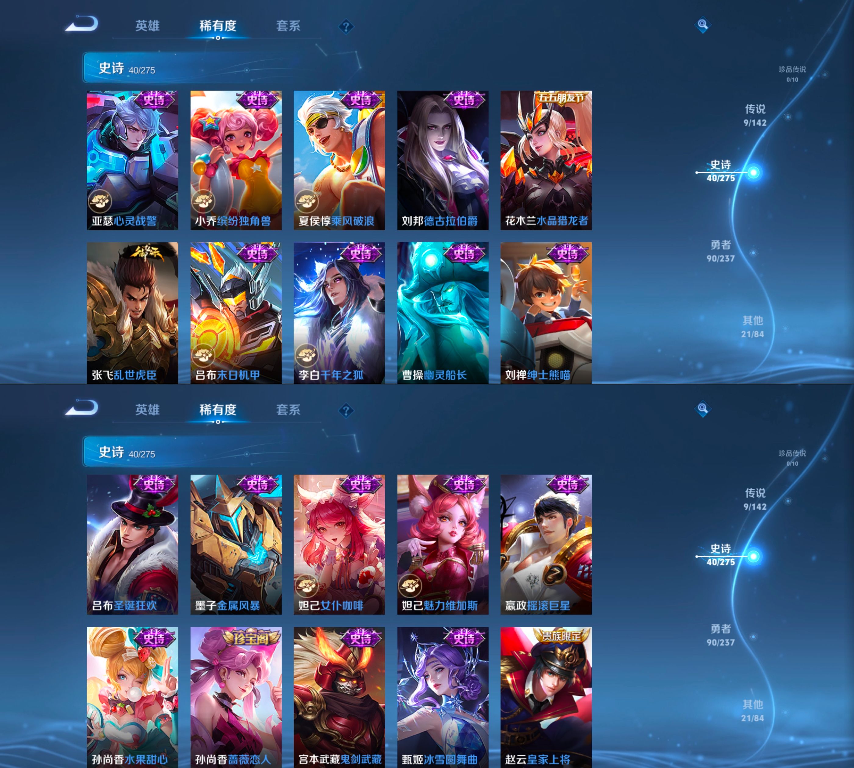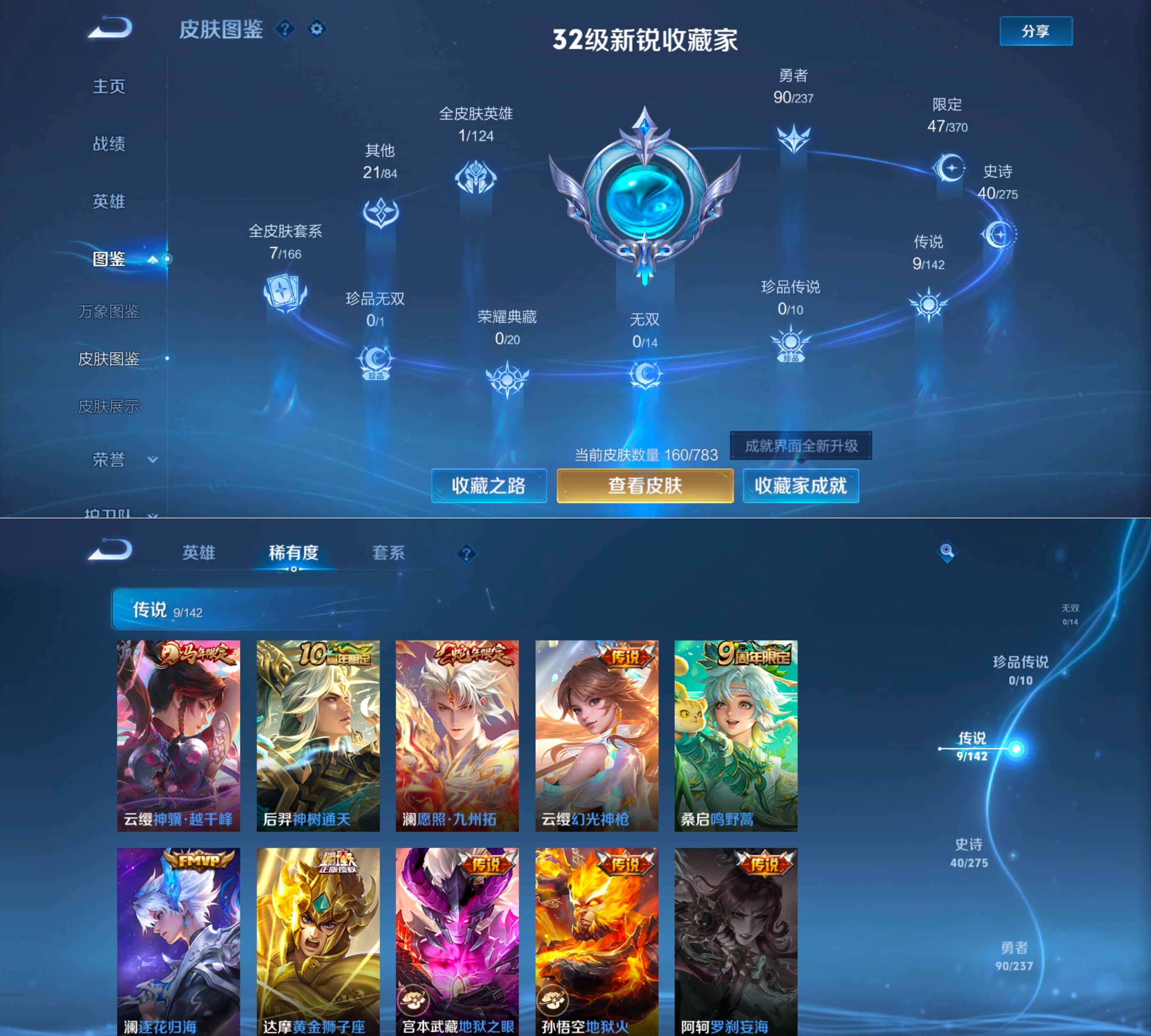 贵族等级:v5皮肤数:160传说品质9 生肖限定2 英雄数:127