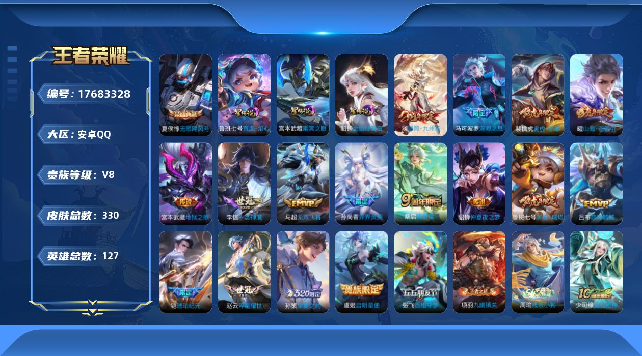 贵族等级:v8皮肤数:330传说品质17 生肖限定11 情人节限定2 荣耀典藏1 英雄数:127