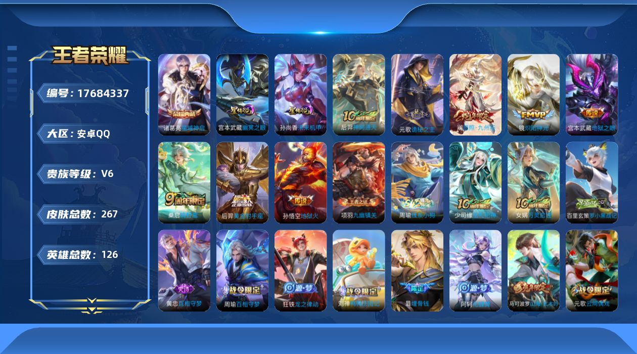 贵族等级:v6皮肤数:267传说品质8 生肖限定2 荣耀典藏1 英雄数:126