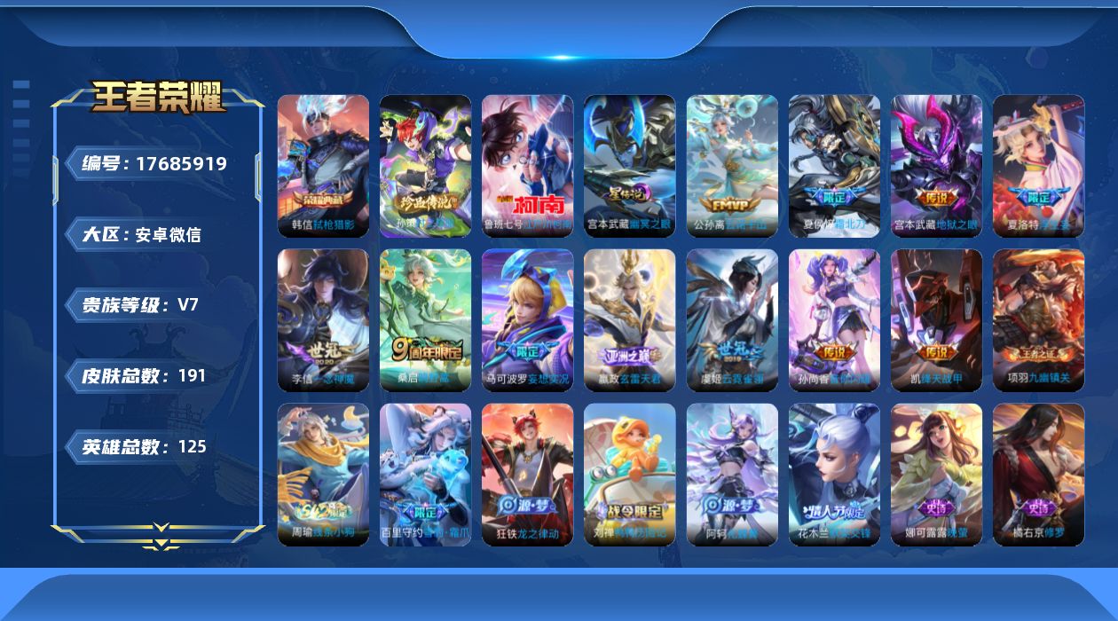 贵族等级:v7皮肤数:191传说品质11 情人节限定1 珍品传说2 荣耀典藏1 英雄数:125