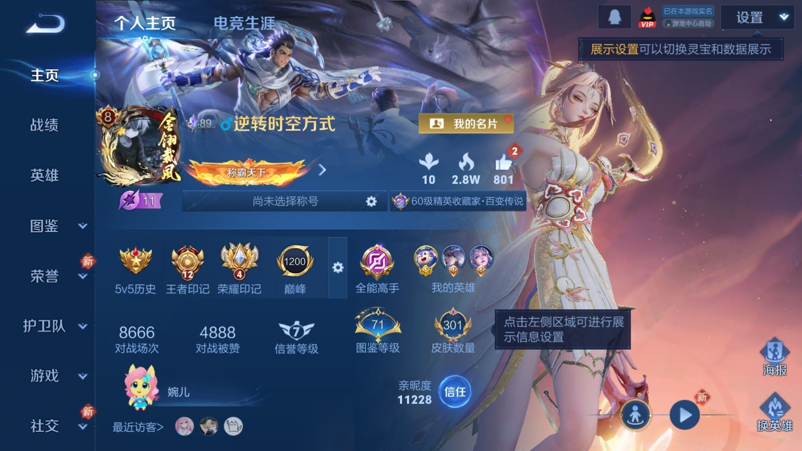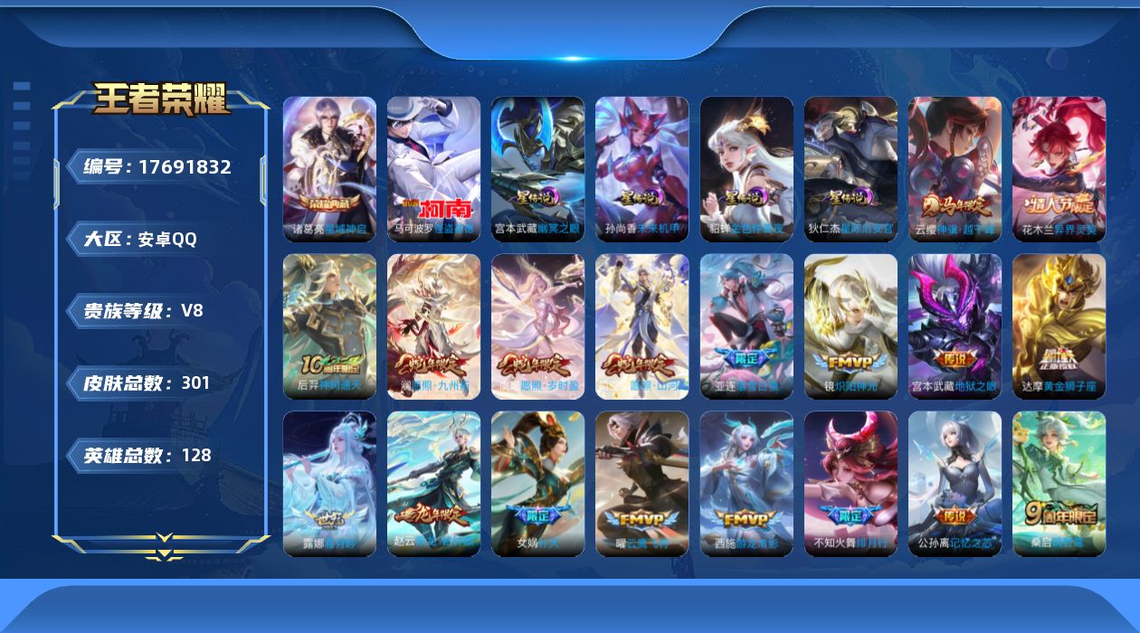 贵族等级:v8皮肤数:301情人节限定4 传说品质27 生肖限定9 荣耀典藏1 珍品传说1 英雄数:128