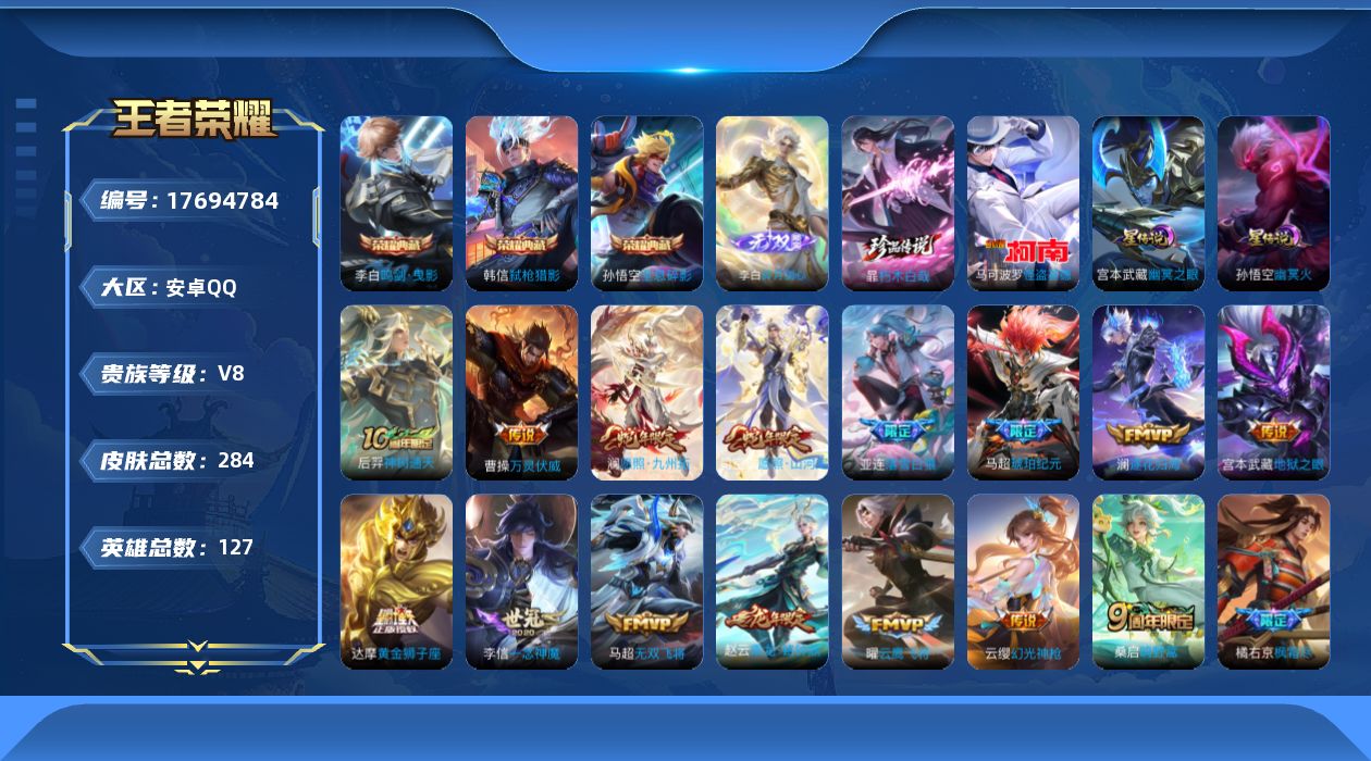 贵族等级:v8皮肤数:284生肖限定5 传说品质24 情人节限定1 荣耀典藏3 珍品传说2 无双1 英雄数:127