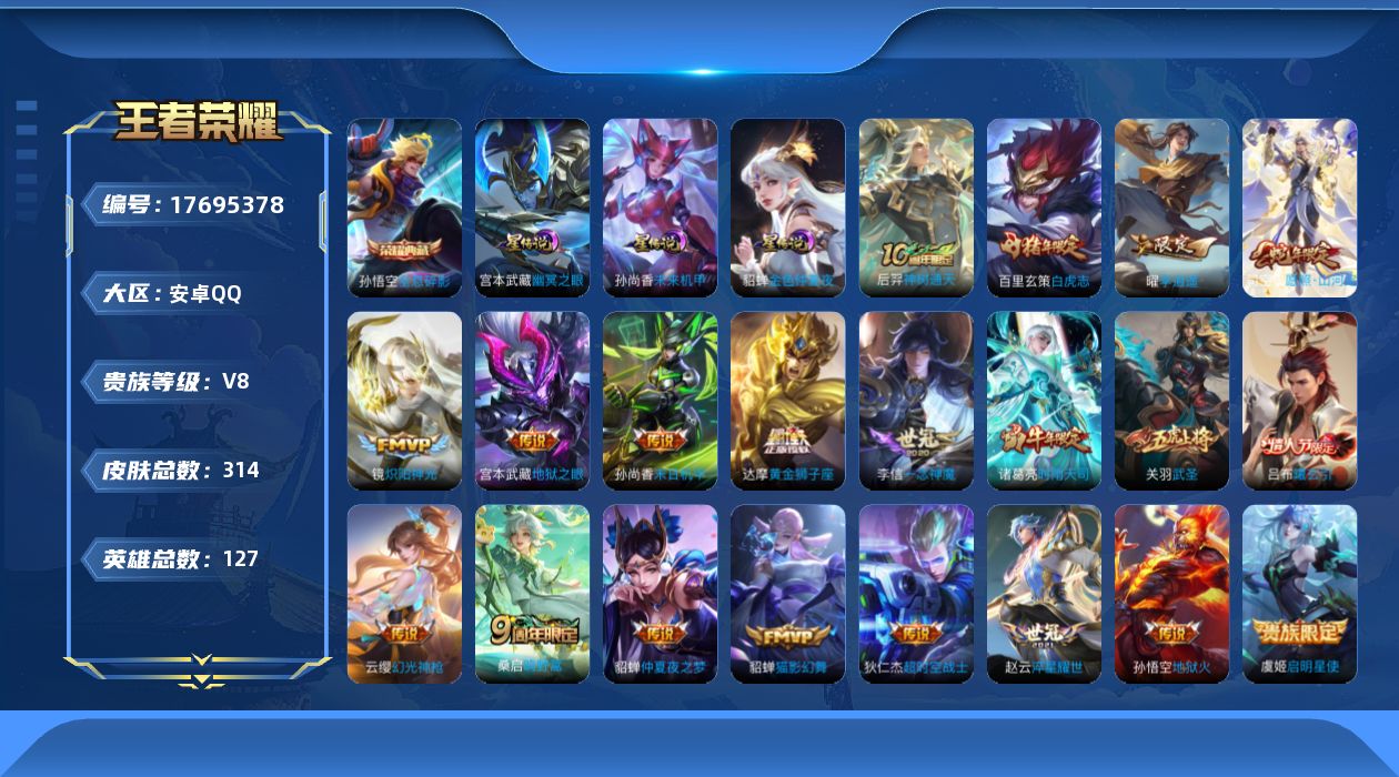 贵族等级:v8皮肤数:314传说品质21 生肖限定5 荣耀典藏1 情人节限定2 英雄数:127