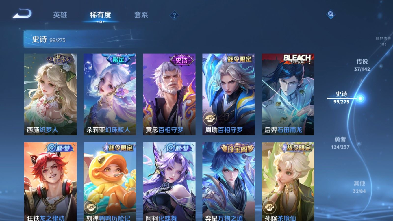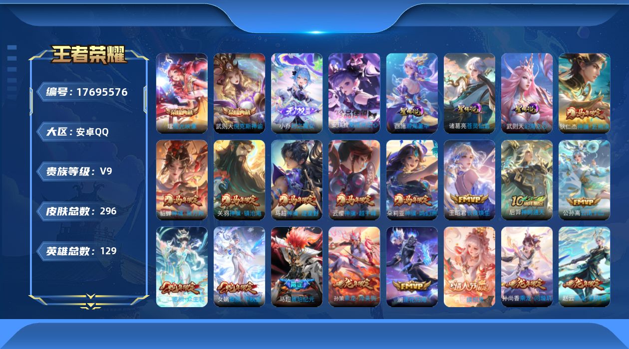 贵族等级:v9皮肤数:296情人节限定4 传说品质37 生肖限定15 荣耀典藏2 无双1 珍品传说1 英雄数:129