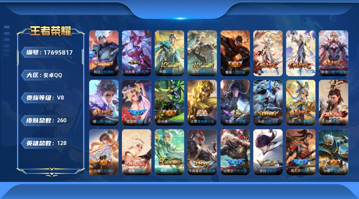传说品质_后羿_神树通天传说品质_司空震_愿照·山河定传说品质_澜_愿照·九州拓传说品质_孙悟空_齐天大圣传说品质_吕布_曦玄引传说品质_吕布_怒海麟威传说品质_马超_无双飞将传说品质_杨戬_纵目迁山传说品质_干将莫邪_久胜战神传说品质_花木兰_燃星之曲传说品质_貂蝉_遇见胡旋传说品质_貂蝉_曦玄引传说品质_李信_一念神魔传说品质_李信_山海·炽霜斩传说品质_孙尚香_末日机甲传说品质_小乔_山海·琳琅生传说品质_桑启_鸣野蒿传说品质_橘右京_枫霜尽传说品质_云缨_幻光神枪传说品质_李白_诗剑行传说品质_曹操_万灵伏威传说品质_夏洛特_浮生妄传说品质_曜_山海·苍雷引传说品质_孙策_末日机甲传说品质_狄仁杰_神器·狴犴令传说品质_达摩_黄金狮子座传说品质_虞姬_启明星使