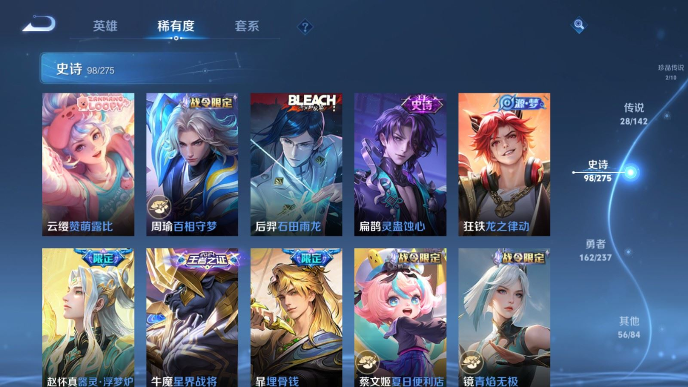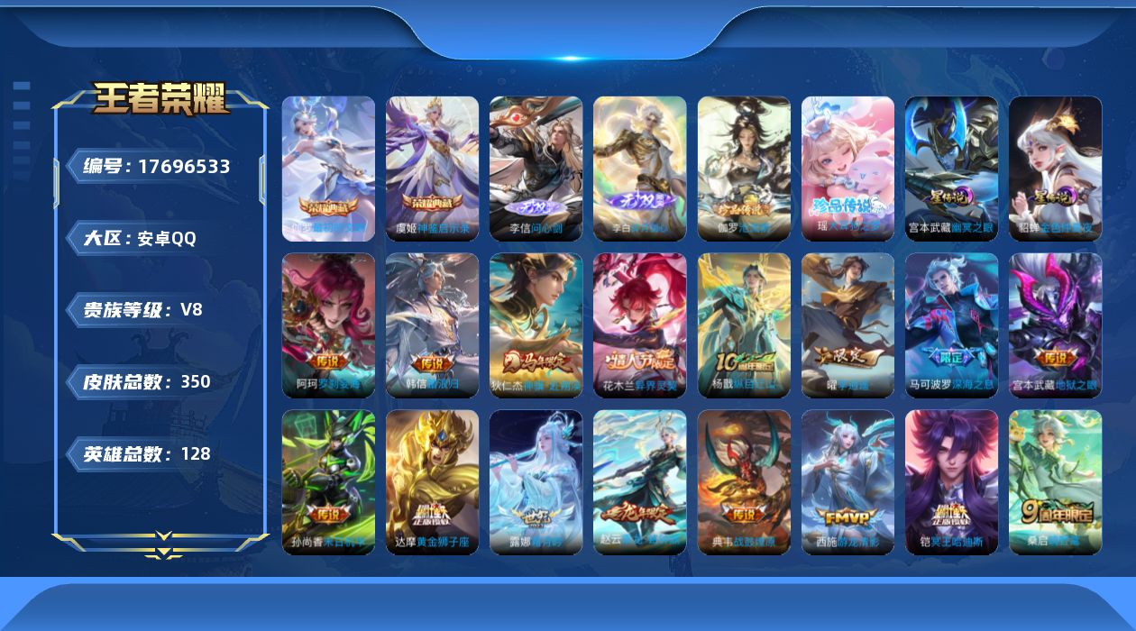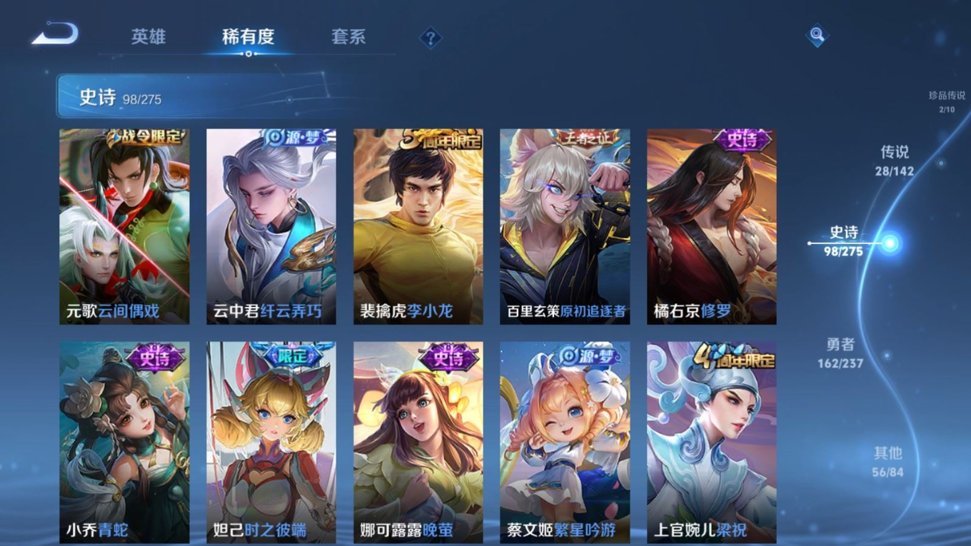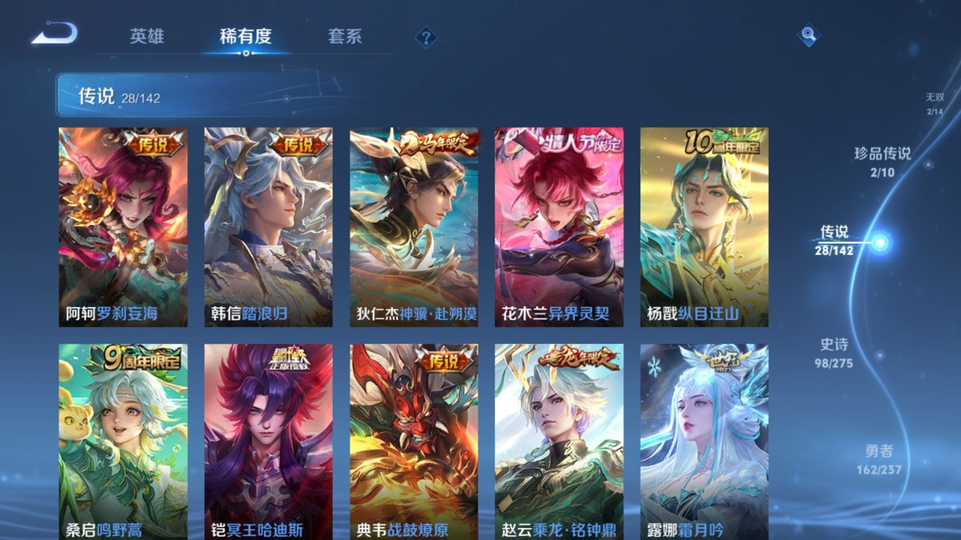 传说品质_后羿_黄金射手座传说品质_后羿_无尽星芒传说品质_典韦_战鼓燎原传说品质_孙悟空_地狱火传说品质_杨戬_纵目迁山传说品质_宫本武藏_地狱之眼传说品质_西施_游龙清影传说品质_花木兰_冠军飞将传说品质_花木兰_异界灵契传说品质_貂蝉_仲夏夜之梦传说品质_孙尚香_末日机甲传说品质_阿轲_罗刹妄海传说品质_桑启_鸣野蒿传说品质_露娜_霜月吟传说品质_东皇太一_灼幽烈阳传说品质_张良_黄金白羊座传说品质_马可波罗_深海之息传说品质_伽罗_炽翼辉光传说品质_曜_李逍遥 传说品质_狄仁杰_超时空战士传说品质_狄仁杰_神骥·赴朔漠传说品质_达摩_黄金狮子座传说品质_铠_冥王哈迪斯传说品质_虞姬_启明星使传说品质_韩信_踏浪归传说品质_赵云_乘龙·铭钟鼎传说品质_赵云_淬星耀世传说品质_王昭君_乞巧织情