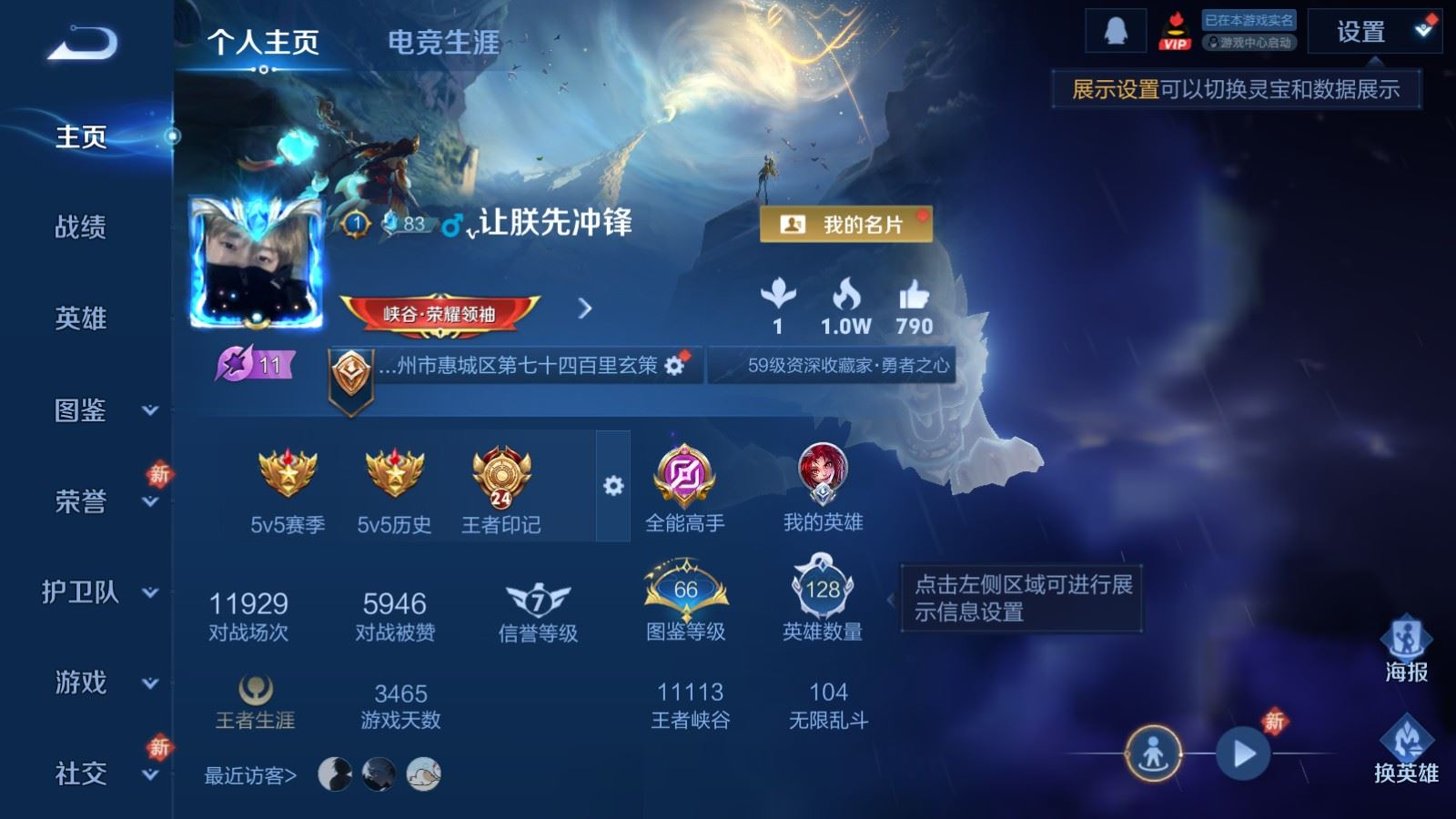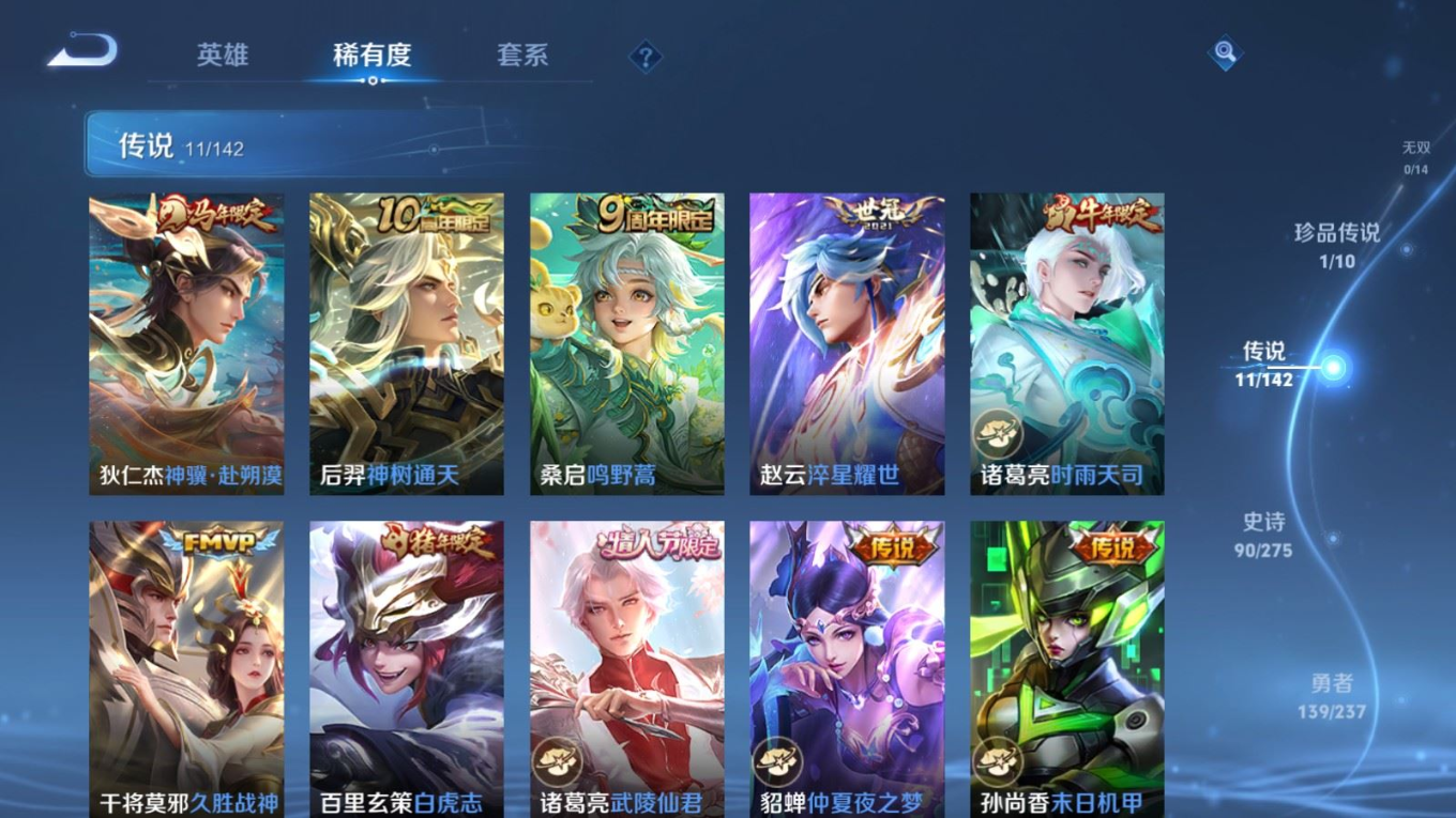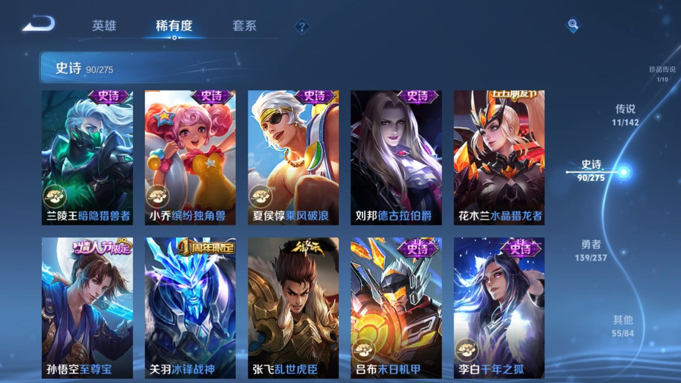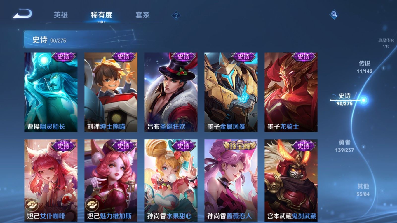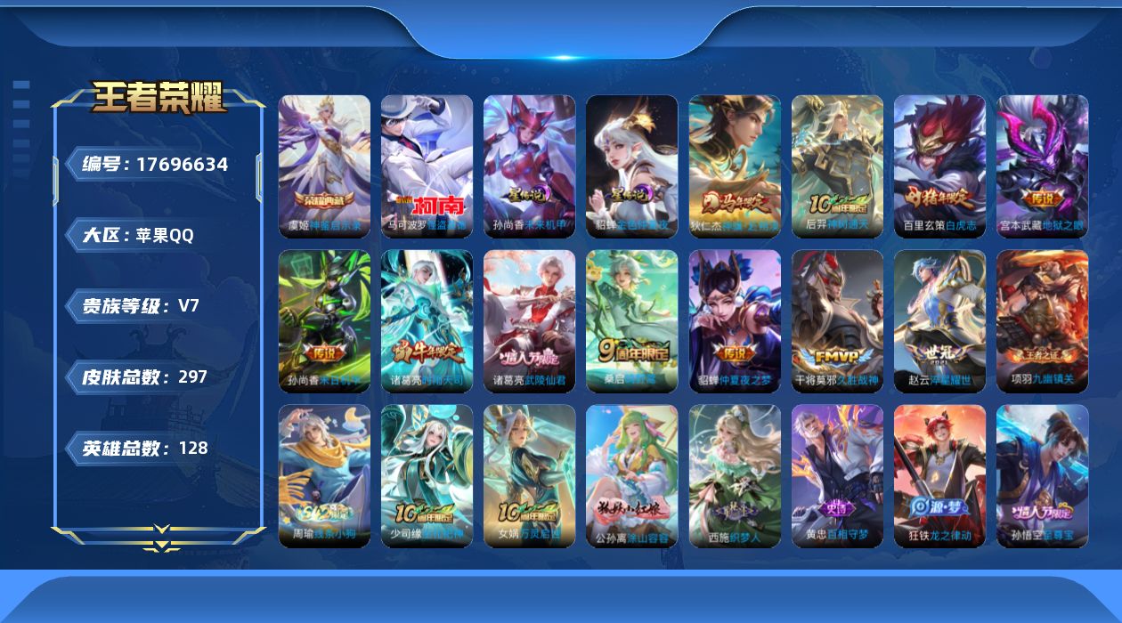 贵族等级:v7皮肤数:297传说品质11 情人节限定4 生肖限定5 珍品传说1 荣耀典藏1 英雄数:128