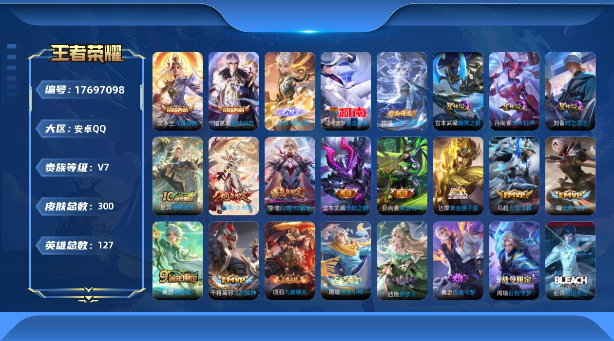 贵族等级:v7皮肤数:300传说品质10 生肖限定3 荣耀典藏2 珍品传说2 无双1 英雄数:127