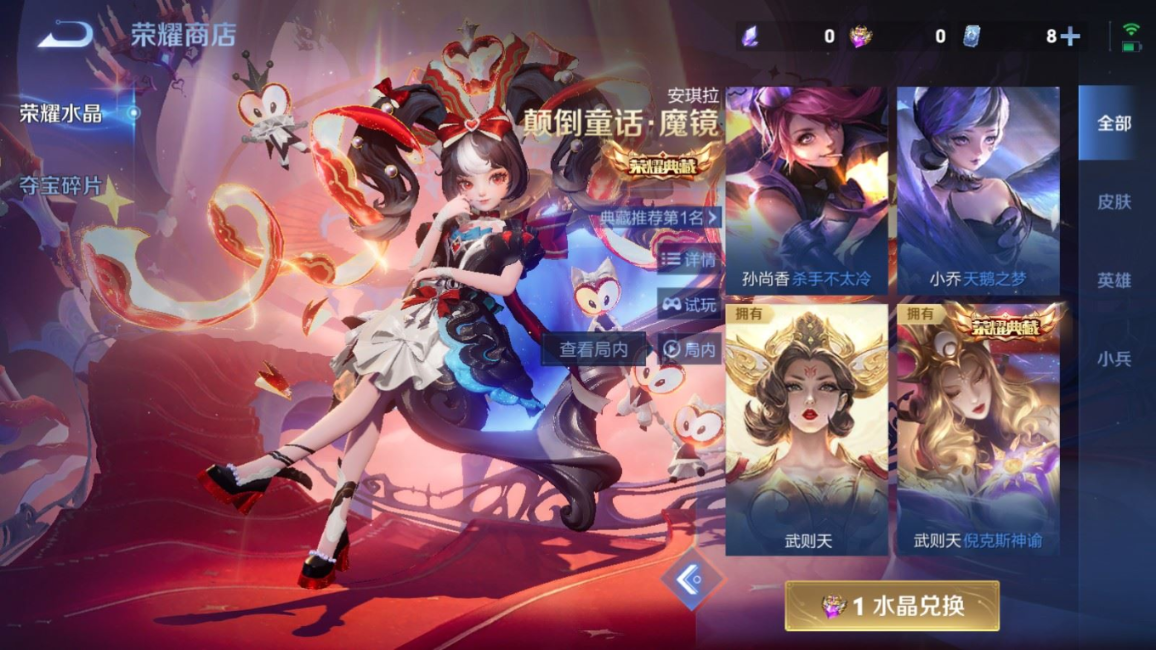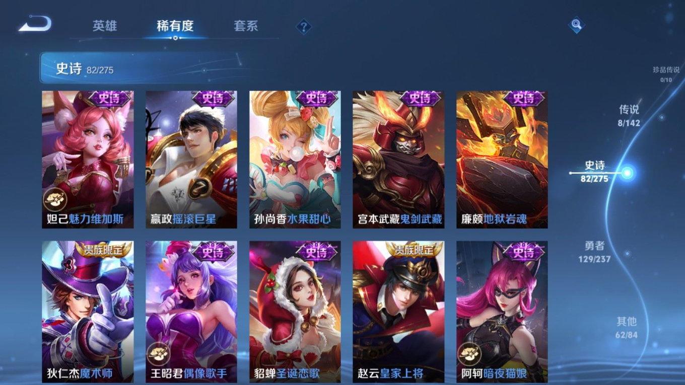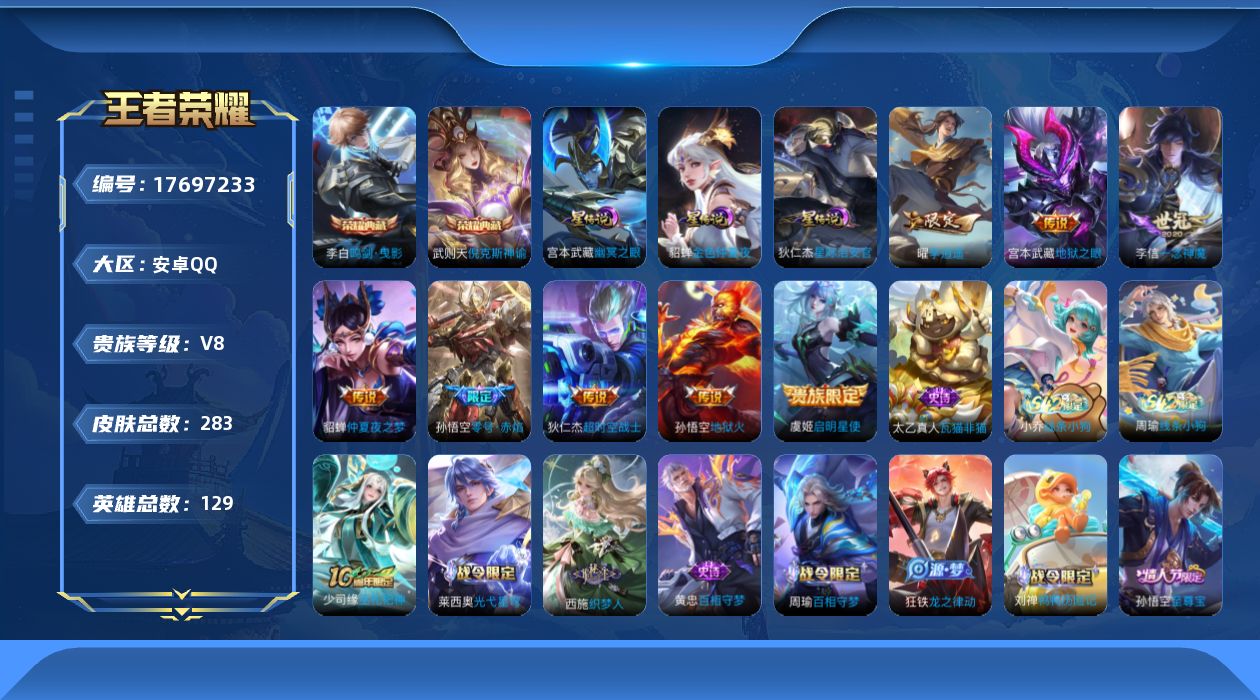 贵族等级:v8皮肤数:283情人节限定3 传说品质8 生肖限定1 荣耀典藏2 英雄数:129