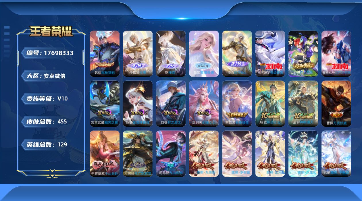 贵族等级:v10皮肤数:455生肖限定19 传说品质60 无双4 情人节限定3 珍品传说3 荣耀典藏1 英雄数:129