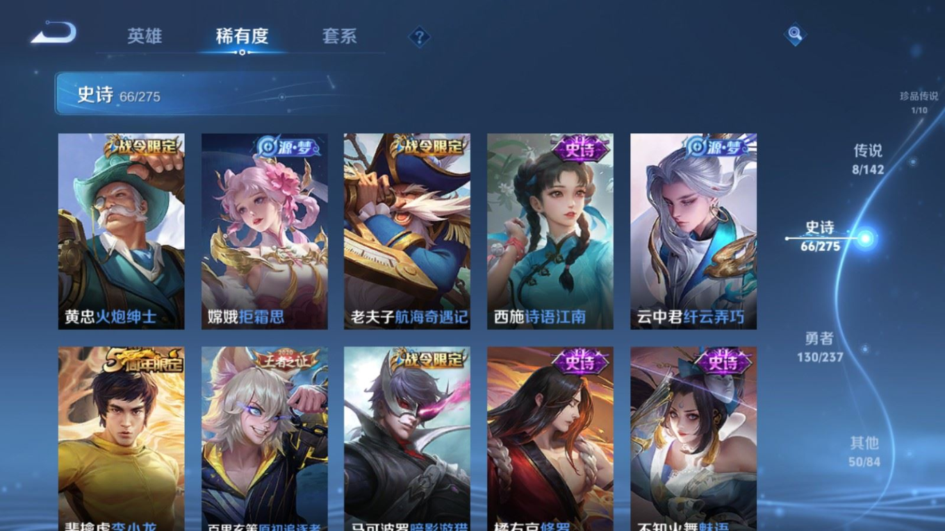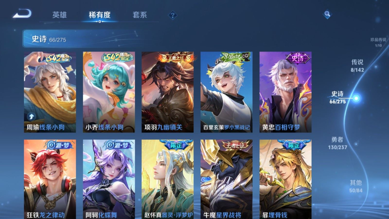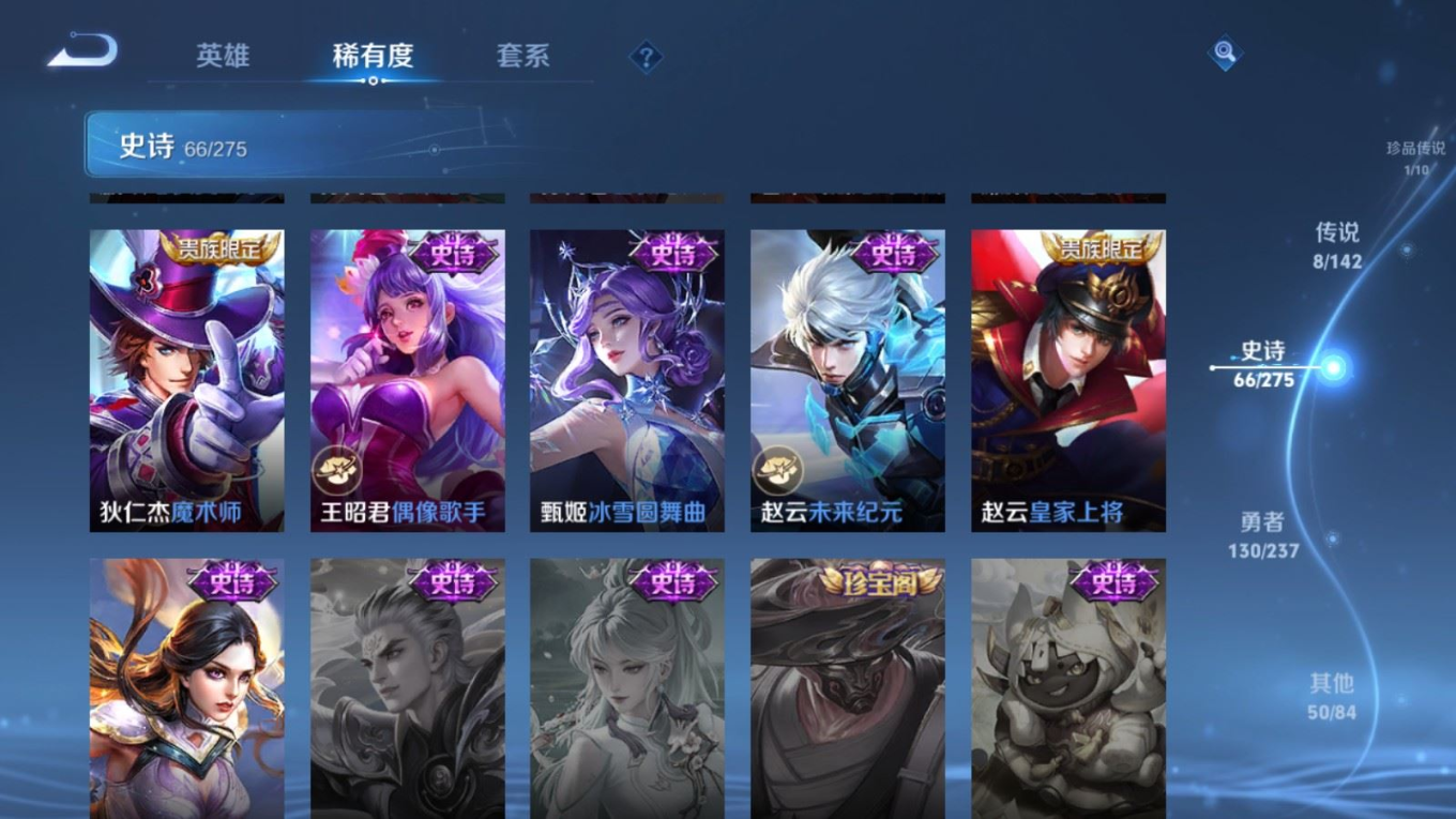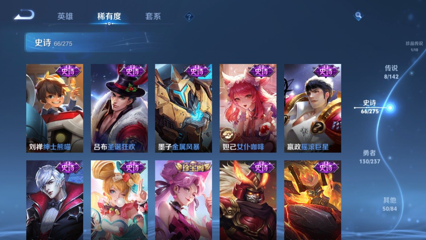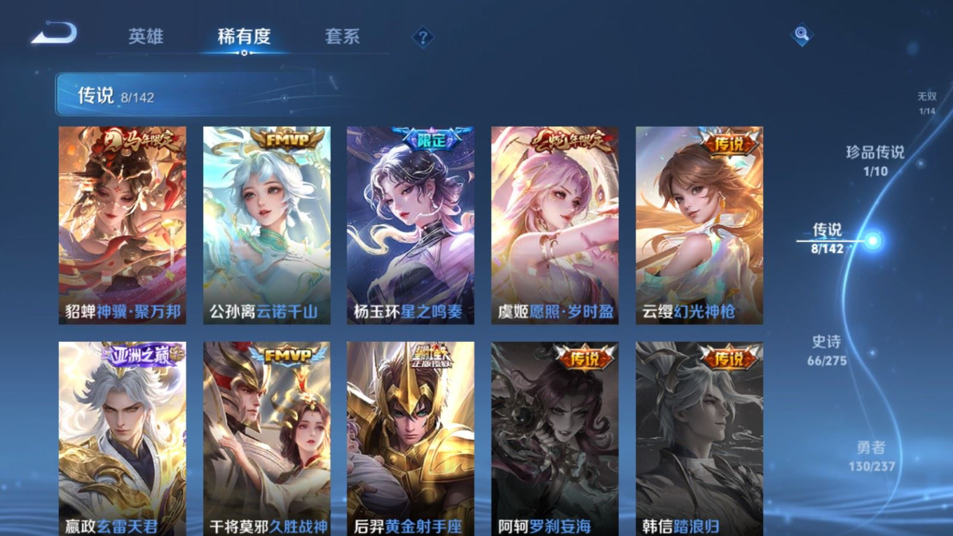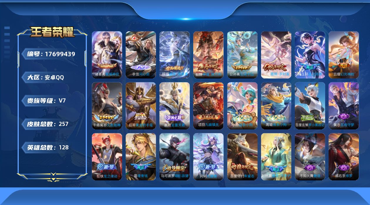 贵族等级:v7皮肤数:259传说品质8 荣耀典藏1 生肖限定3 无双1 珍品传说1 英雄数:128
