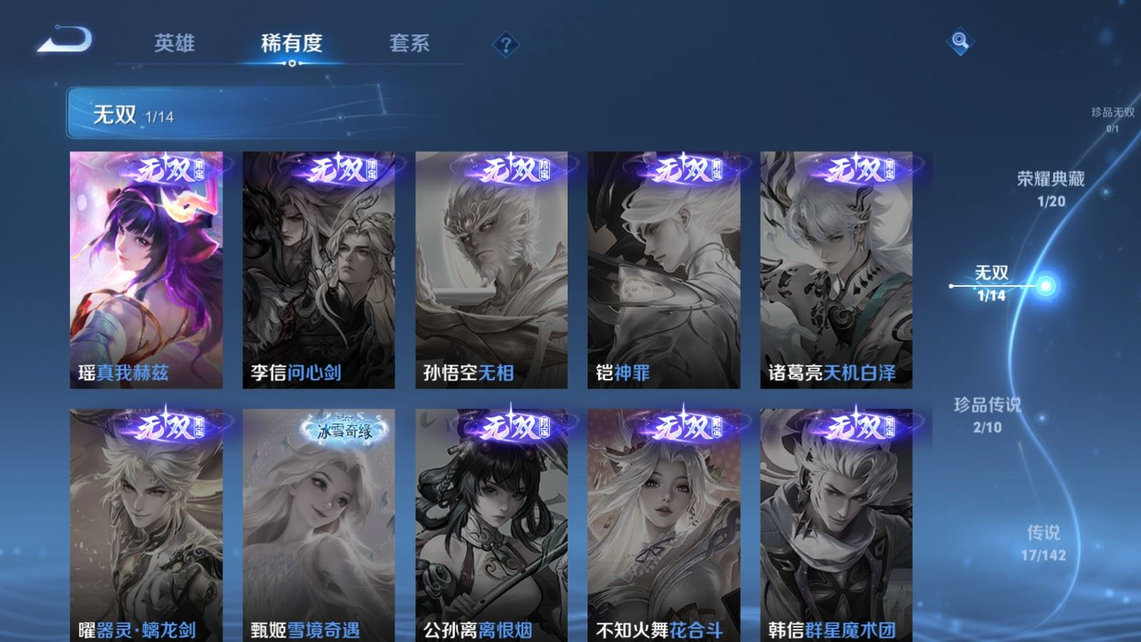 贵族等级:v7皮肤数:201传说品质17 生肖限定7 情人节限定4 珍品传说2 无双1 荣耀典藏1 英雄数:116