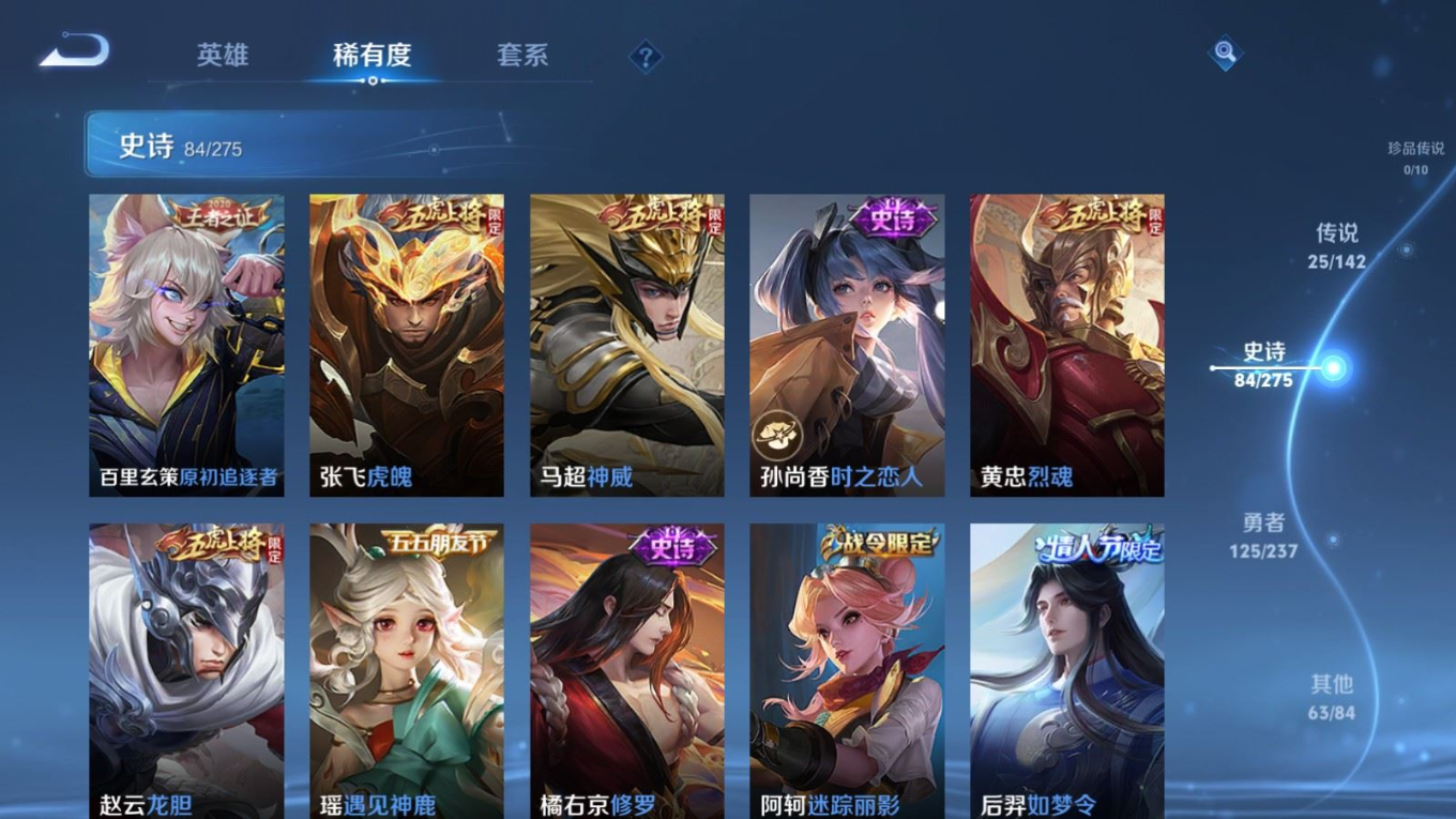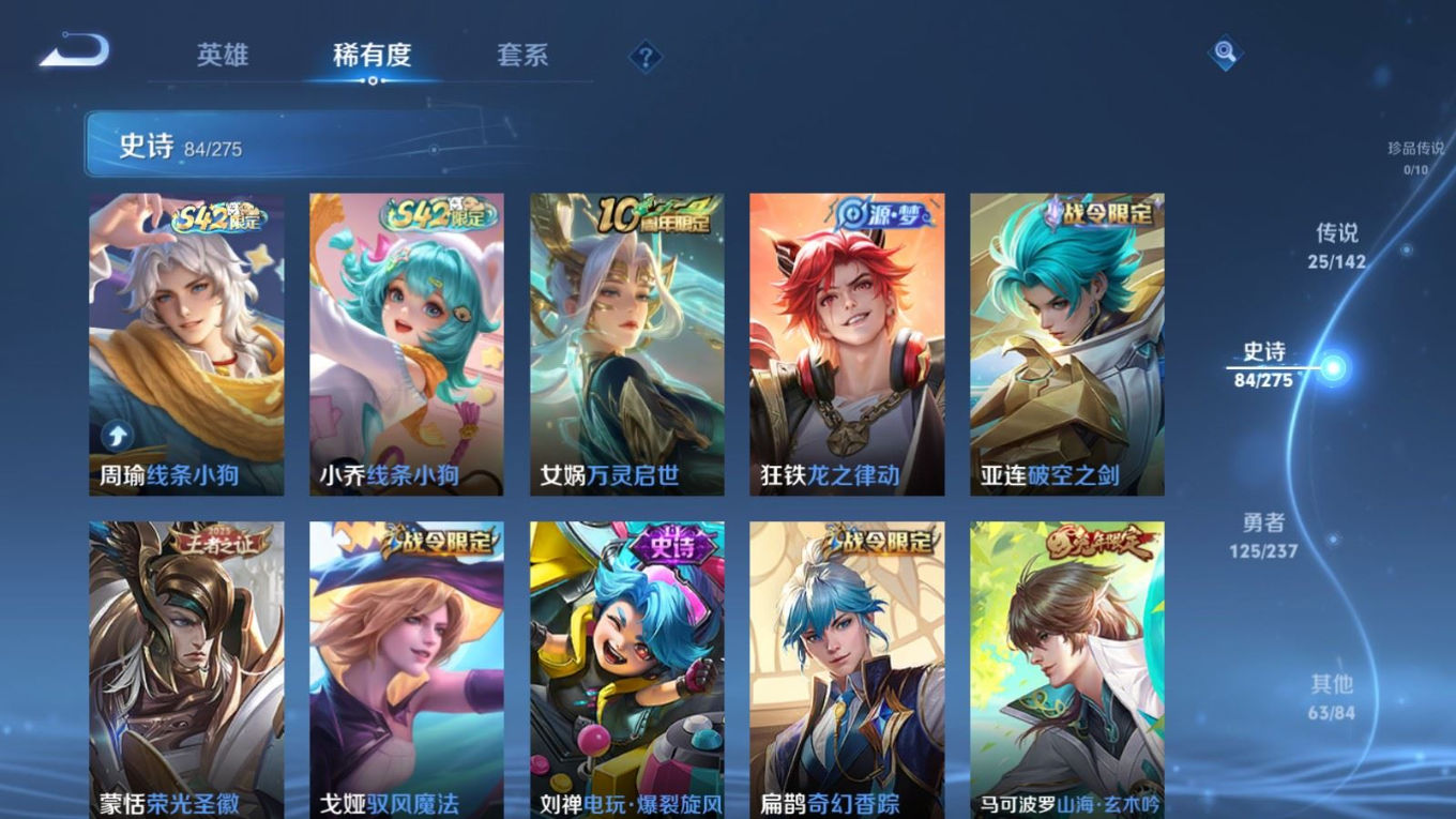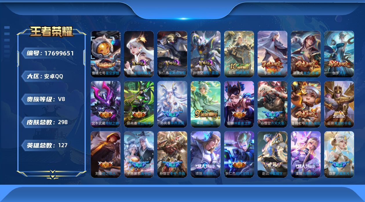 贵族等级:v8皮肤数:298传说品质25 情人节限定4 生肖限定9 荣耀典藏1 英雄数:127