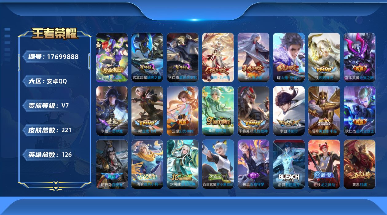 贵族等级:v7皮肤数:221传说品质13 情人节限定2 生肖限定4 珍品传说1 英雄数:126