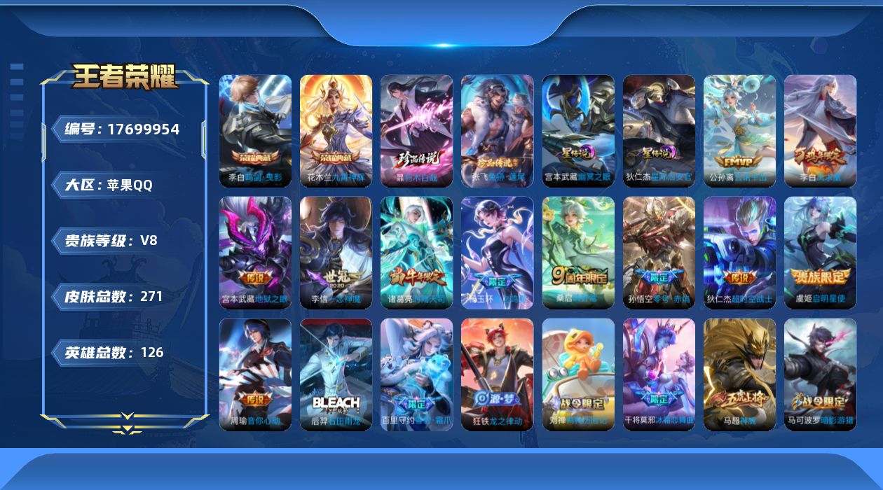 贵族等级:v8皮肤数:271传说品质11 生肖限定2 珍品传说2 荣耀典藏2 情人节限定1 英雄数:126