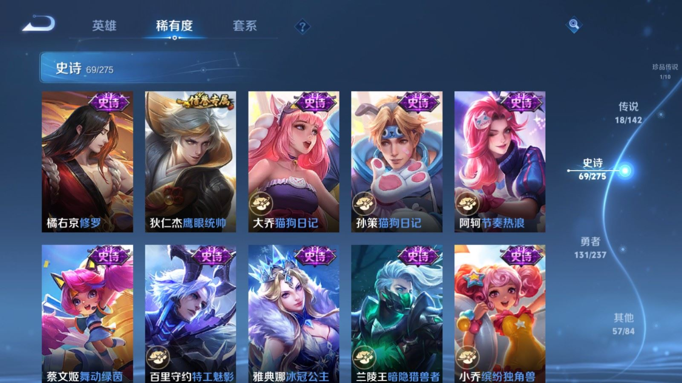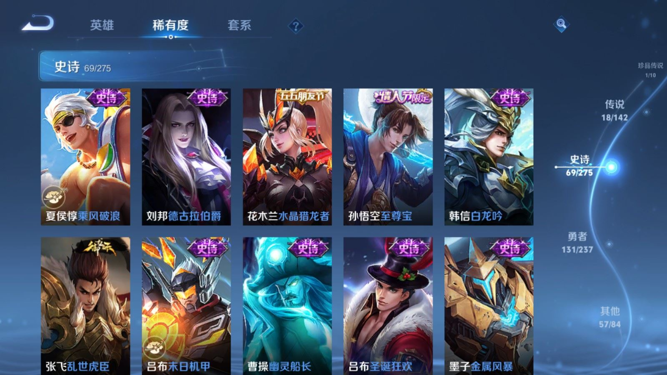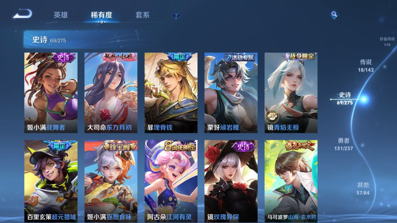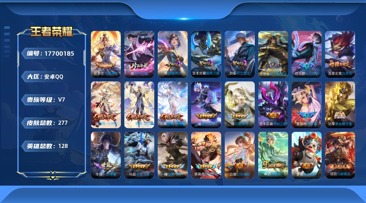贵族等级:v7皮肤数:277传说品质18 生肖限定5 情人节限定1 珍品传说1 荣耀典藏1 英雄数:128