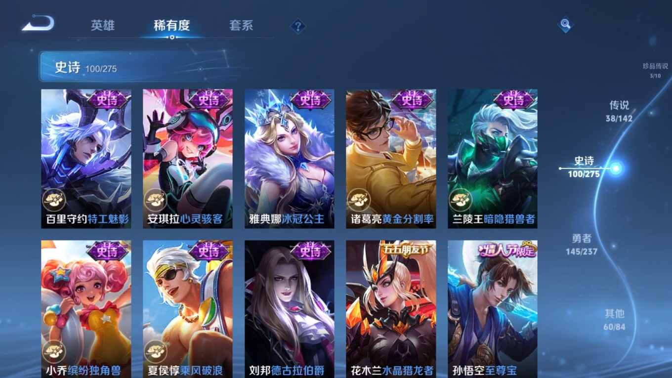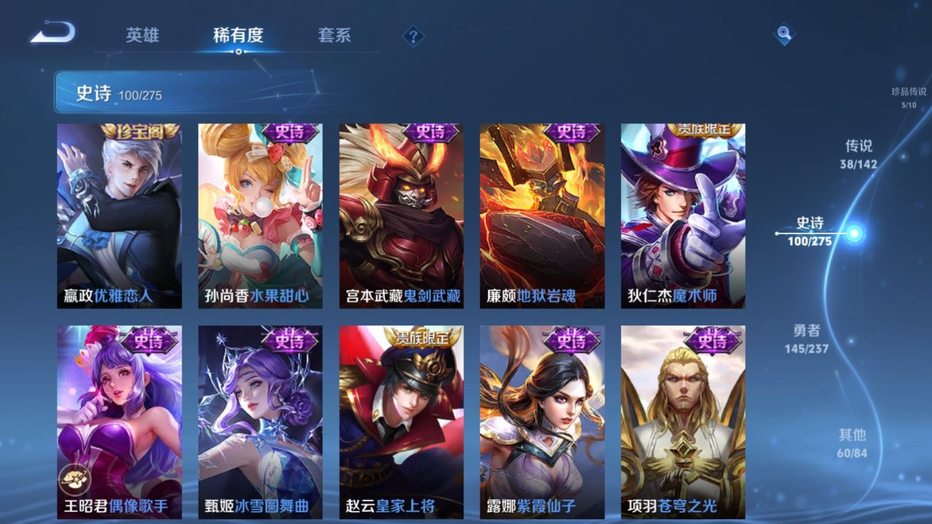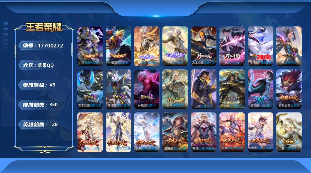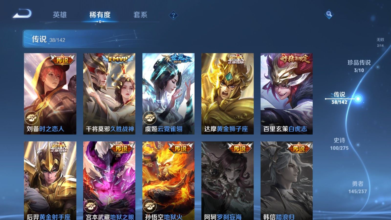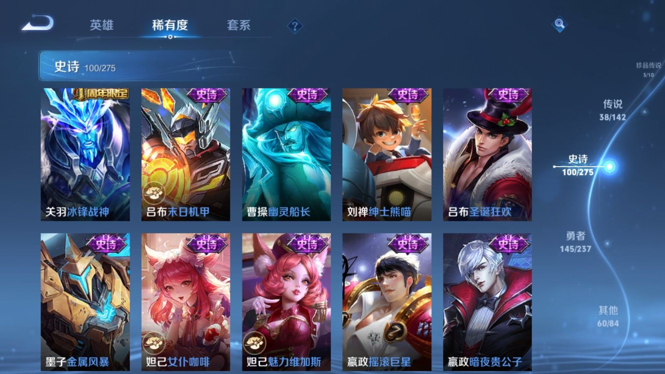 贵族等级:v9皮肤数:352传说品质38 生肖限定15 情人节限定3 荣耀典藏2 珍品传说3 无双2 英雄数:128