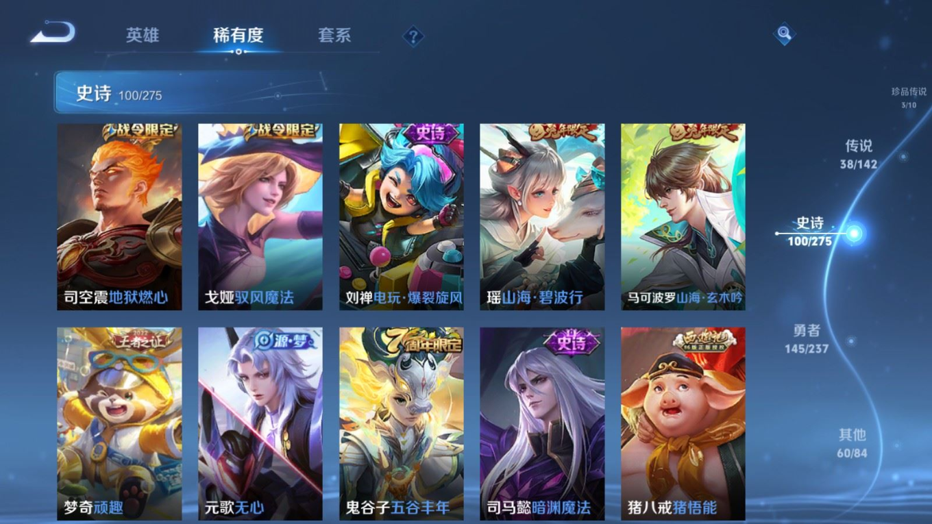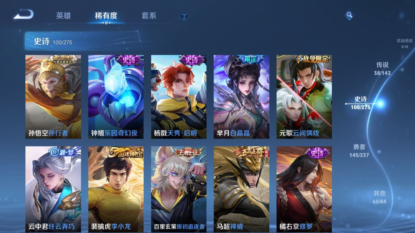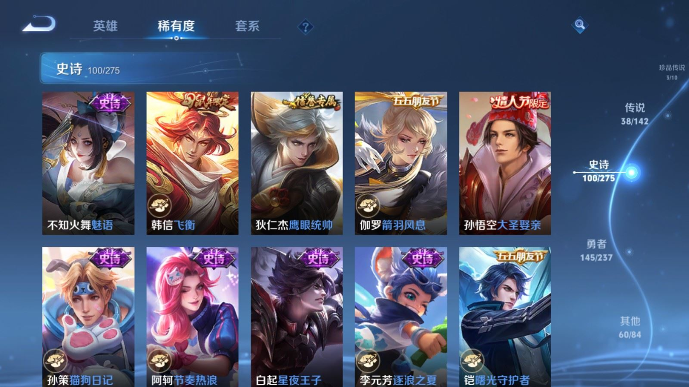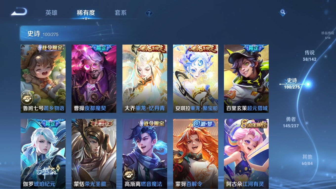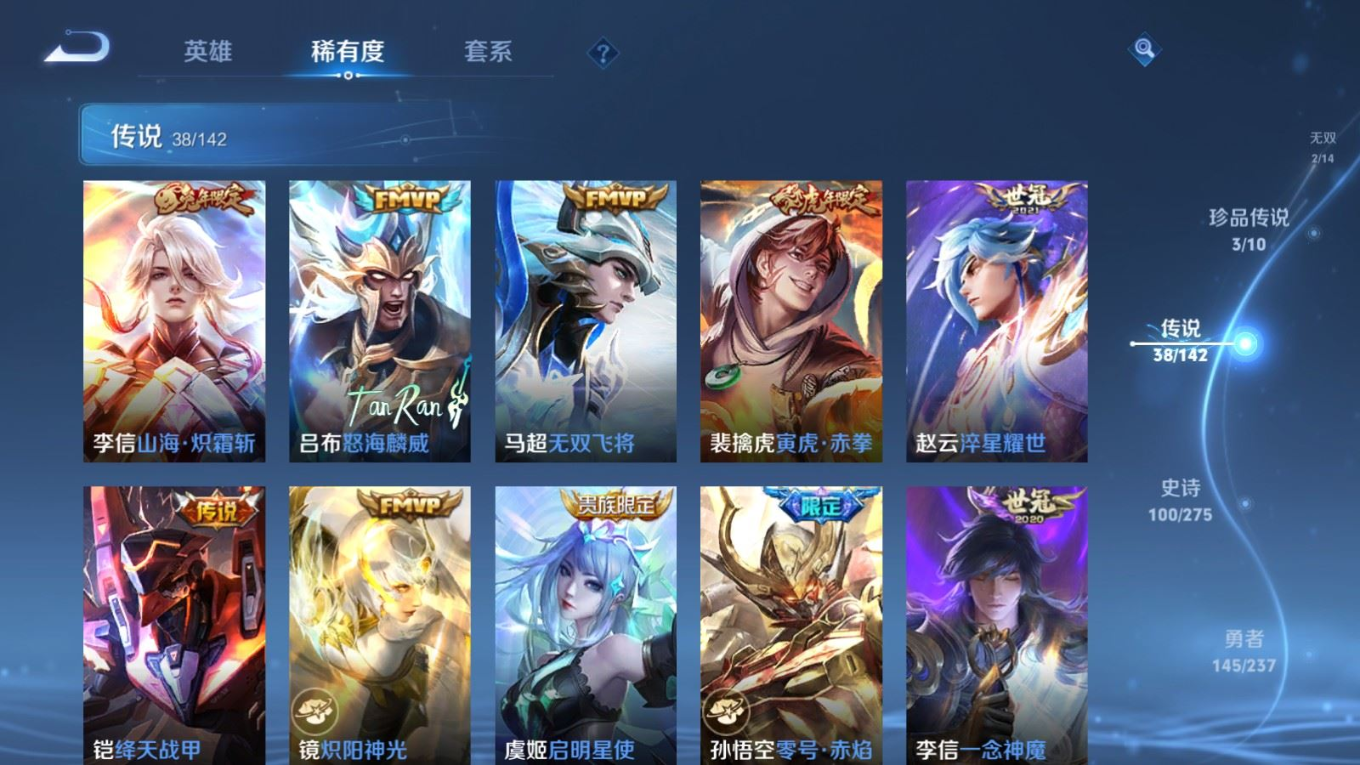 贵族等级:v9皮肤数:352传说品质38 生肖限定15 情人节限定3 荣耀典藏2 珍品传说3 无双2 英雄数:128