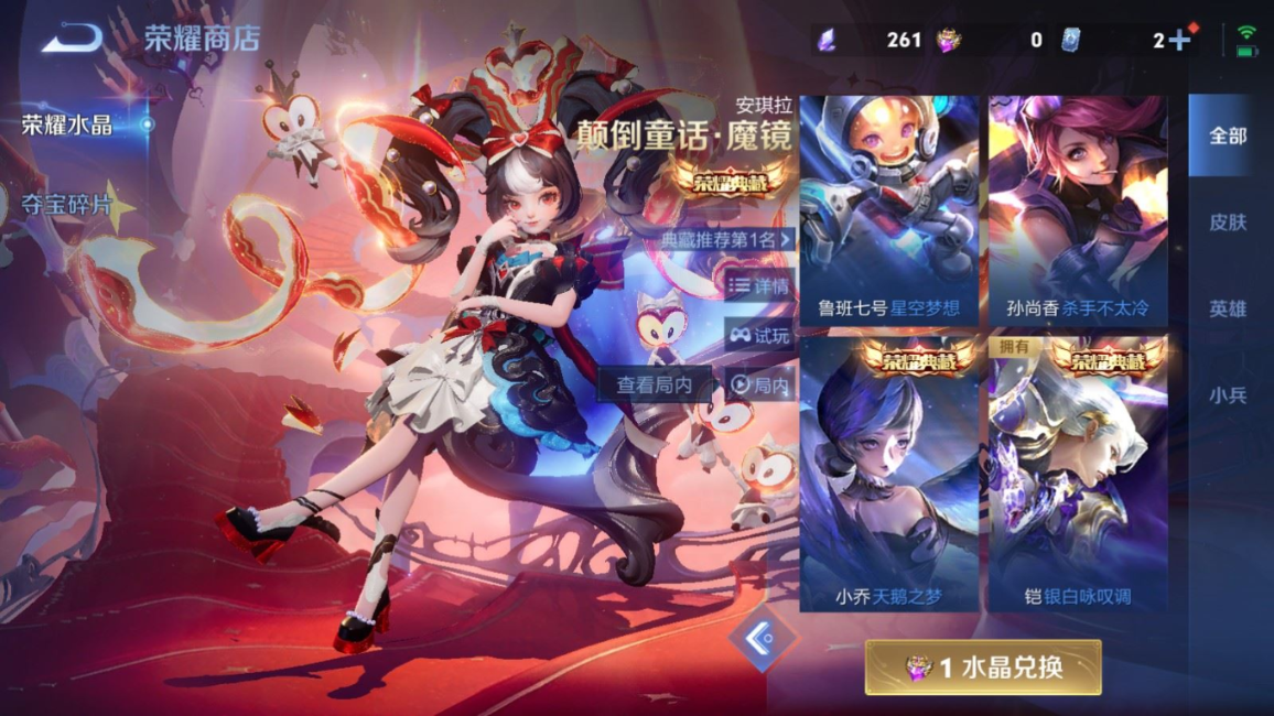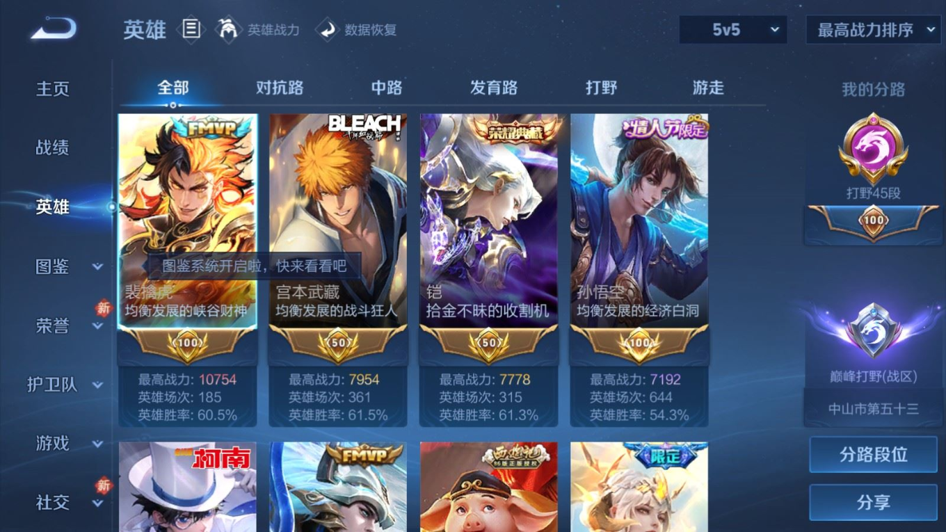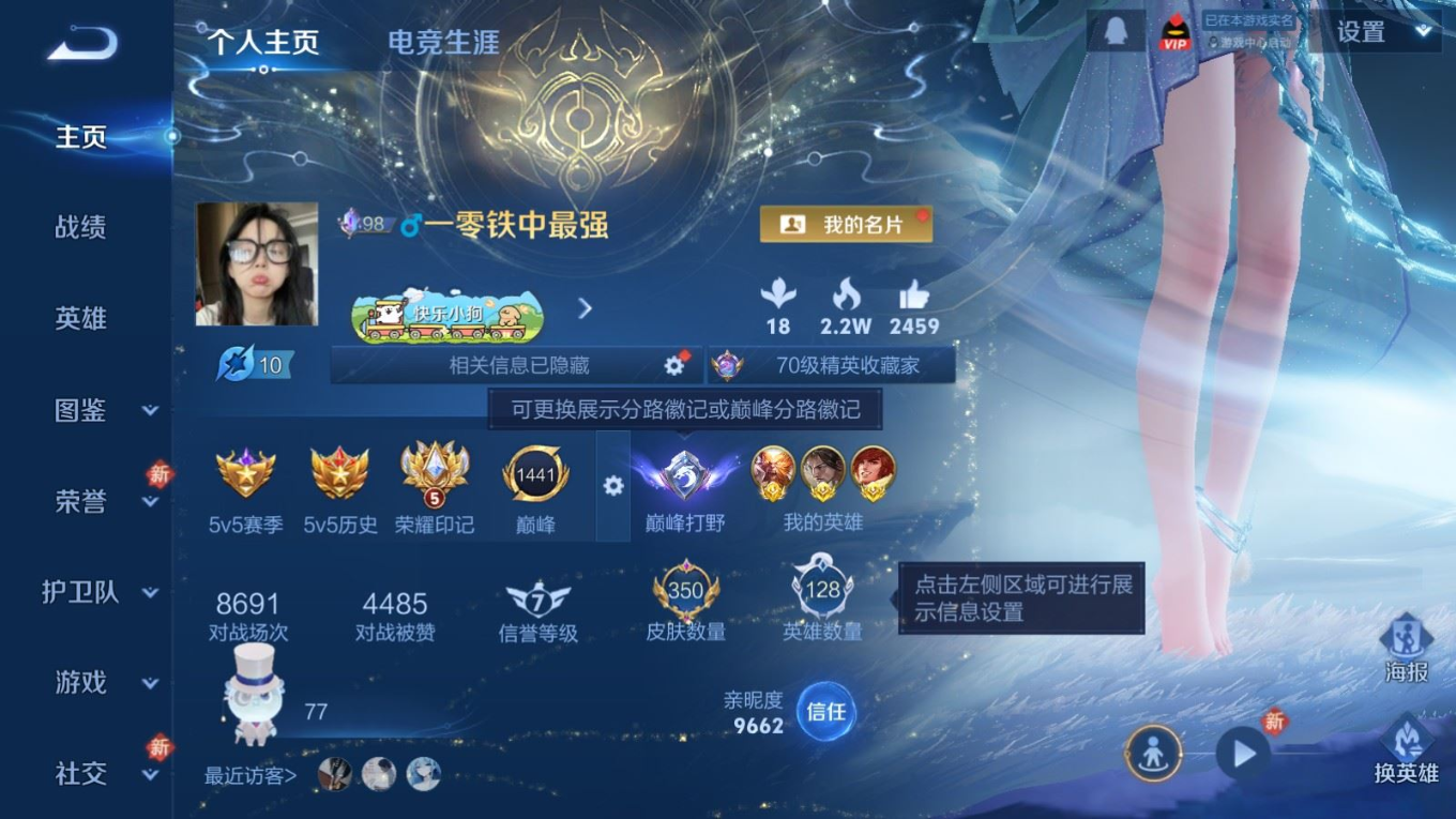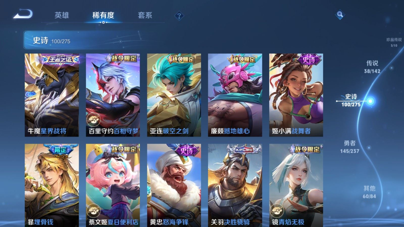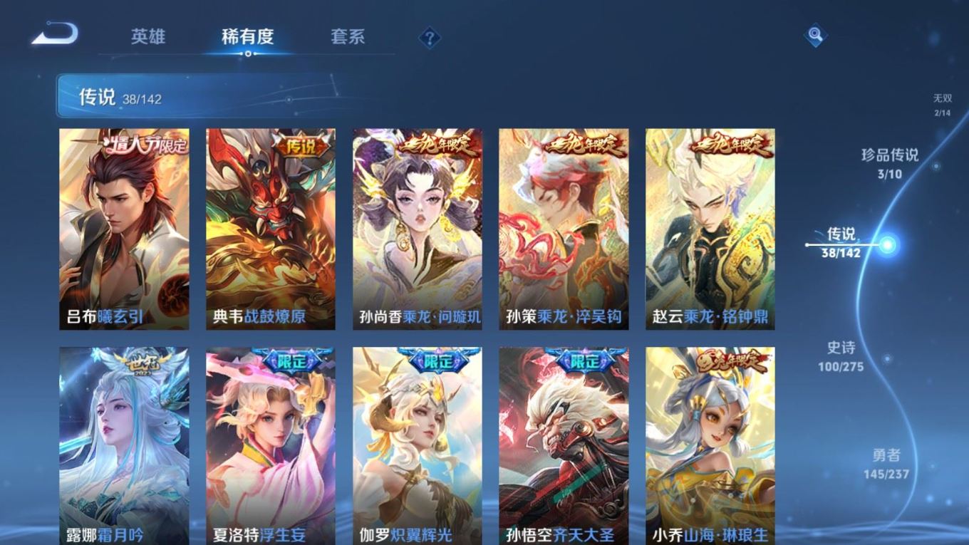 贵族等级:v9皮肤数:352传说品质38 生肖限定15 情人节限定3 荣耀典藏2 珍品传说3 无双2 英雄数:128