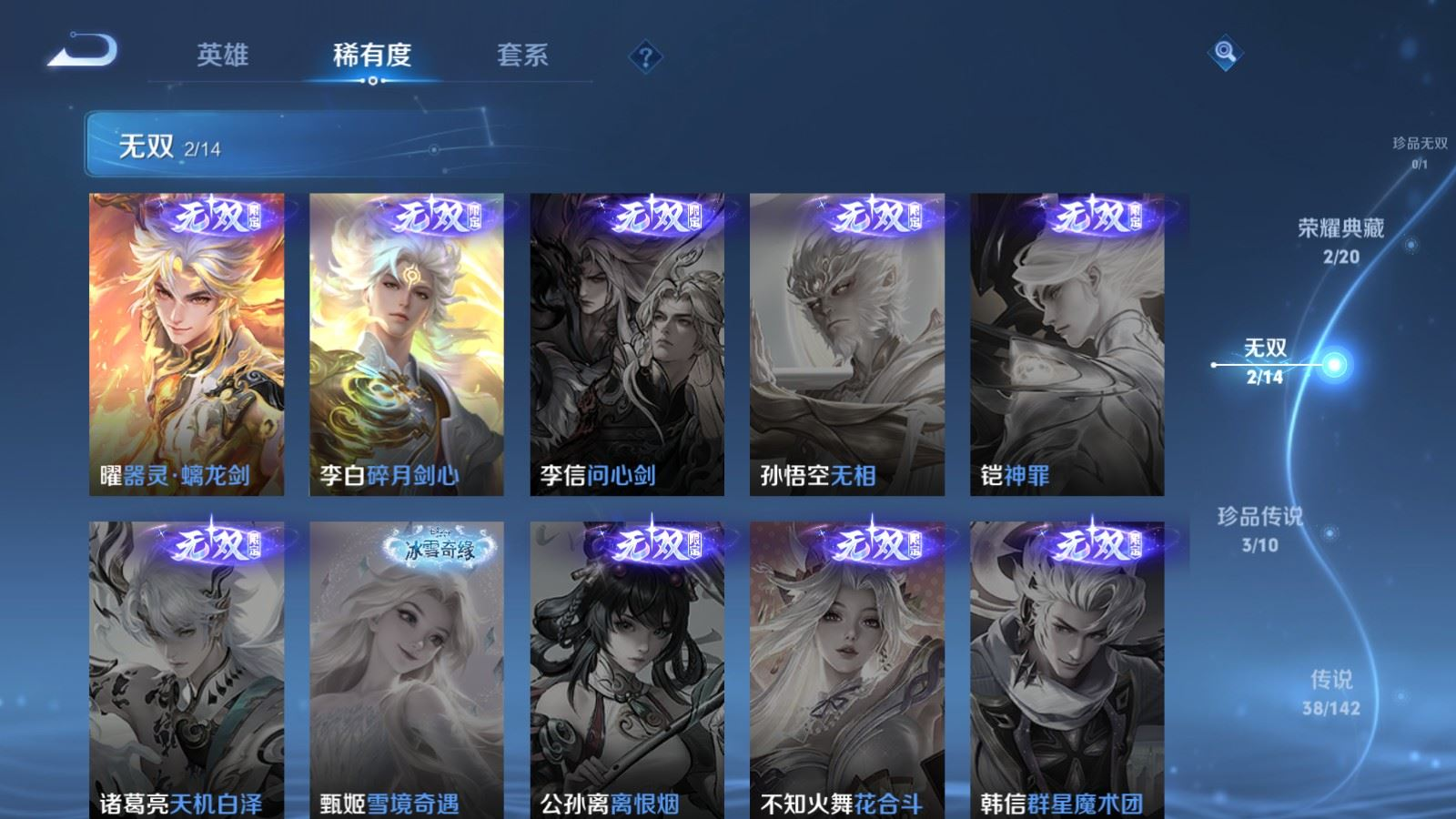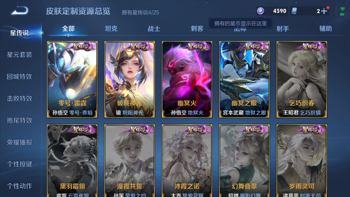 传说品质_后羿_黄金射手座传说品质_后羿_神树通天传说品质_司空震_愿照·山河定传说品质_澜_愿照·九州拓传说品质_典韦_战鼓燎原传说品质_孙悟空_零号·赤焰传说品质_孙悟空_齐天大圣传说品质_孙悟空_地狱火传说品质_吕布_曦玄引传说品质_吕布_怒海麟威传说品质_马超_无双飞将传说品质_干将莫邪_久胜战神传说品质_宫本武藏_地狱之眼传说品质_元歌_诡秘之主传说品质_镜_炽阳神光传说品质_李信_一念神魔传说品质_李信_山海·炽霜斩传说品质_孙尚香_乘龙·问璇玑传说品质_小乔_山海·琳琅生传说品质_司马懿_九山相柳传说品质_桑启_鸣野蒿传说品质_露娜_霜月吟传说品质_刘备_时之恋人传说品质_女娲_愿照·千秋盛传说品质_大司命_死亡执政官传说品质_伽罗_炽翼辉光传说品质_夏洛特_浮生妄传说品质_孙策_乘龙·淬吴钩传说品质_达摩_黄金狮子座传说品质_铠_绛天战甲传说品质_虞姬_云霓雀翎传说品质_虞姬_启明星使传说品质_嬴政_玄雷天君传说品质_百里玄策_白虎志传说品质_赵云_乘龙·铭钟鼎传说品质_赵云_淬星耀世传说品质_裴擒虎_寅虎·赤拳传说品质_裴擒虎_祥瑞亨通