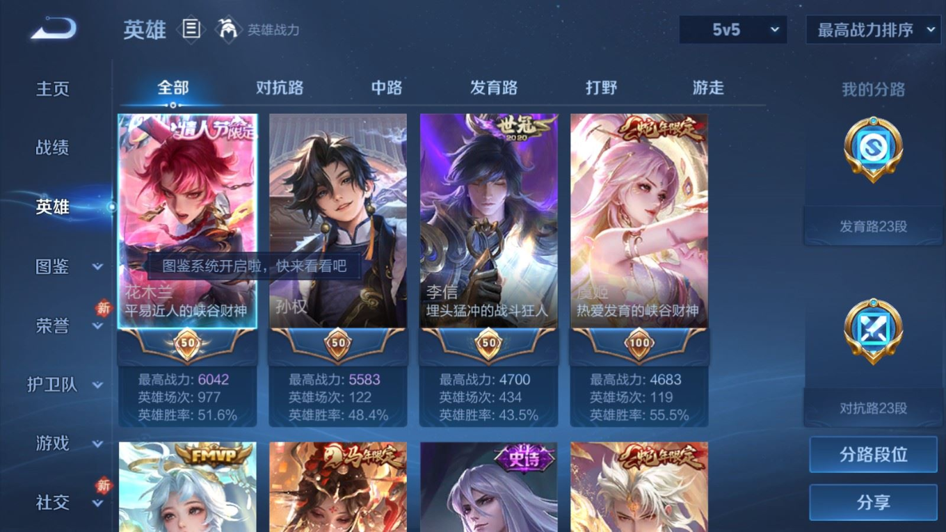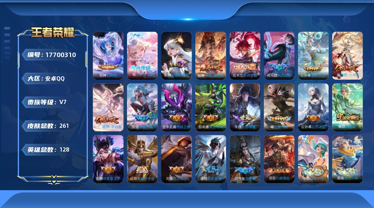贵族等级:v7皮肤数:261传说品质17 生肖限定3 情人节限定1 荣耀典藏1 珍品传说1 英雄数:128