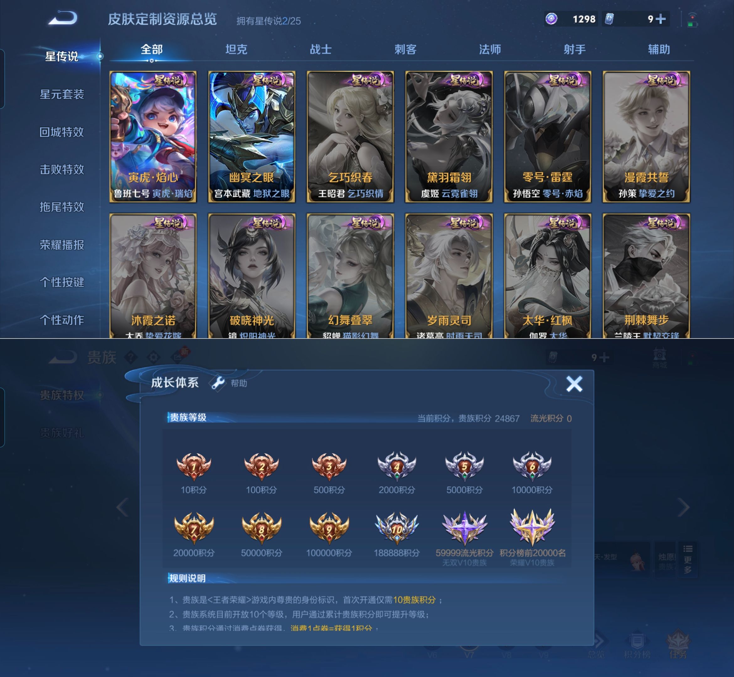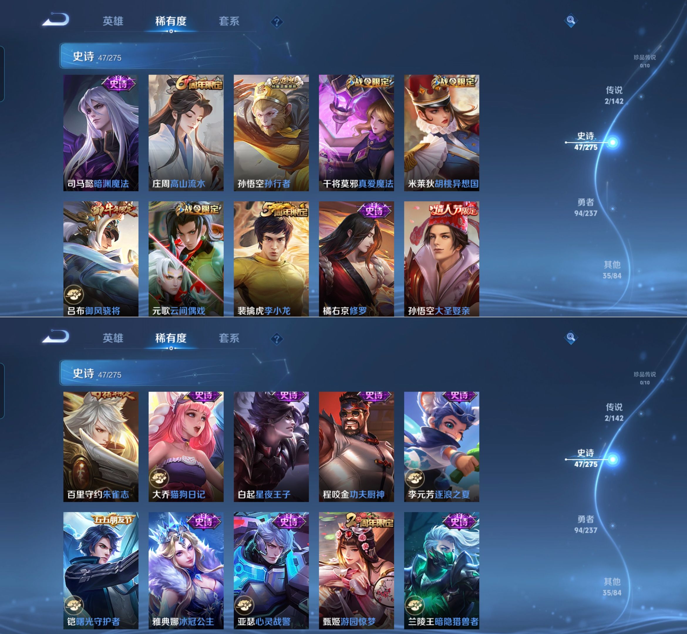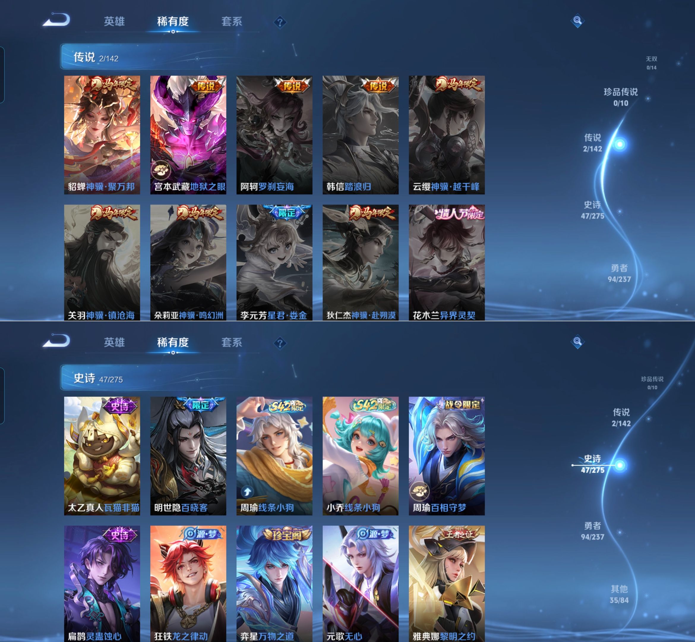 贵族等级:v4皮肤数:180情人节限定1 荣耀典藏1 生肖限定3 传说品质2 英雄数:127