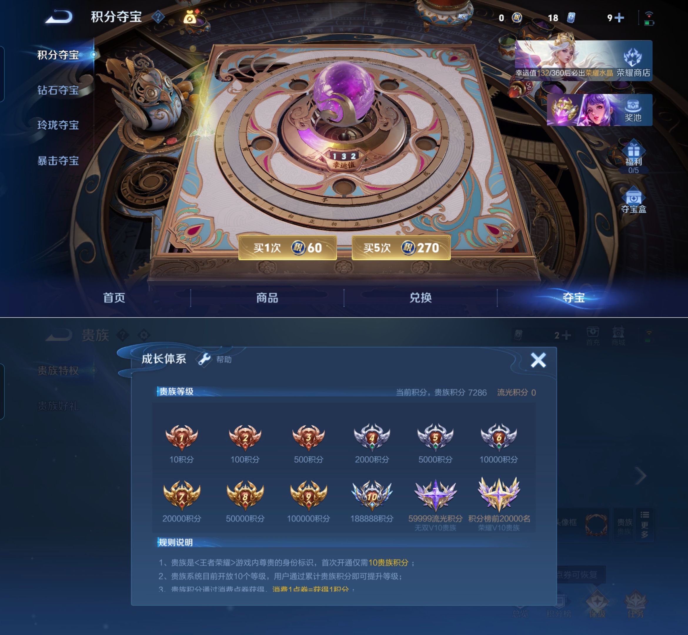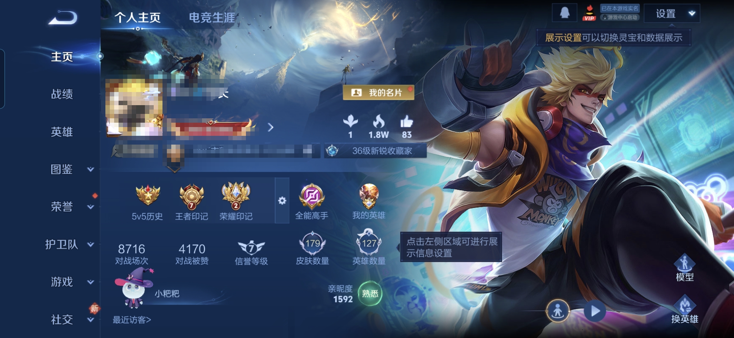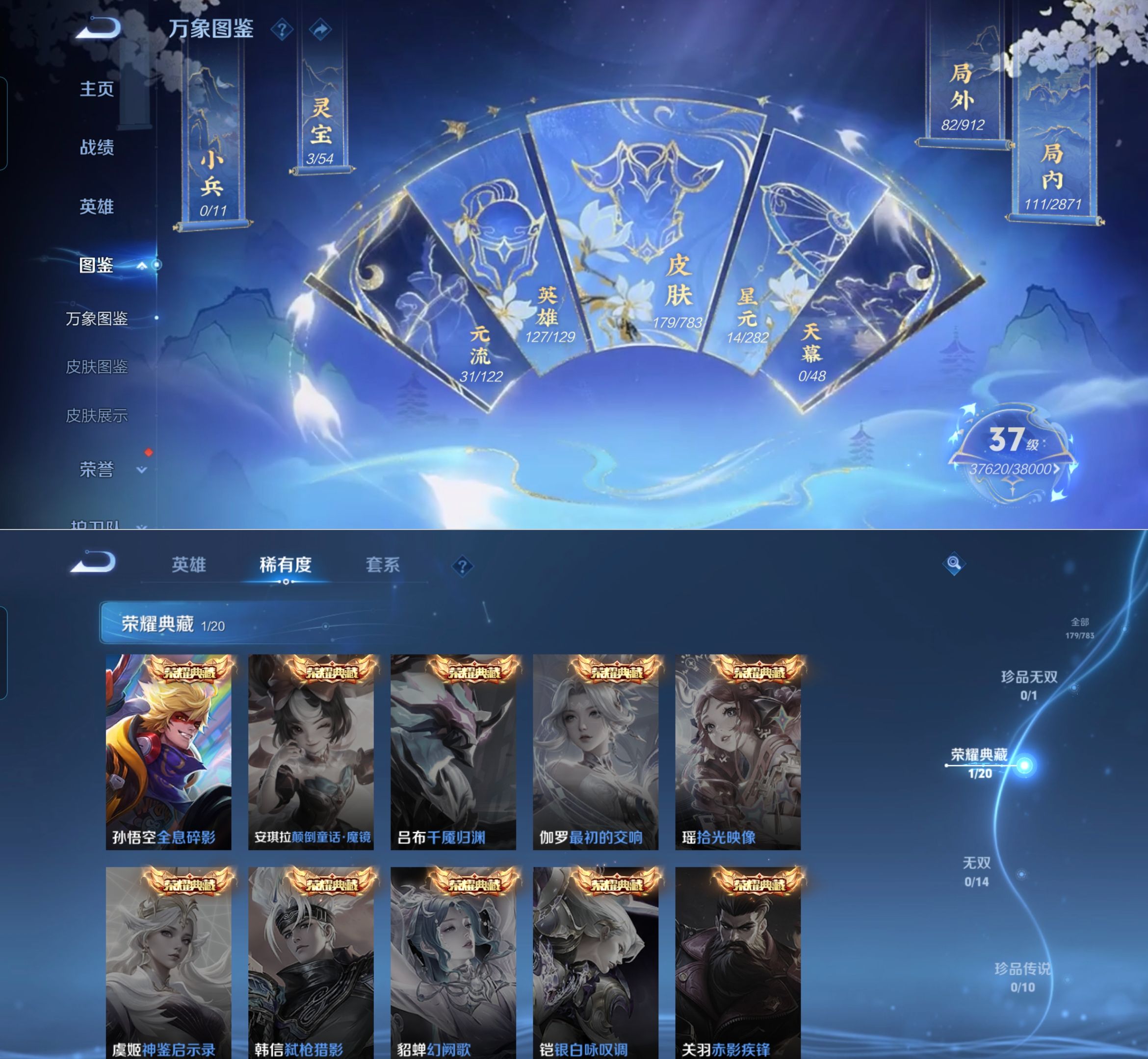 贵族等级:v4皮肤数:180情人节限定1 荣耀典藏1 生肖限定3 传说品质2 英雄数:127