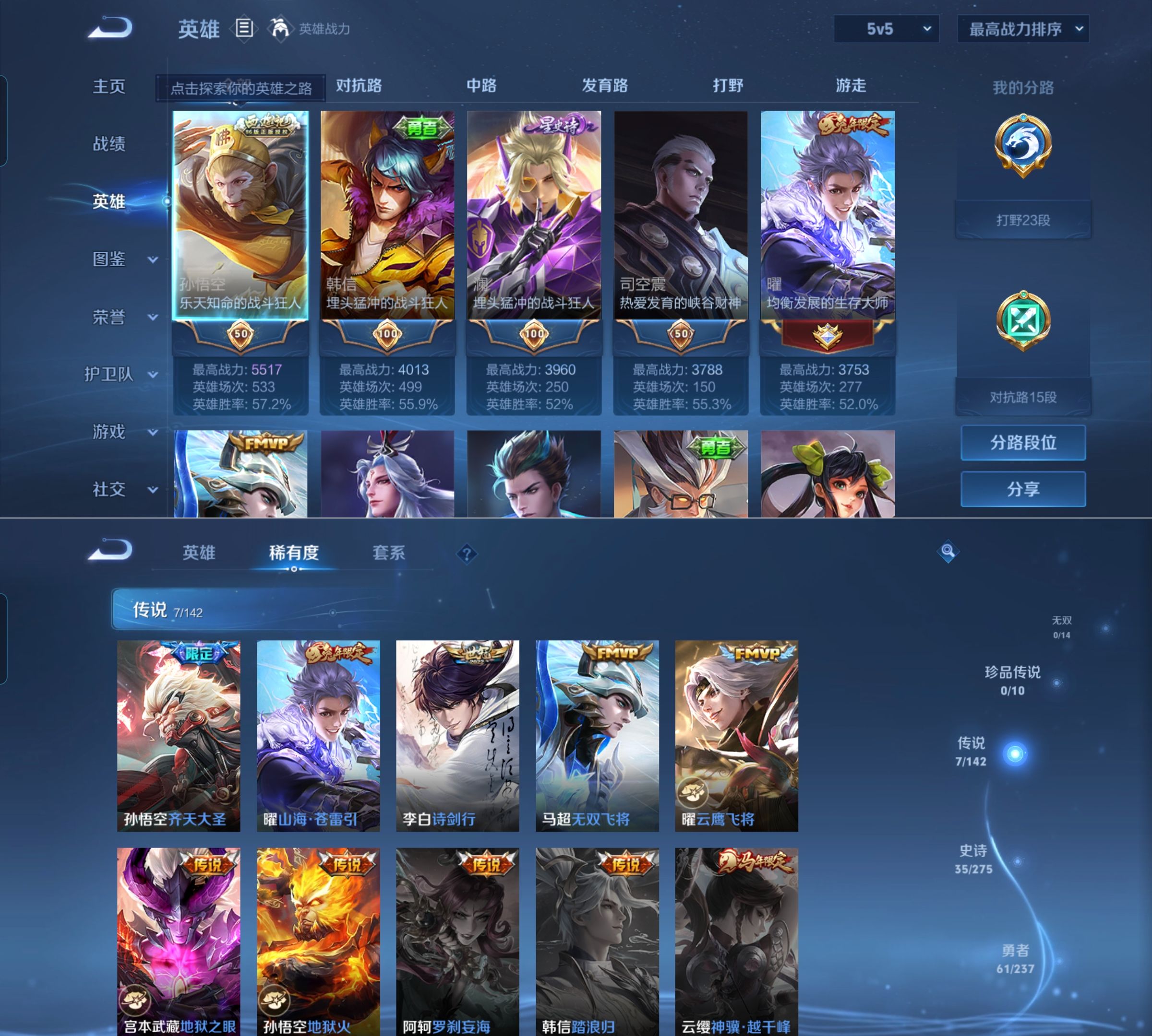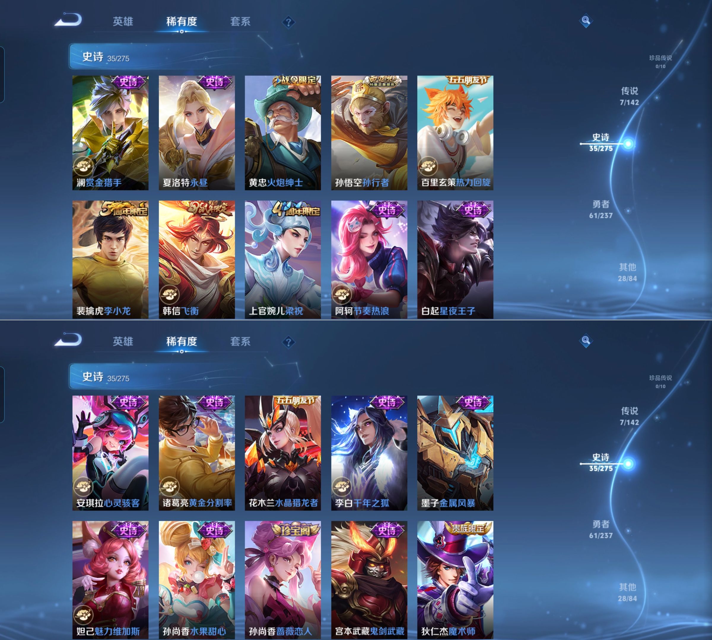 贵族等级:v7皮肤数:132传说品质7 生肖限定2 英雄数:127