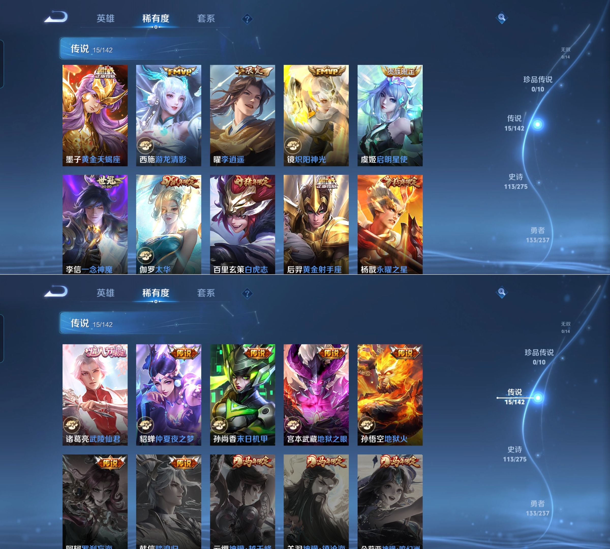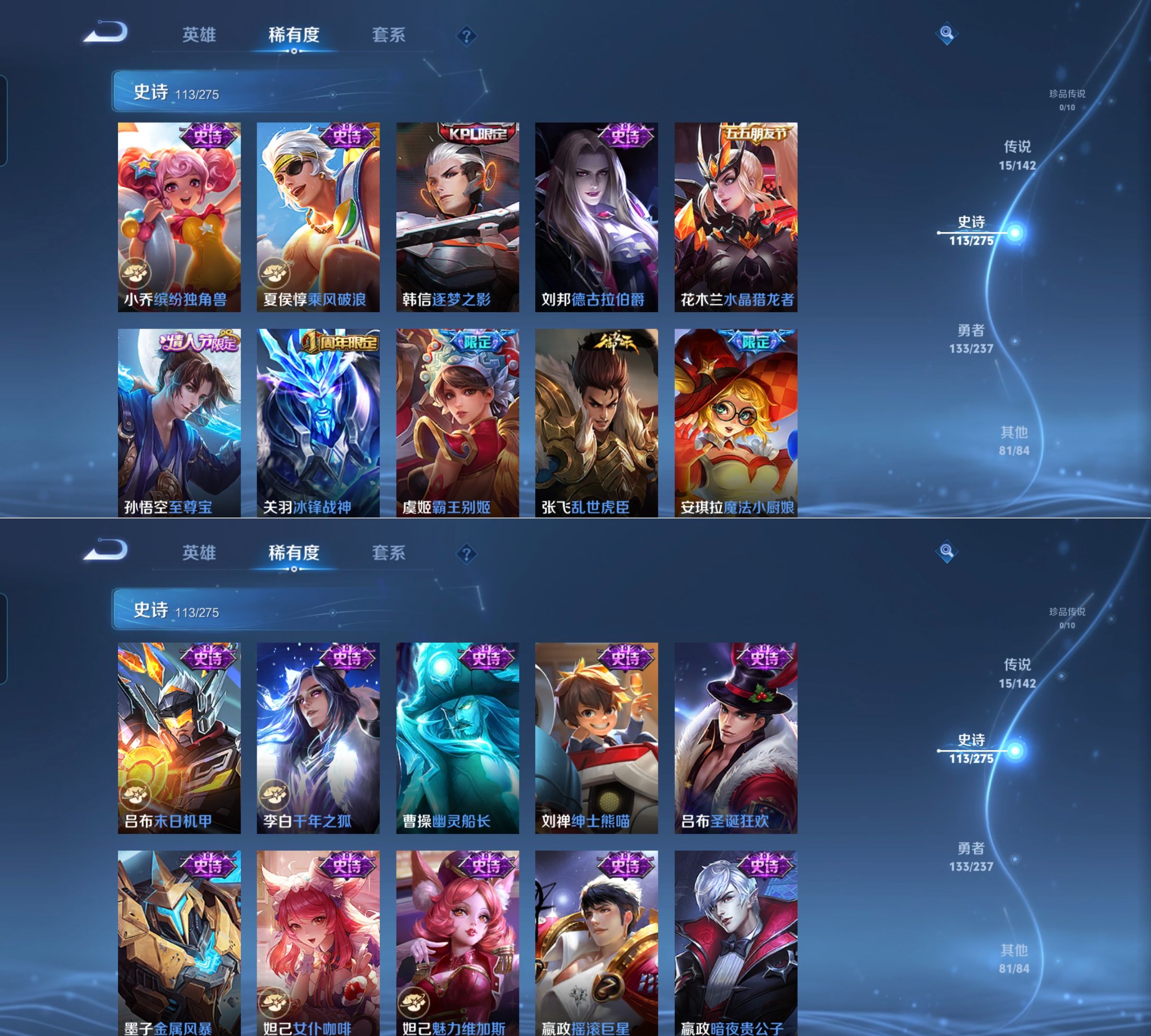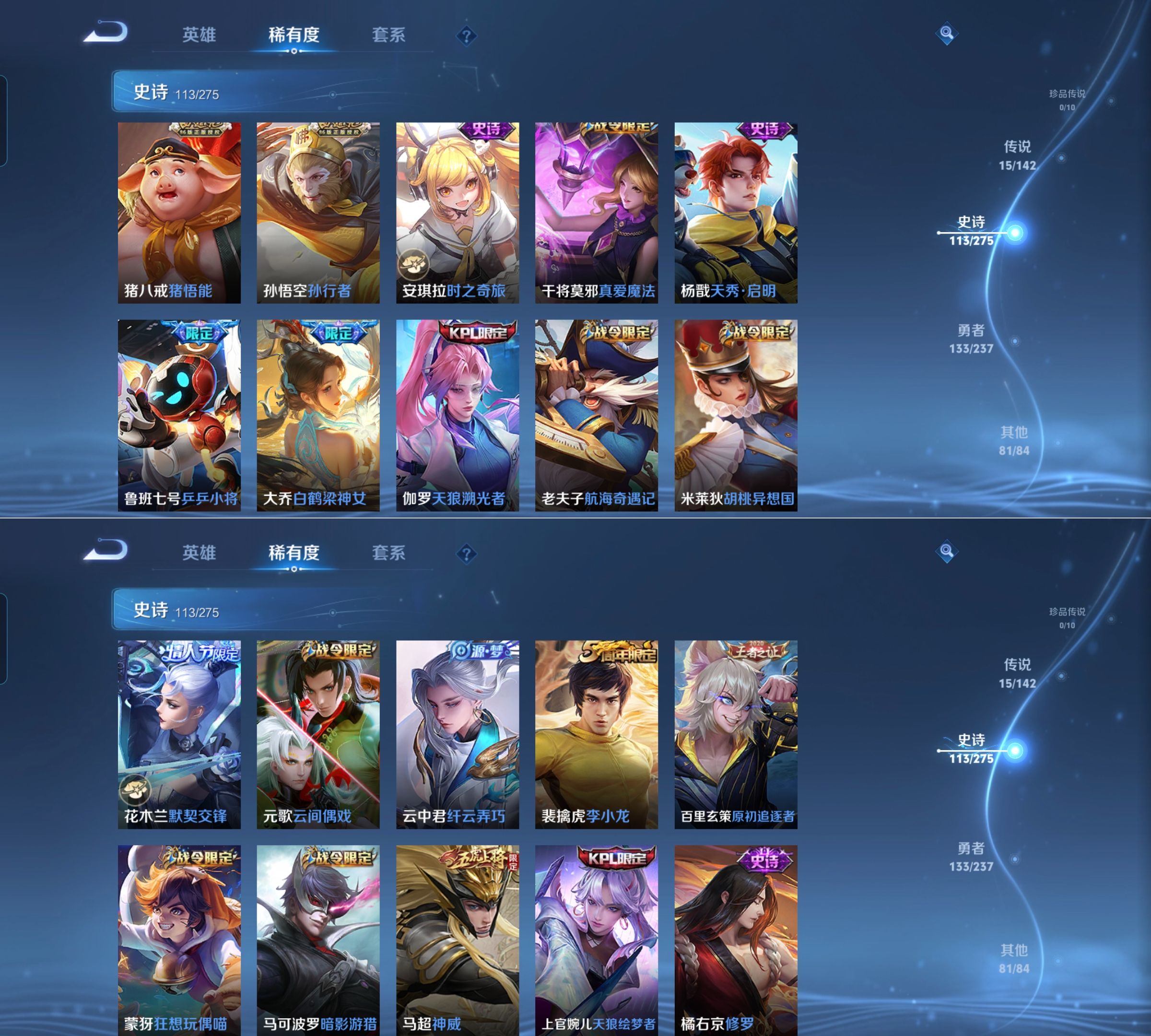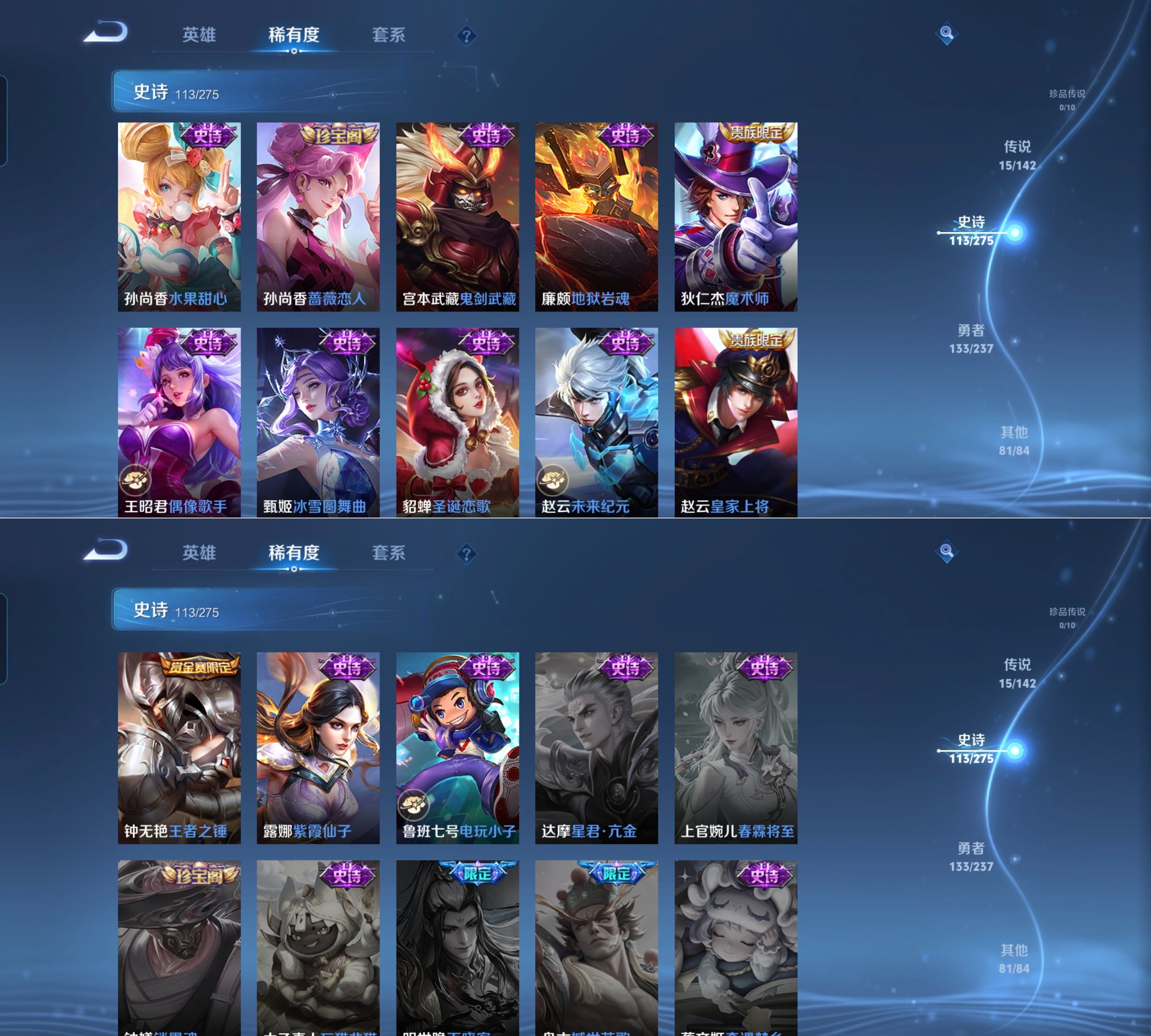 贵族等级:v9皮肤数:344生肖限定7 传说品质15 情人节限定4 荣耀典藏2 英雄数:127