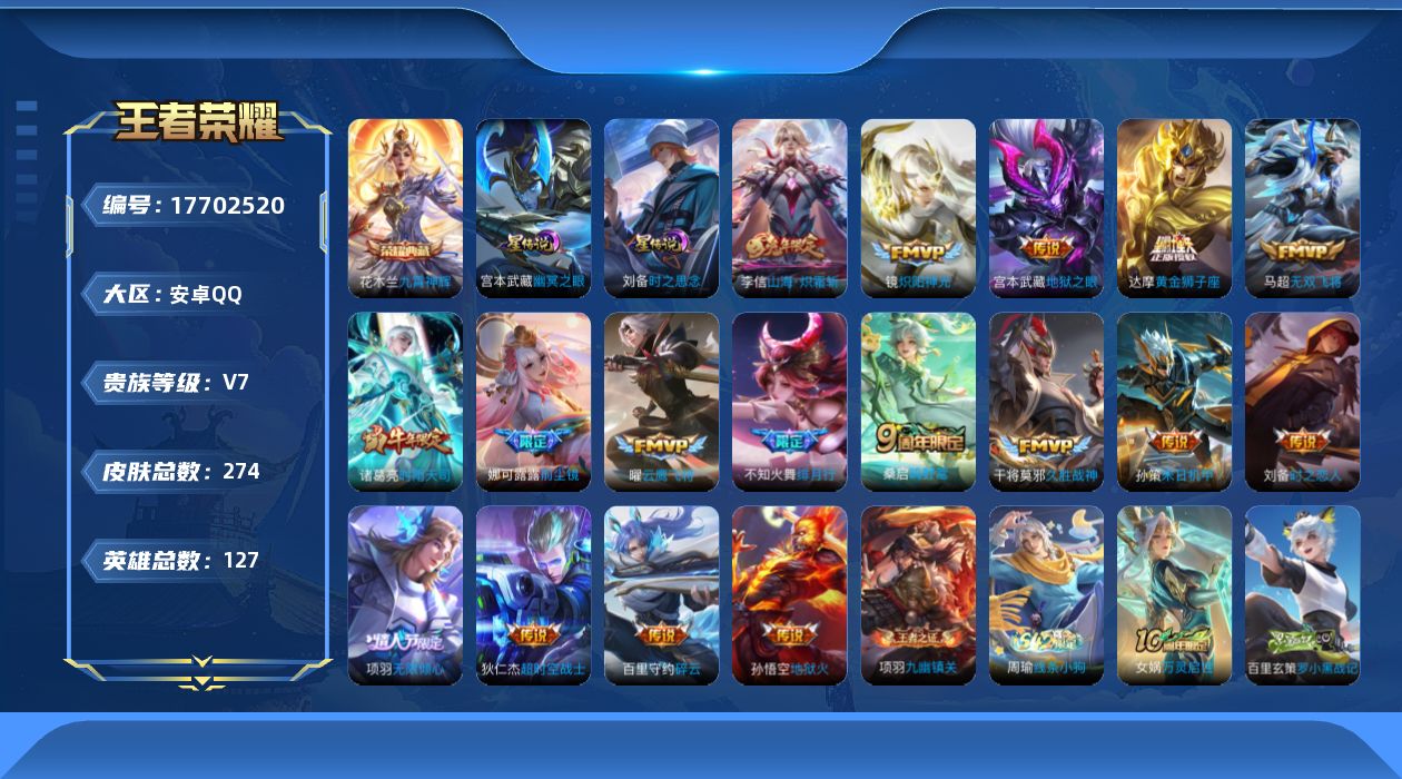 贵族等级:v7皮肤数:274传说品质17 生肖限定4 荣耀典藏1 情人节限定2 英雄数:127