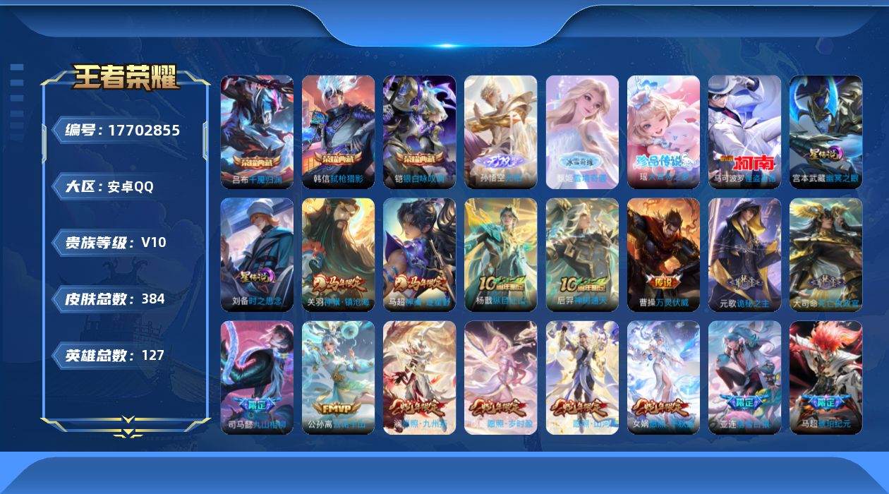 贵族等级:v10皮肤数:384传说品质69 生肖限定11 情人节限定1 无双2 荣耀典藏3 珍品传说2 英雄数:127