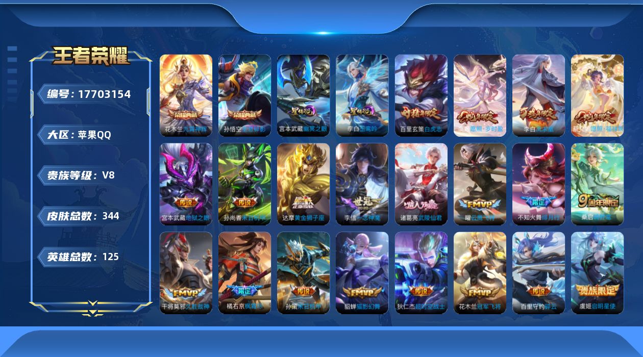 贵族等级:v8皮肤数:344传说品质21 情人节限定5 荣耀典藏2 生肖限定7 英雄数:125