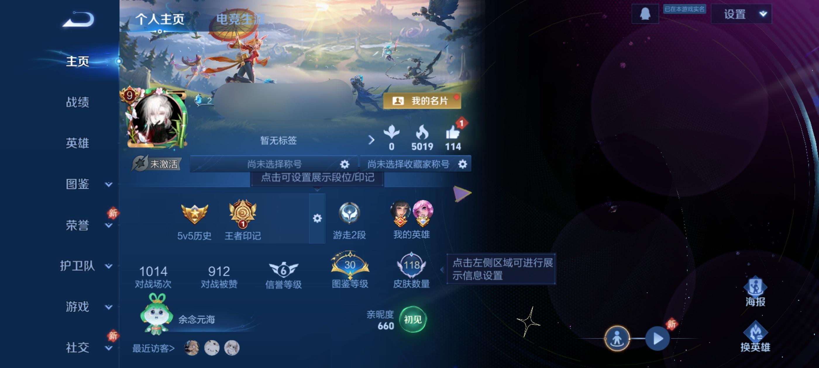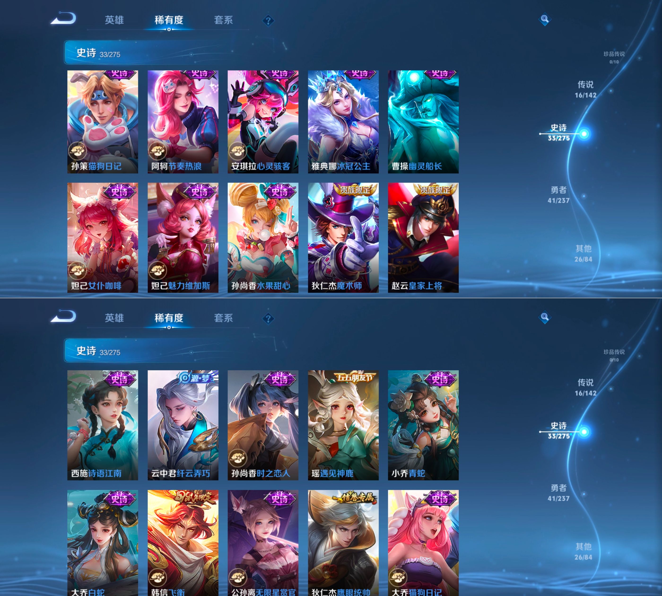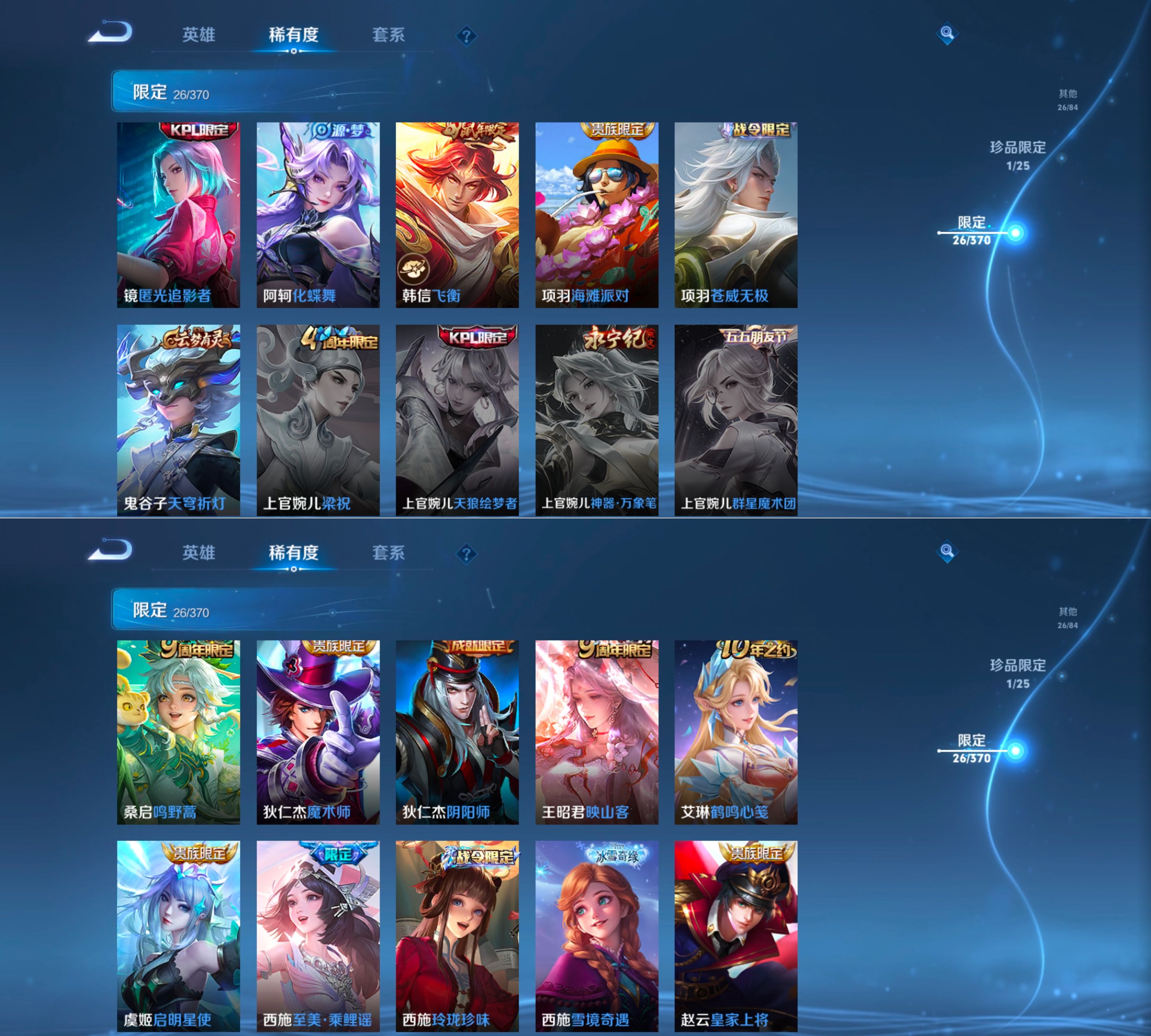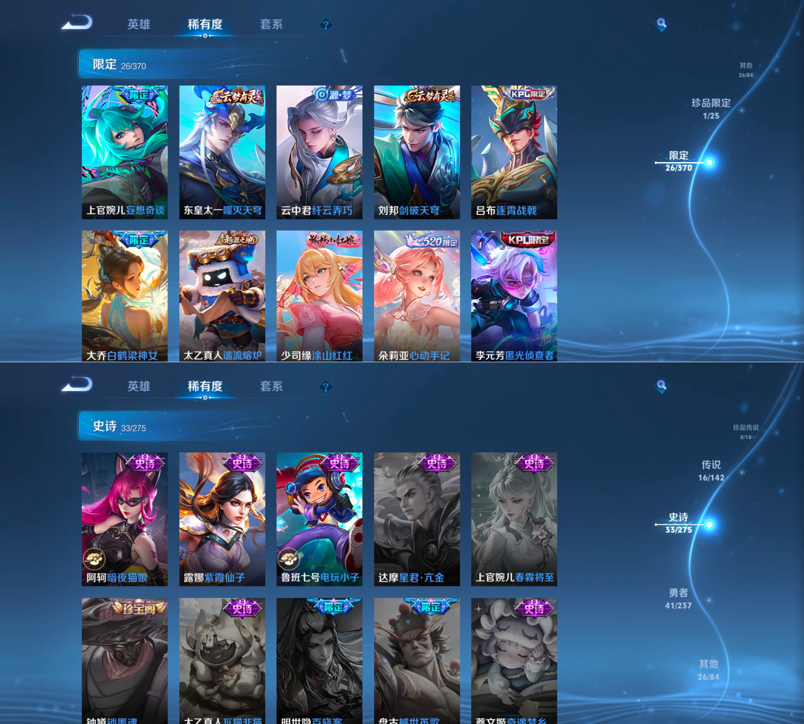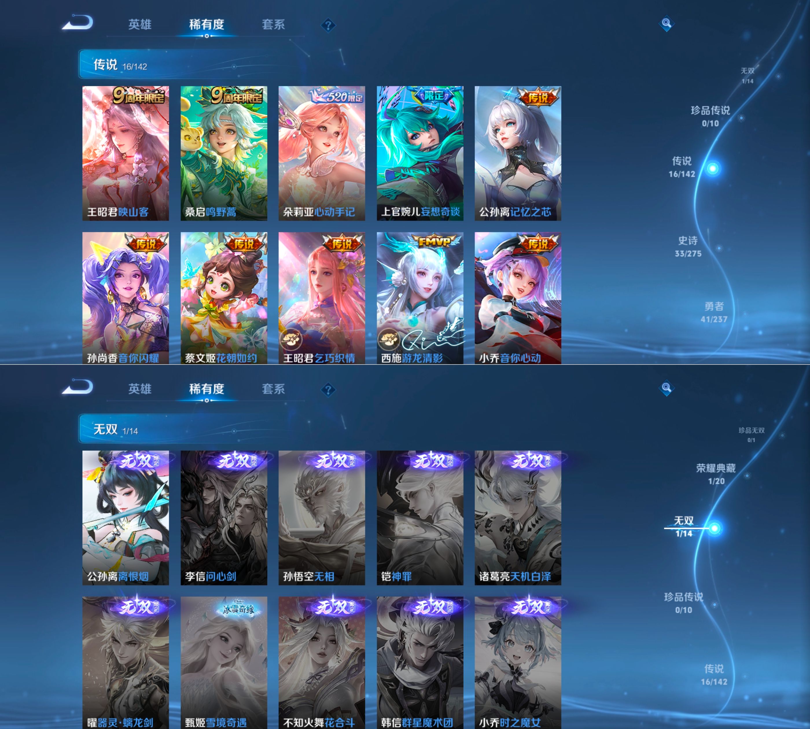 贵族等级:v9皮肤数:118传说品质16 荣耀典藏1 无双1 生肖限定1 英雄数:108